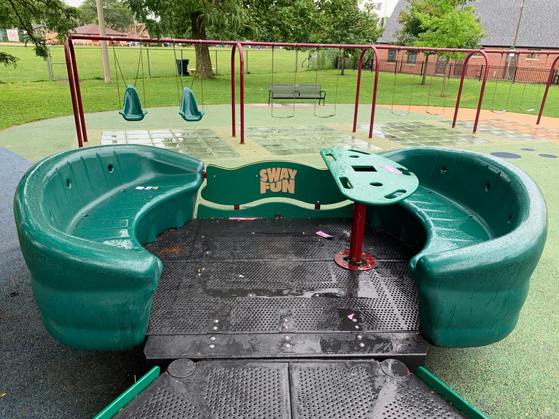 A single pole extends from the ground, dramatically flares into a circular metal base. Above the base, there is rope netting that forms a cylinder with a graceful quarter twist before meeting the circular metal ring that forms the top support. And the entire element rotates along the central pole. Amazing.