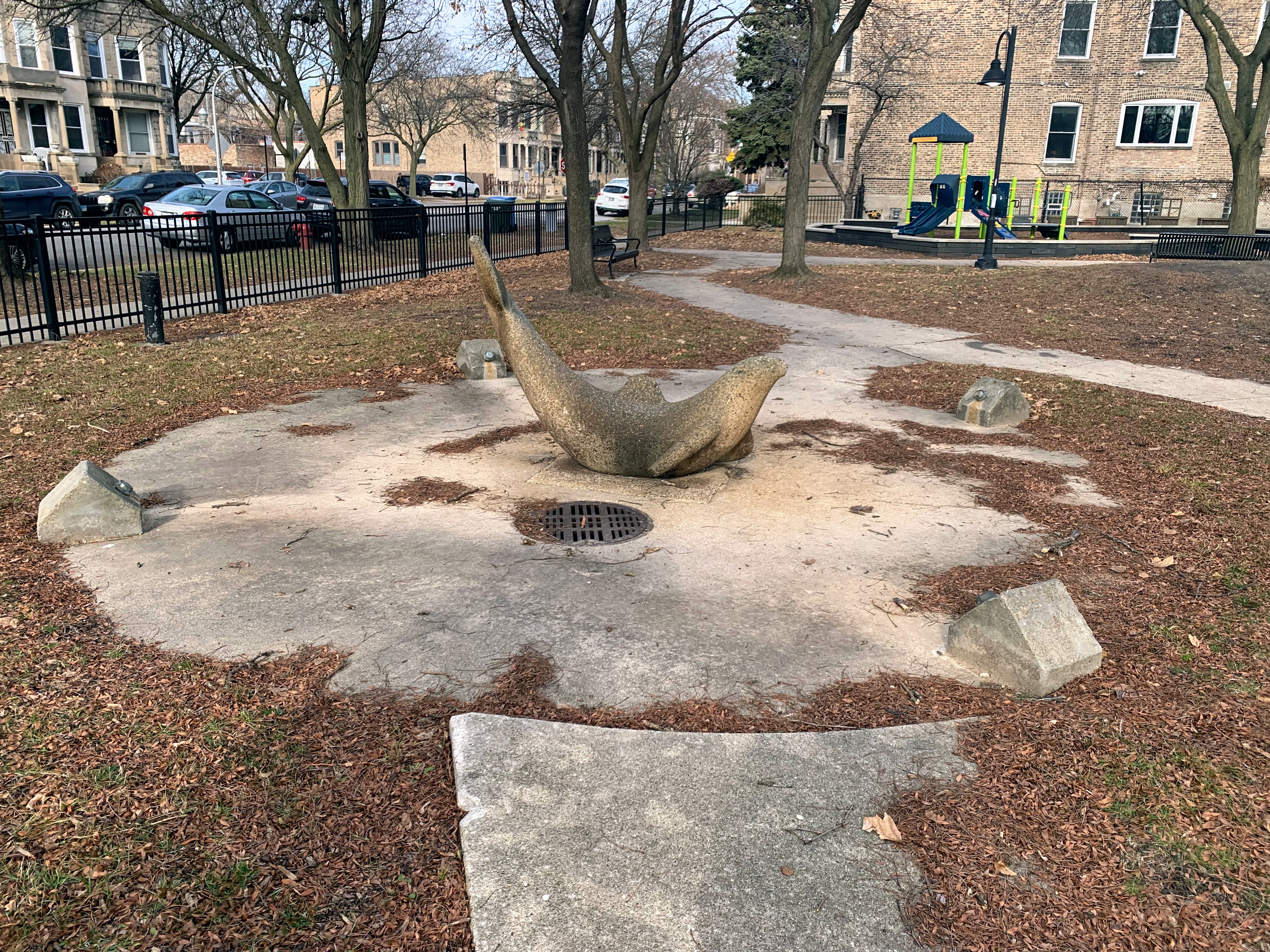 Coleman Park is a small neighborhood park in the middle of a residential block with a great playground and water spray feature. There are two play structures - a smaller one for younger children and a larger one for older children - as well as two sets of swings, a sand play area (with a unique concrete table), and a standard 'four sprayer' with a concrete seal sculpture in the middle. All together, this playground elevates some standard equipment to something better than the sum of its parts.