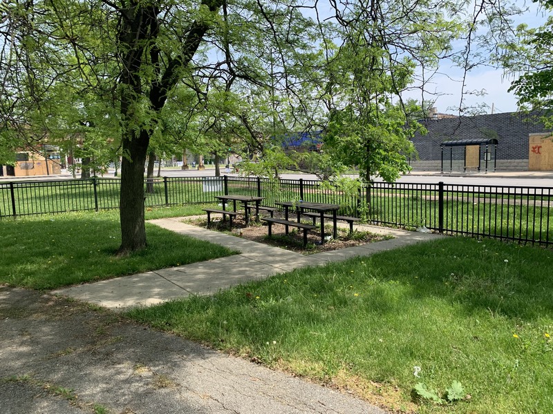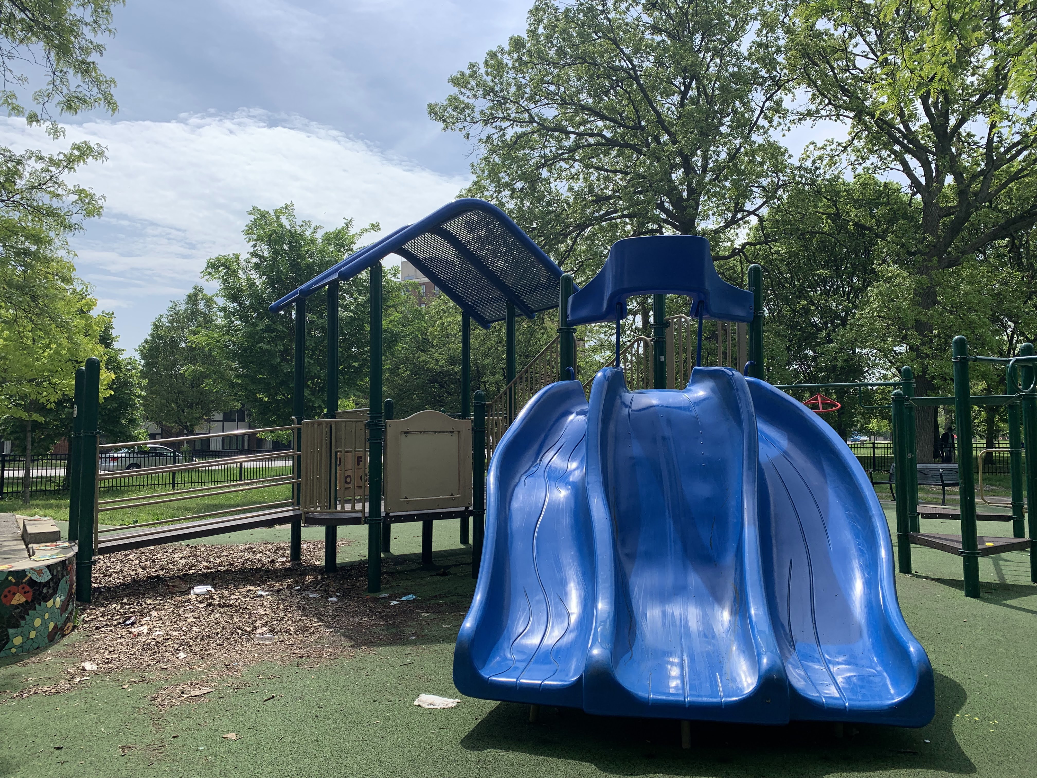 - This playground - one of two in Garfield Park - is located near the northeast corner of the park and features two play structures. The smaller play structure is designed for younger children and features two climbing elements and a slide. The larger play structure is accessible via a ramp and features a large triple slide and a few interactive panels. There are also a number of overhead elements (variations of monkey bars) and traversing elements near the larger play structure. A small swing set completes the play elements in this small playground. The play area is fenced from the street but is not fully enclosed and the play surface is soft rubber. A few benches and tree provide some seating and shade and a drinking fountain and a couple of picnic tables round out the other amenities.