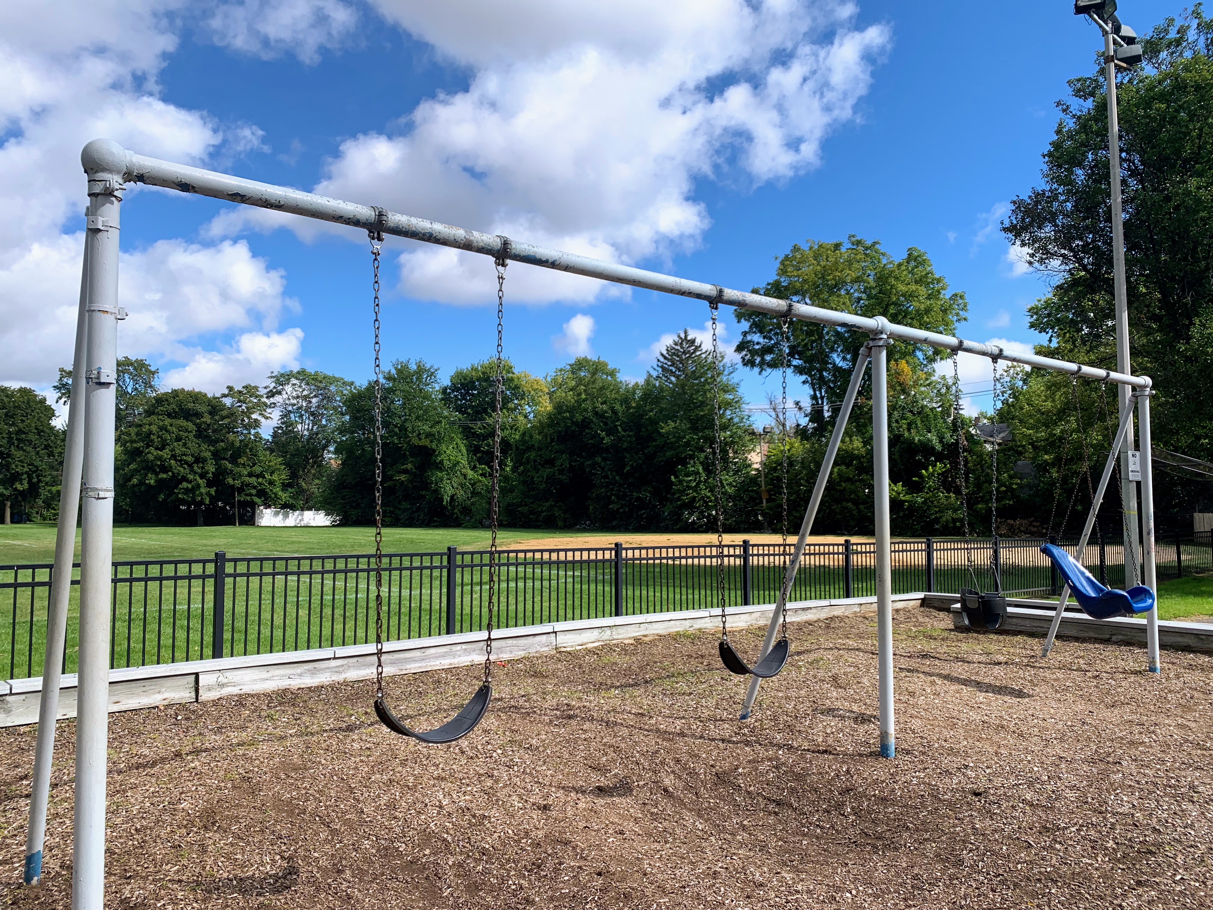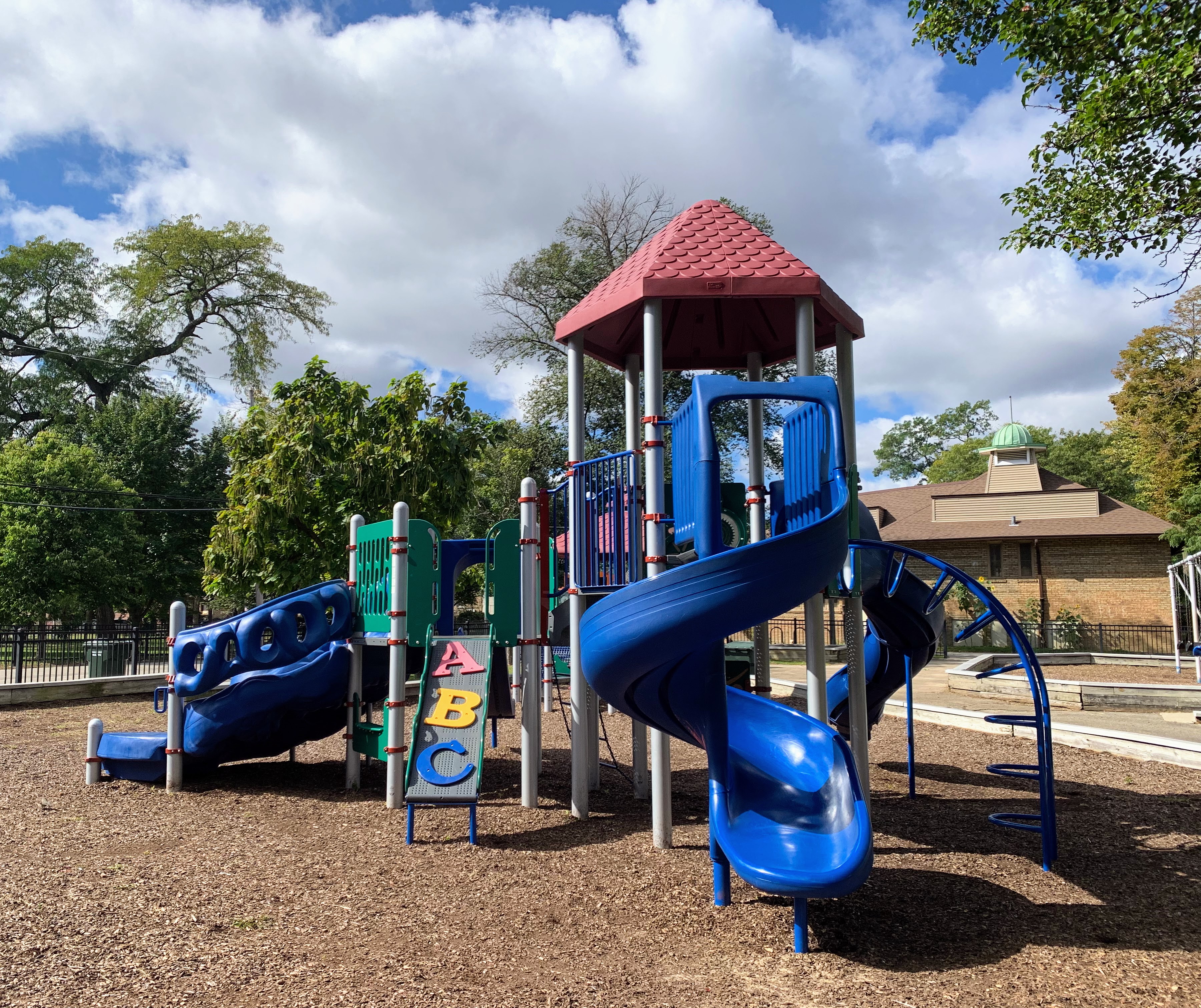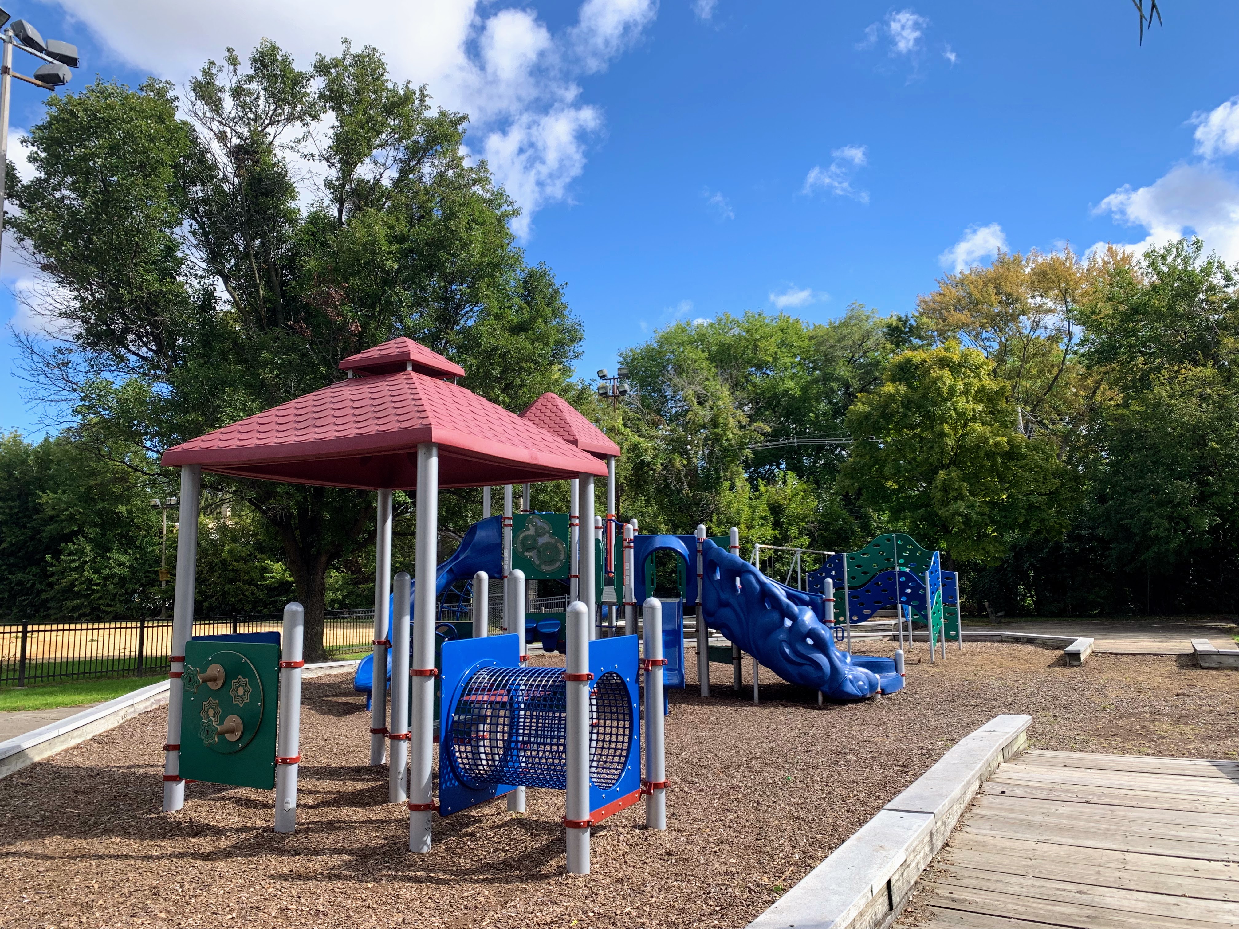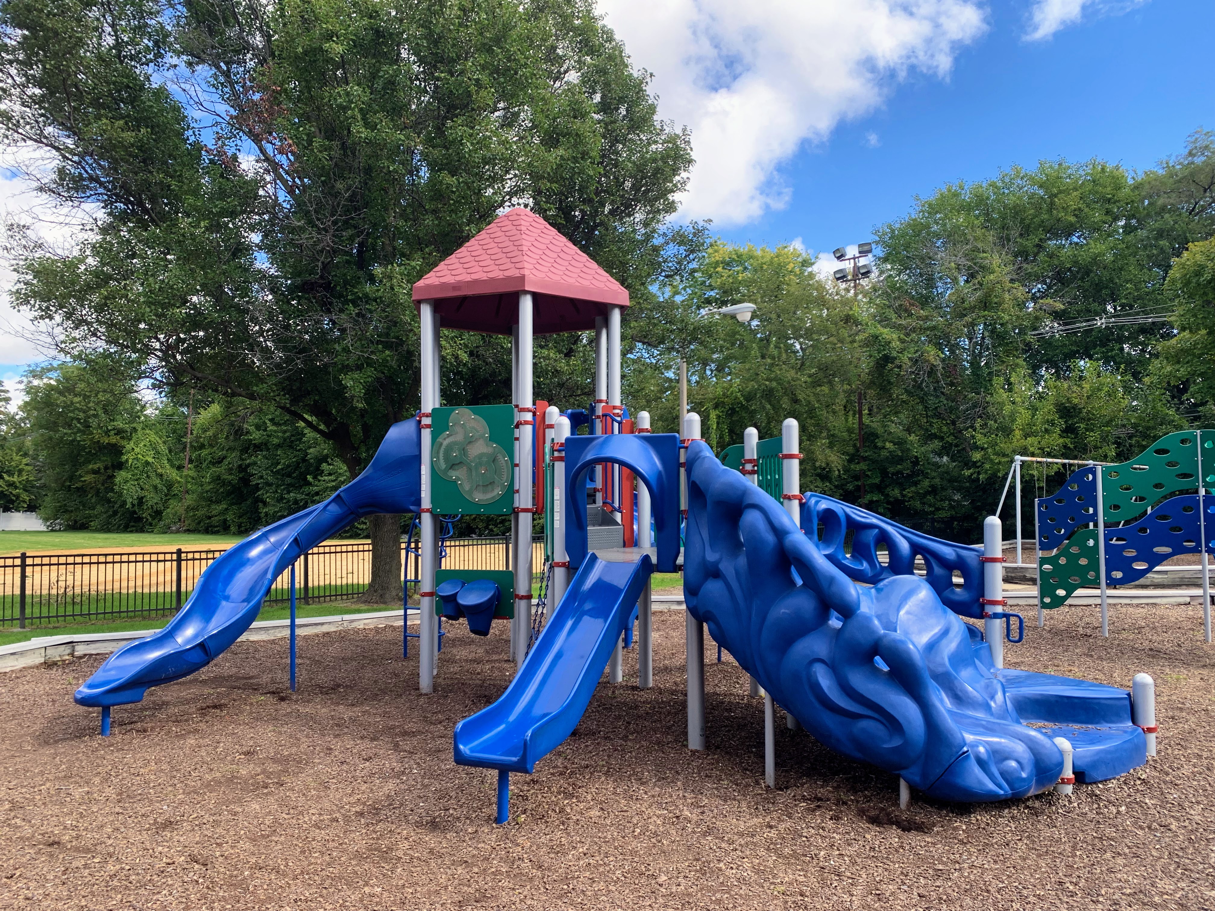 Graver Park features a nice playground, water spray area, and picnic area in a quiet setting. The playground - named the Barbara Vick playground - includes a moderate sized play structure with a variety of slides and climbing elements, two set of swings (toddler, adaptive, and belt seat), and a few standalone elements. The main play surface is wood chips and there is a sand box. A short distance away is a large water spray area with a variety of water elements and - next to that - is an area with several picnic tables. There is also a fieldhouse that should provide access to bathrooms (when open). Both the playground and water spray area are fully enclosed. Additional seating and shade would improve this site, but it is still a great play area; highly recommend.
