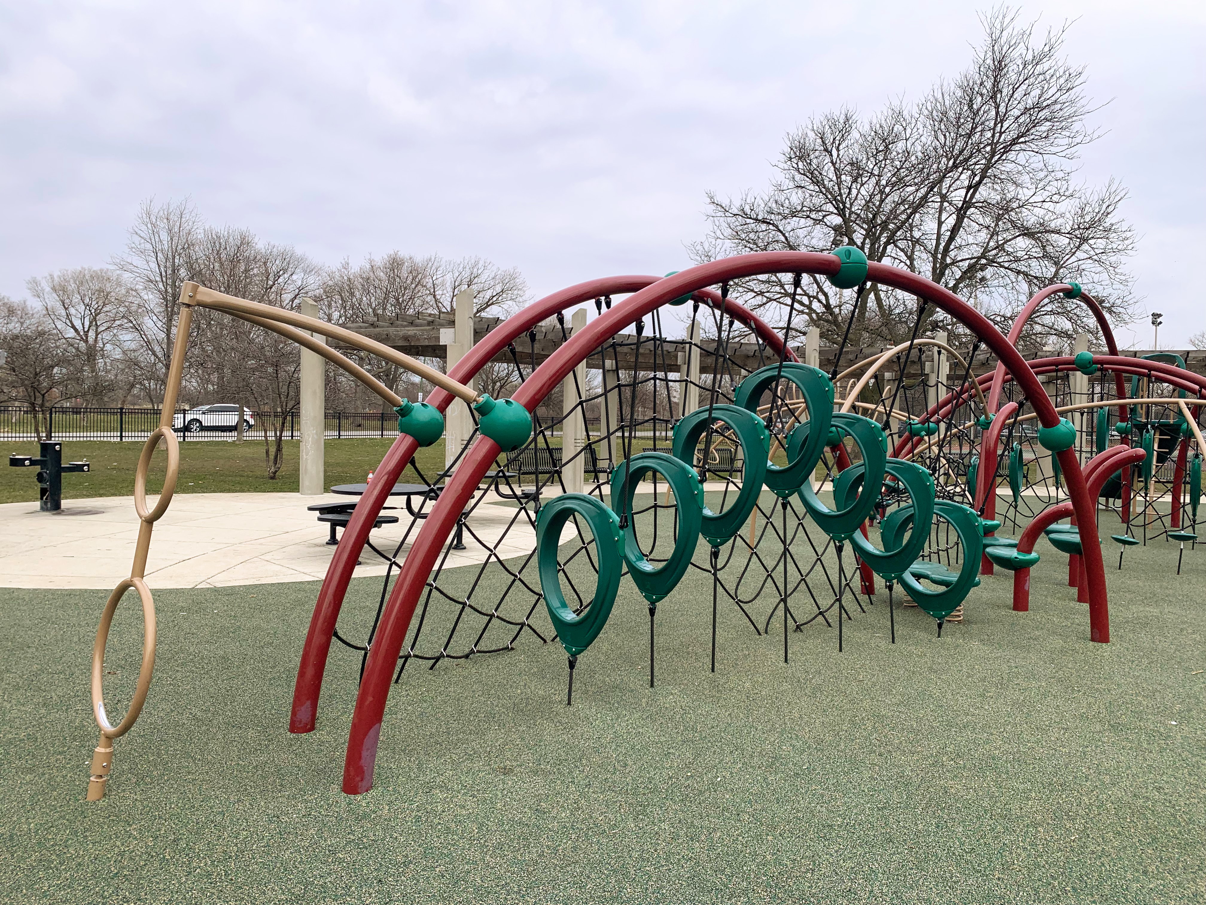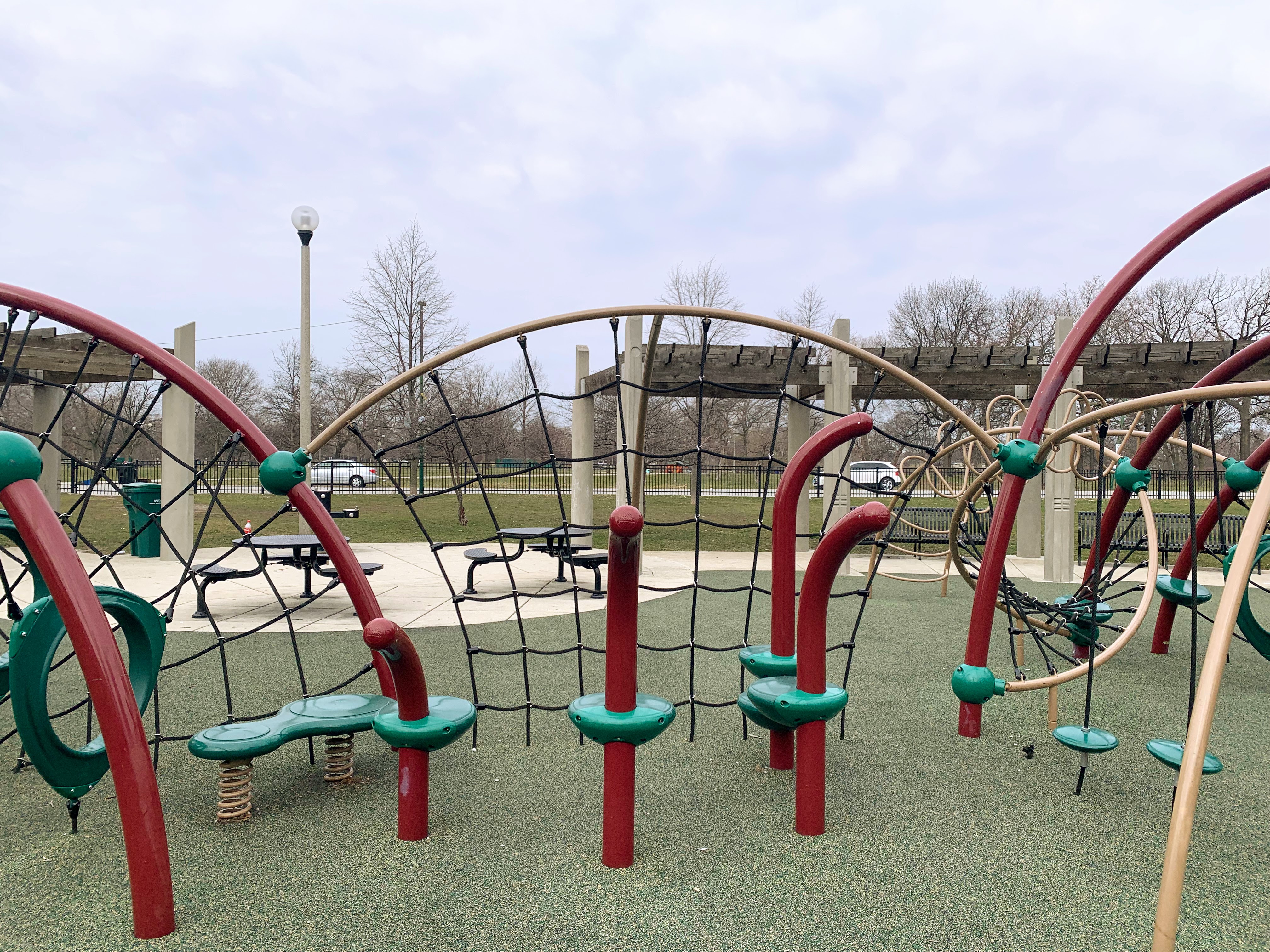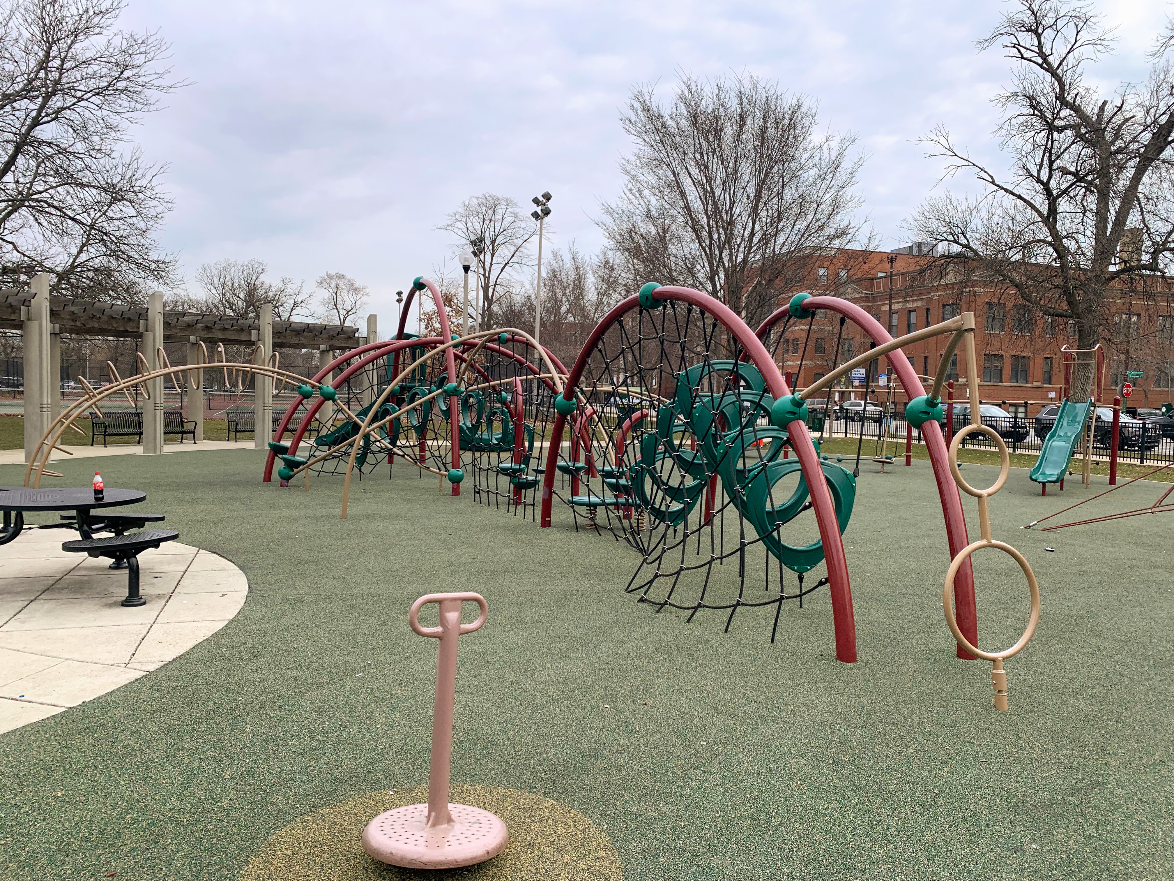- This playground - one of 5 in Humboldt Park! - is located off California on the eastern edge of the park and is a gem. There is a small, traditional play structure for younger children and then a massive collection of unconventional climbing elements for older children. There is also the standard swing set: toddler, adaptive, and belt seat. The play area is fully enclosed and features a soft rubber surface. There are benches and two picnic tables as well as a drinking fountain. This is a great playground; highly recommend.