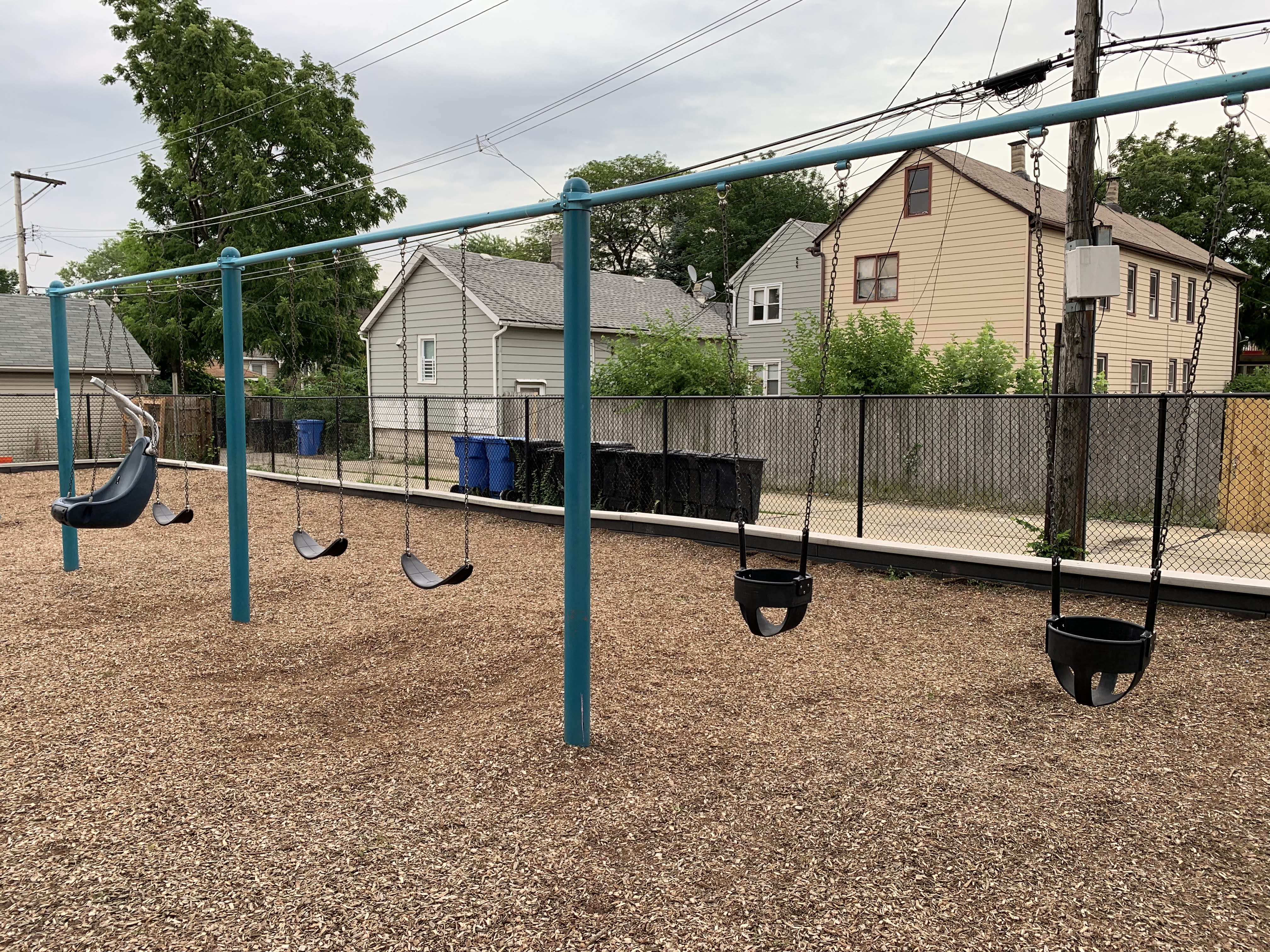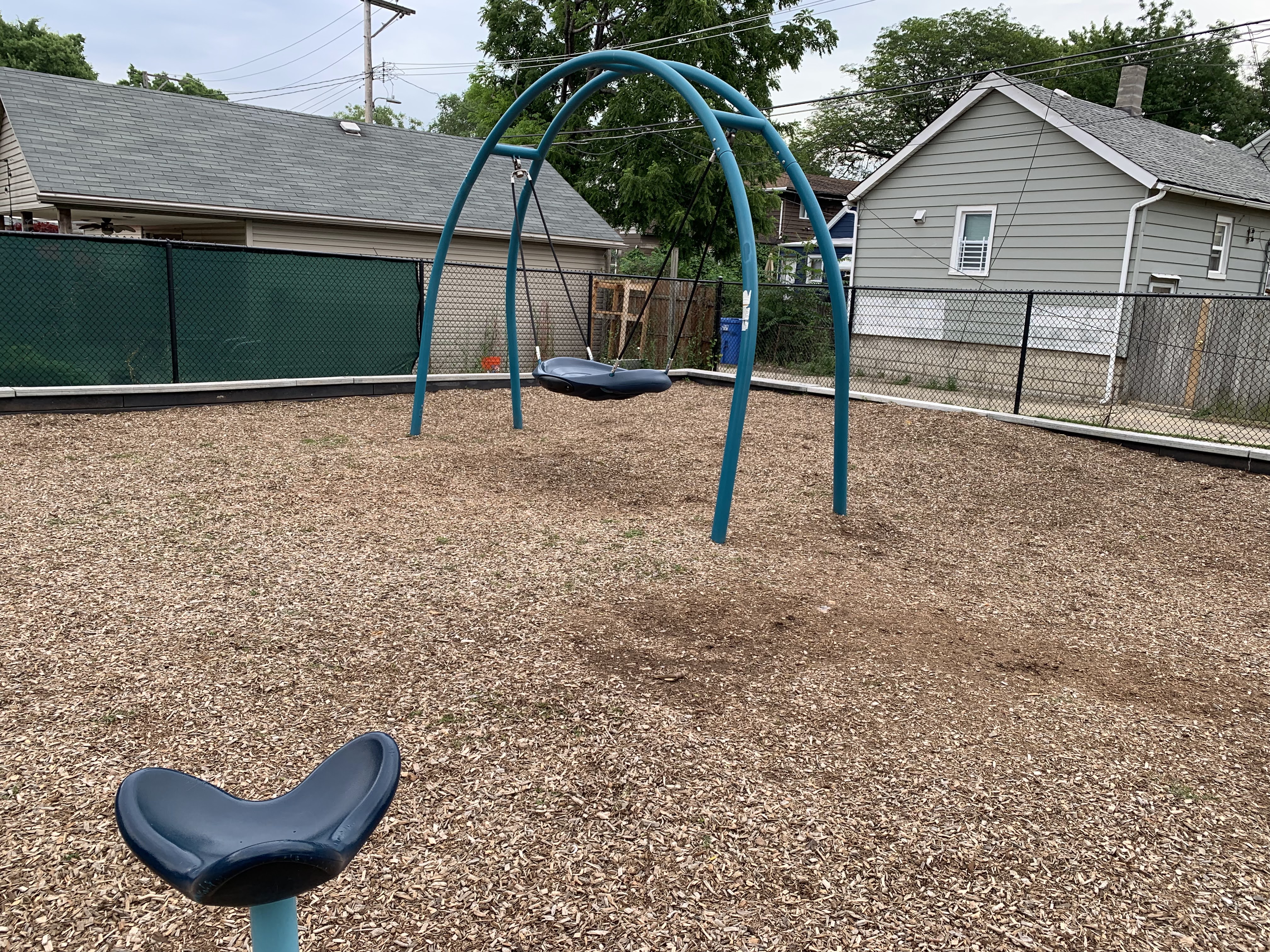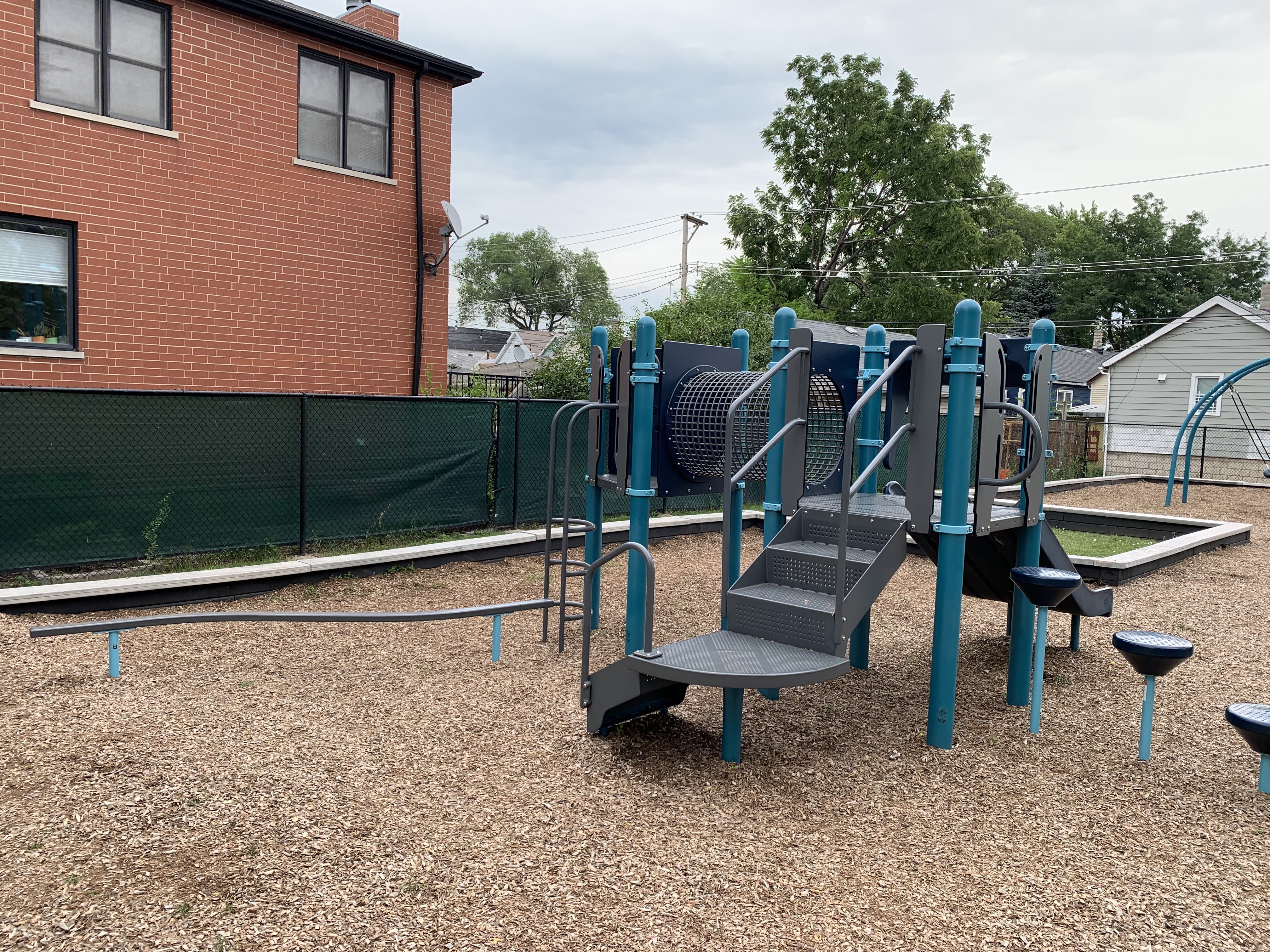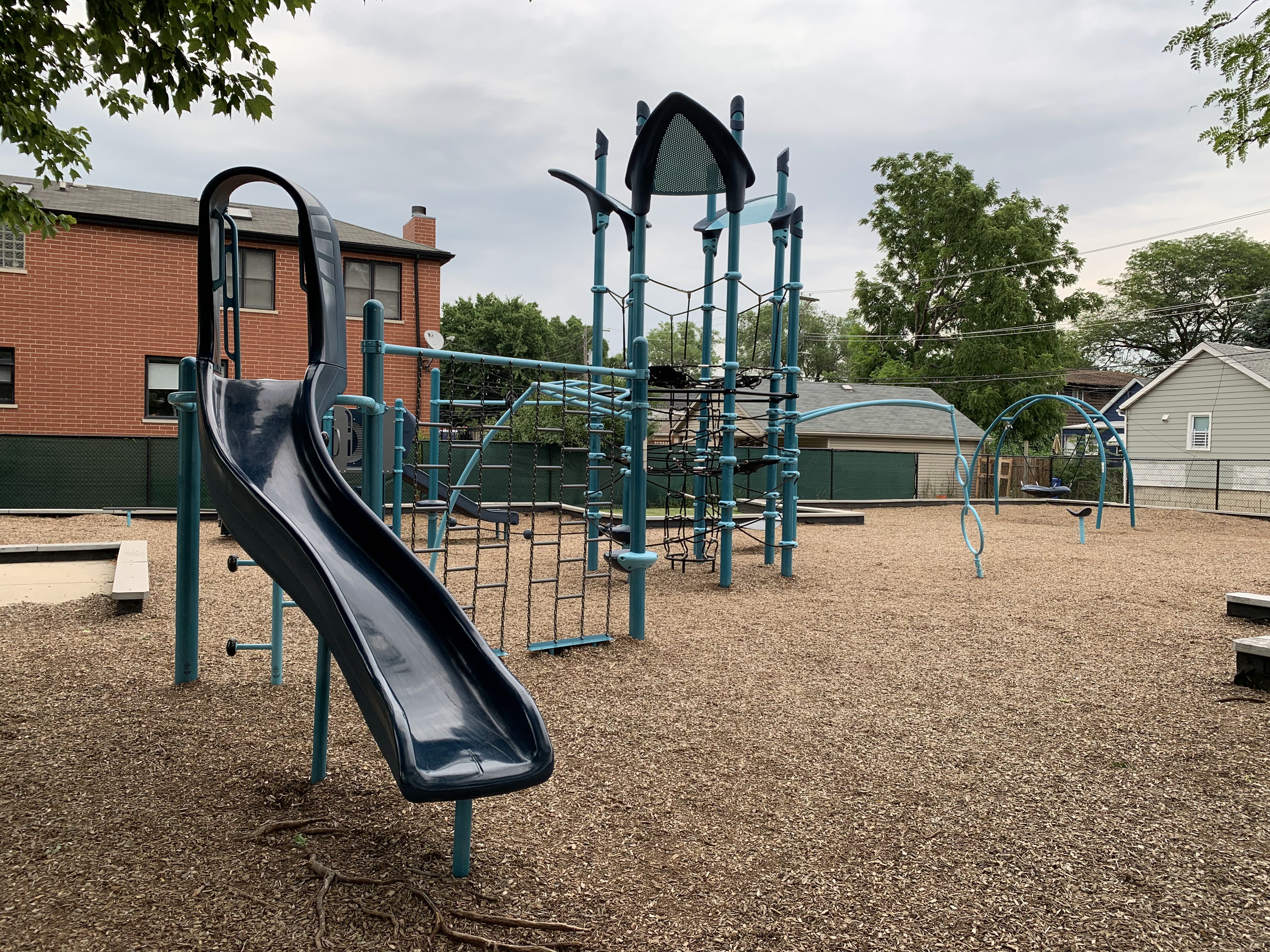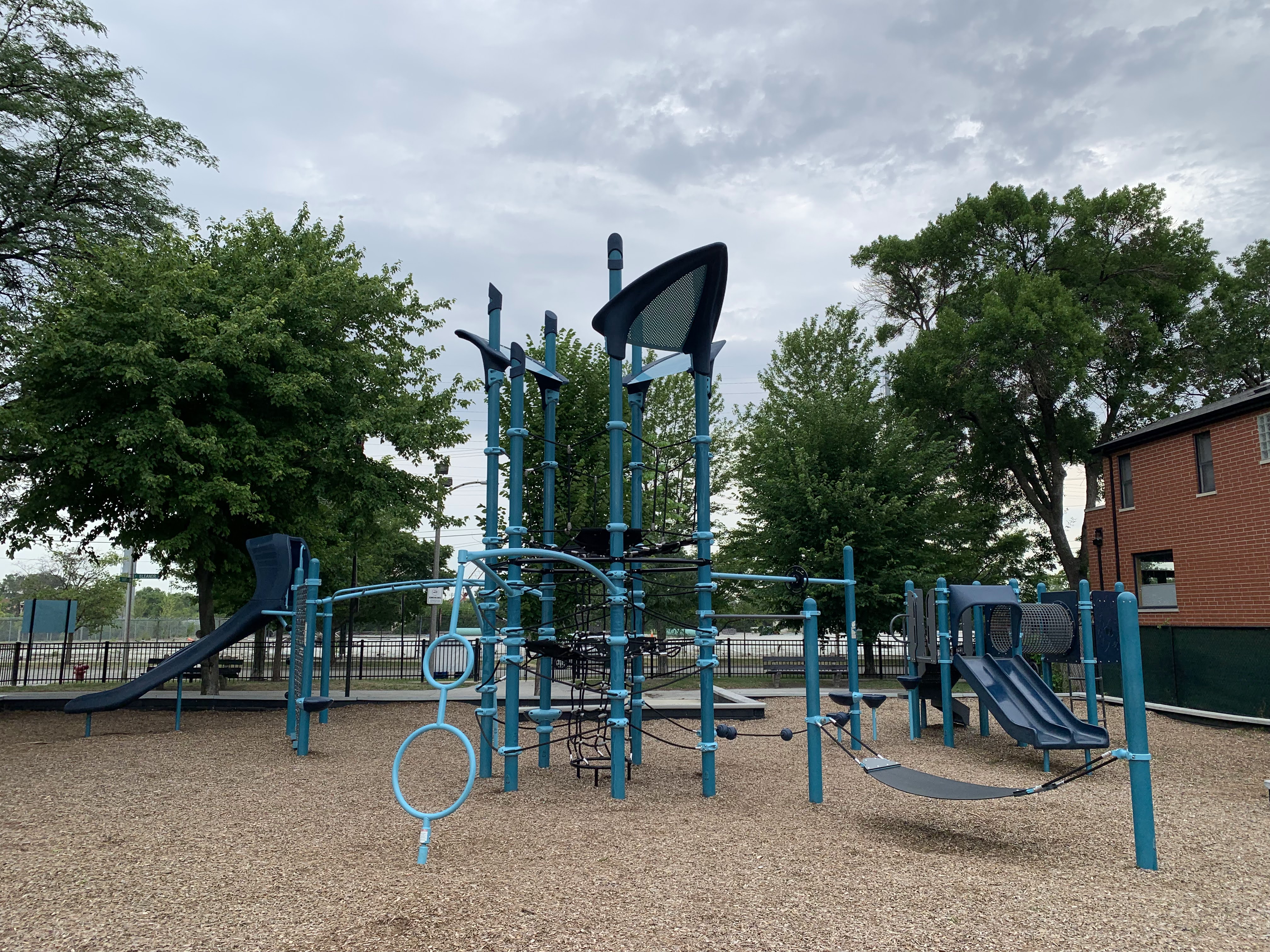 In terms of amenities, this is pretty standard. The play area is fenced from the street but not fully enclosed and the play surface is wood chips. There are benches and a drinking fountain as well as a few trees (though the play area itself is bright and sunny most of the day). All in all, this is a standard neighborhood playground. - Playground Equipment