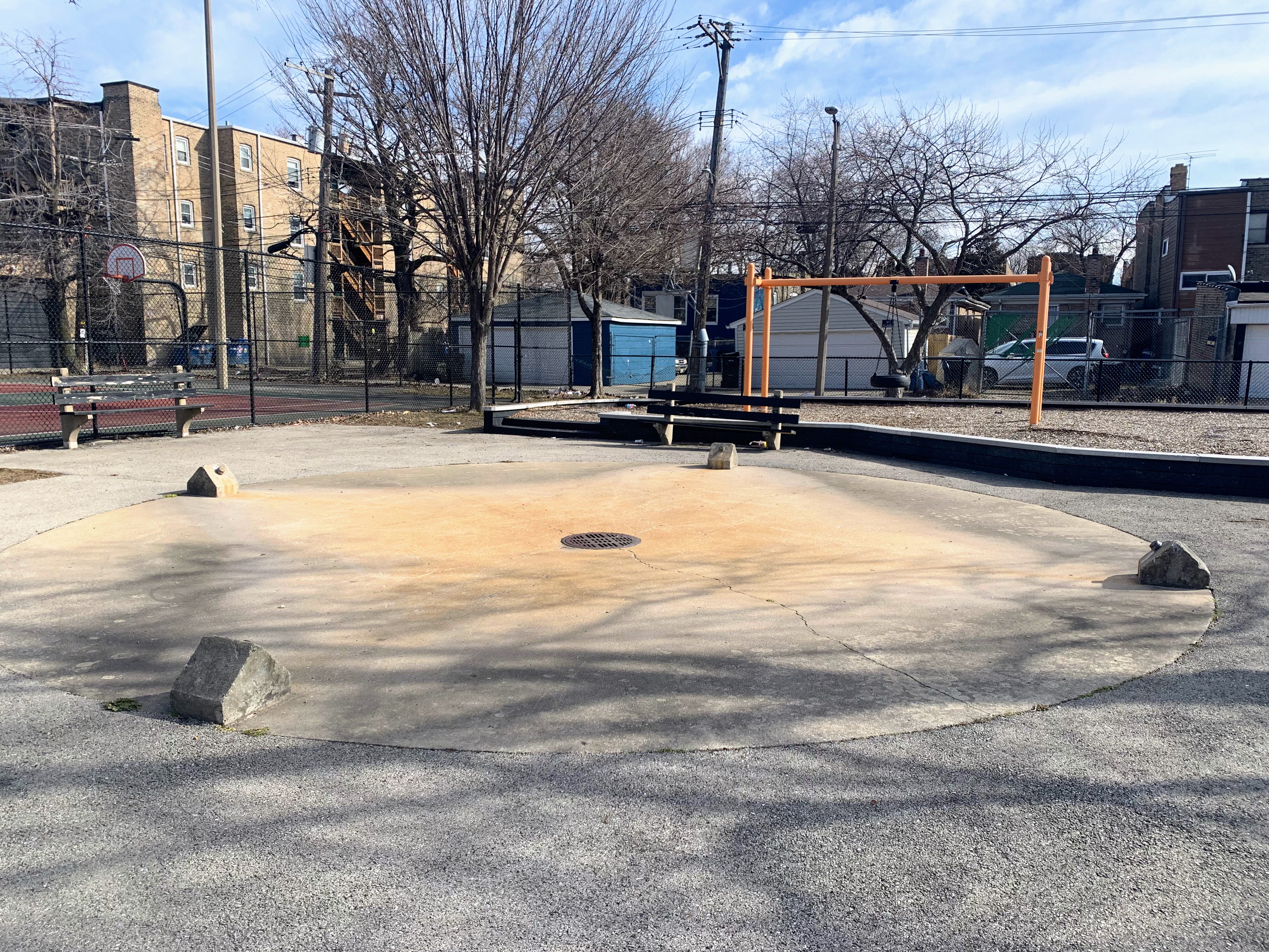 - Linden Park is a small park with a basketball court, playground, and water spray feature. The playground, last renovated in 2014, includes a large and sprawling set of equipment with bright neon colors. There is also a large set of swings (toddler, adaptive, belt seat, and a tire swing) and the water spray feature is a basic 'four sprayer.' The non-play amenities are standard: a few benches around a play area with a wood chip surface.