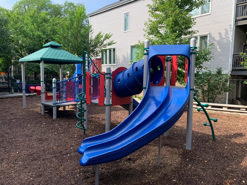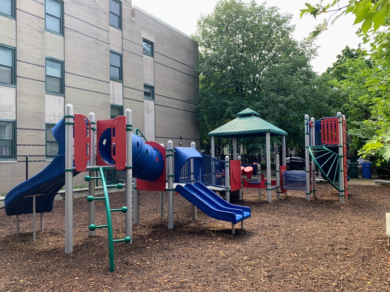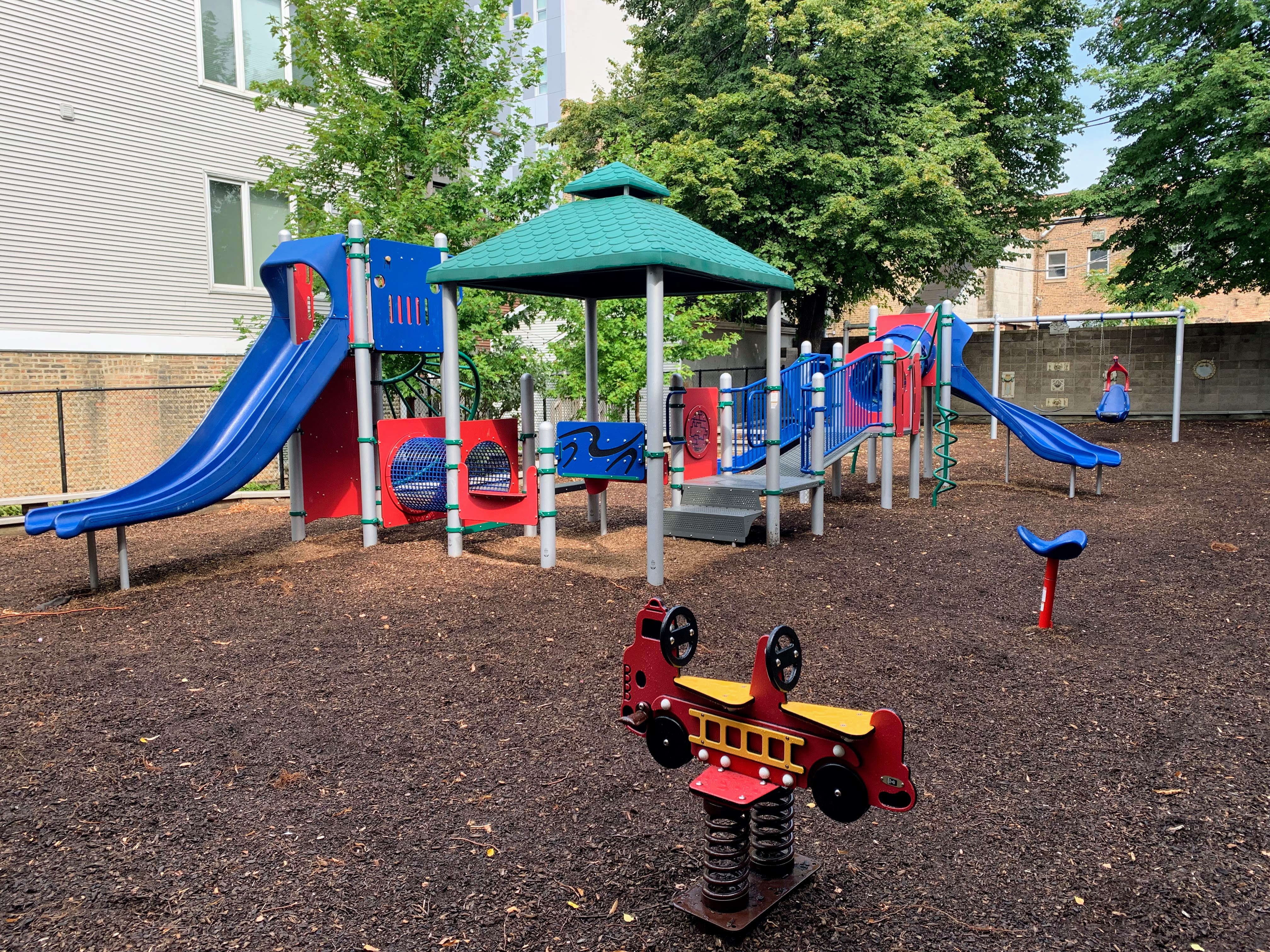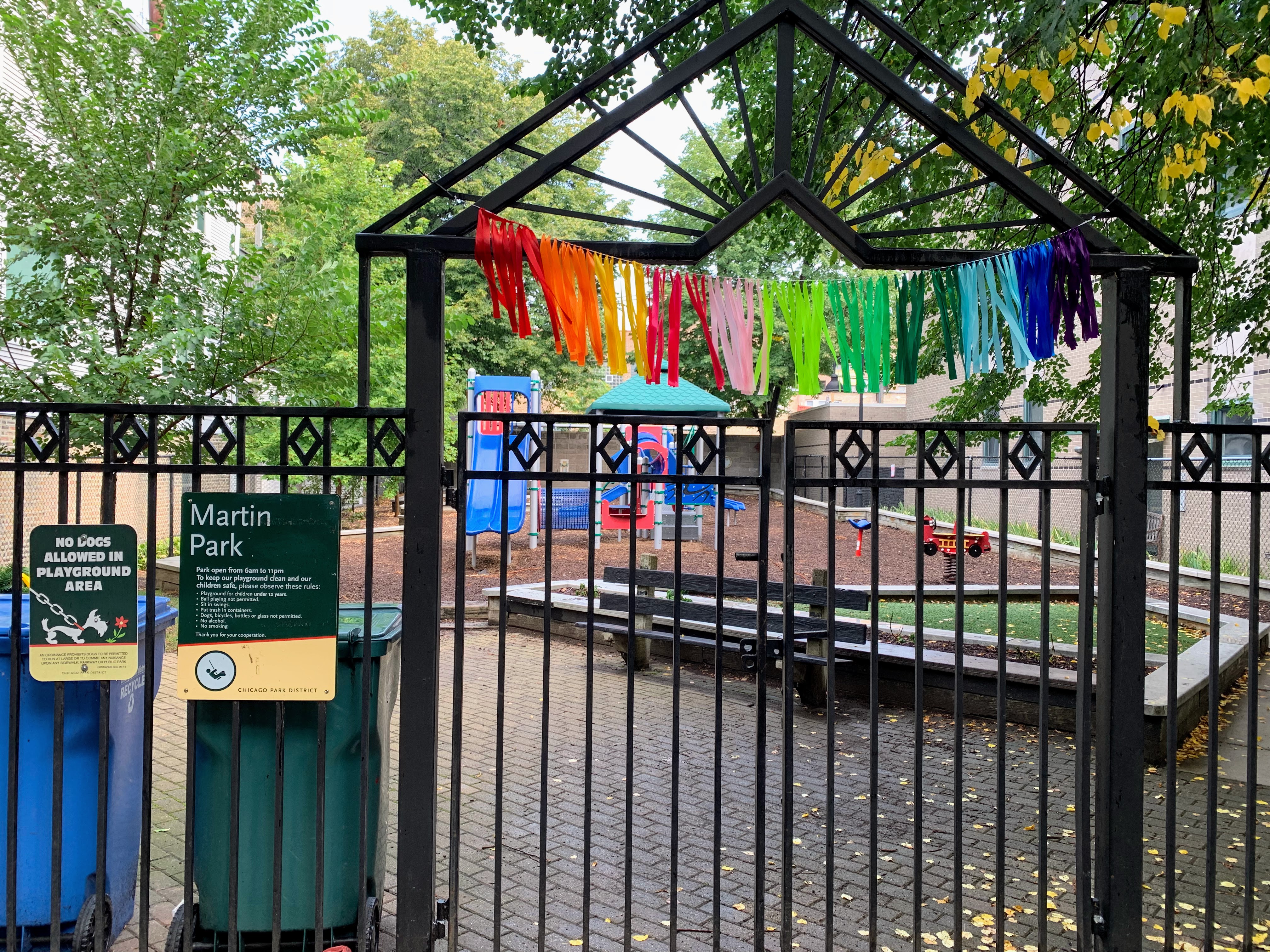 - Martin Park contains a solid neighborhood playground. There is the standard set of swings (toddler, adaptive with harness, and belt seat) and a play structure with a few slides and climbing elements. The play area is fully enclosed and the play surface is wood chips. There is a bench and low perimeter walls provide additional informal seating. All in all, this is a solid neighborhood playground for younger children.