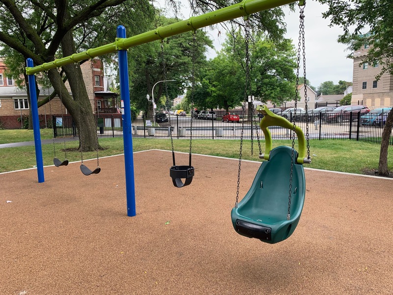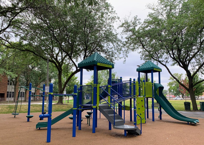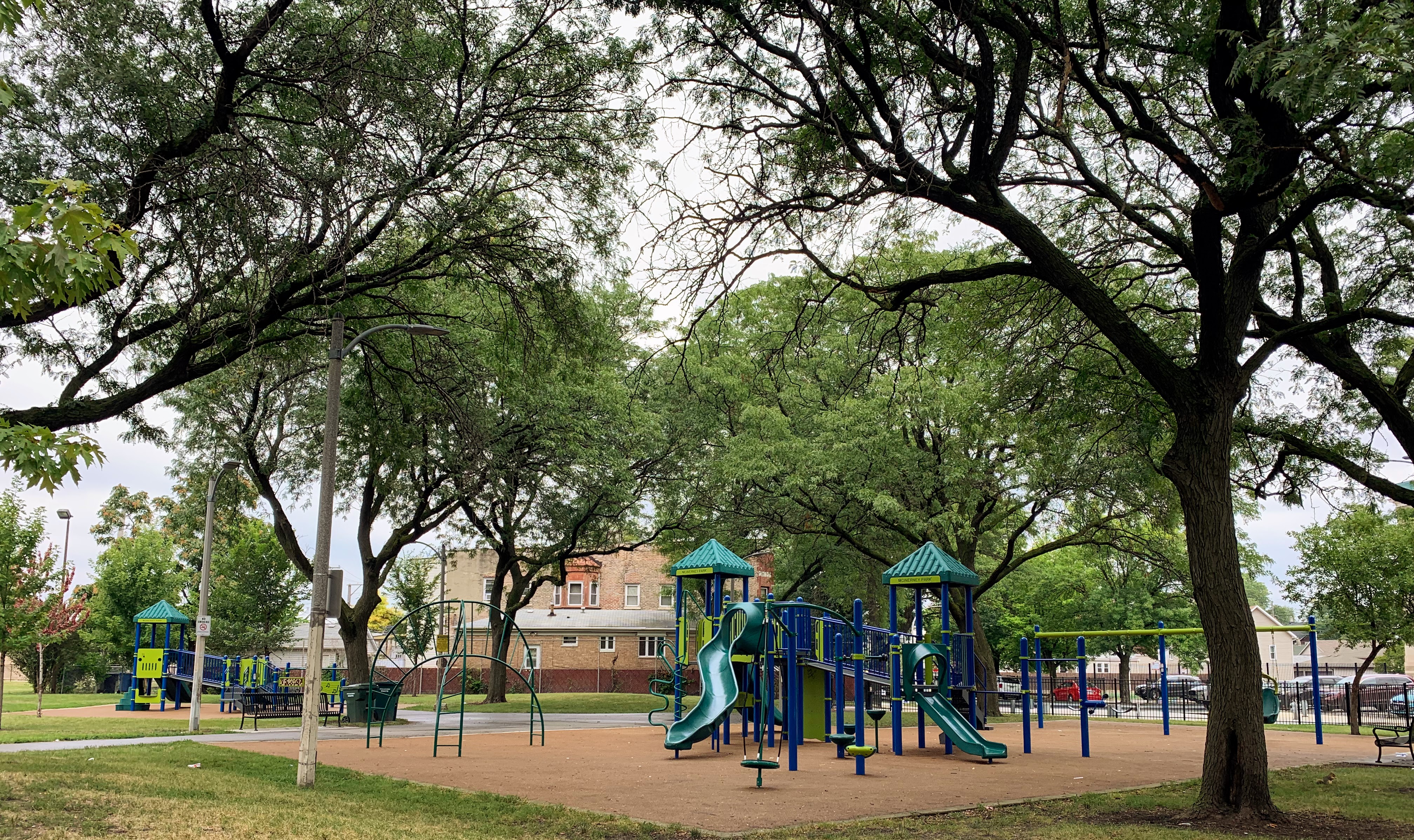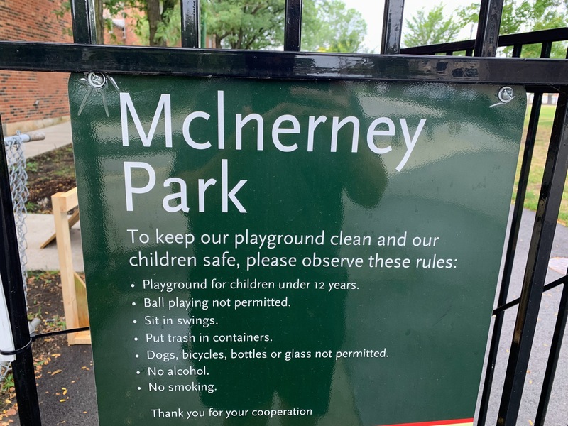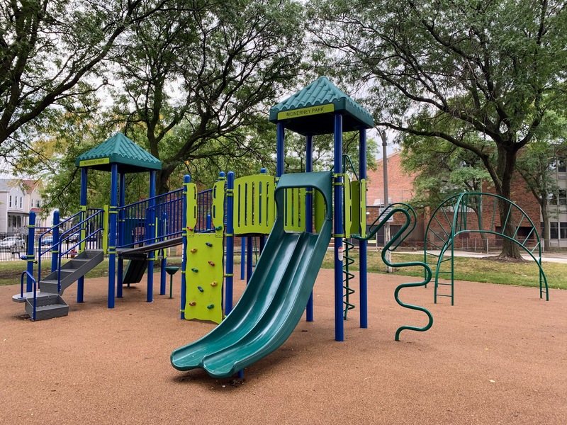 - McInerney Park features a nice playground shaded by large, mature trees. There are two separate areas - one with a smaller structure for younger children and the other with a larger structure for older children - and a small set of swings. Both structures are relatively large and offer a variety of options for park-goers. The play area is fenced from the street but not fully enclosed and opens directly into the rest of McInerney Park. The play surface is soft rubber and there are benches and trees for seating and shade. There is nothing particularly noteworthy or novel about this playground; it's just a solid neighborhood playground in the best sense of the term. Highly recommend.