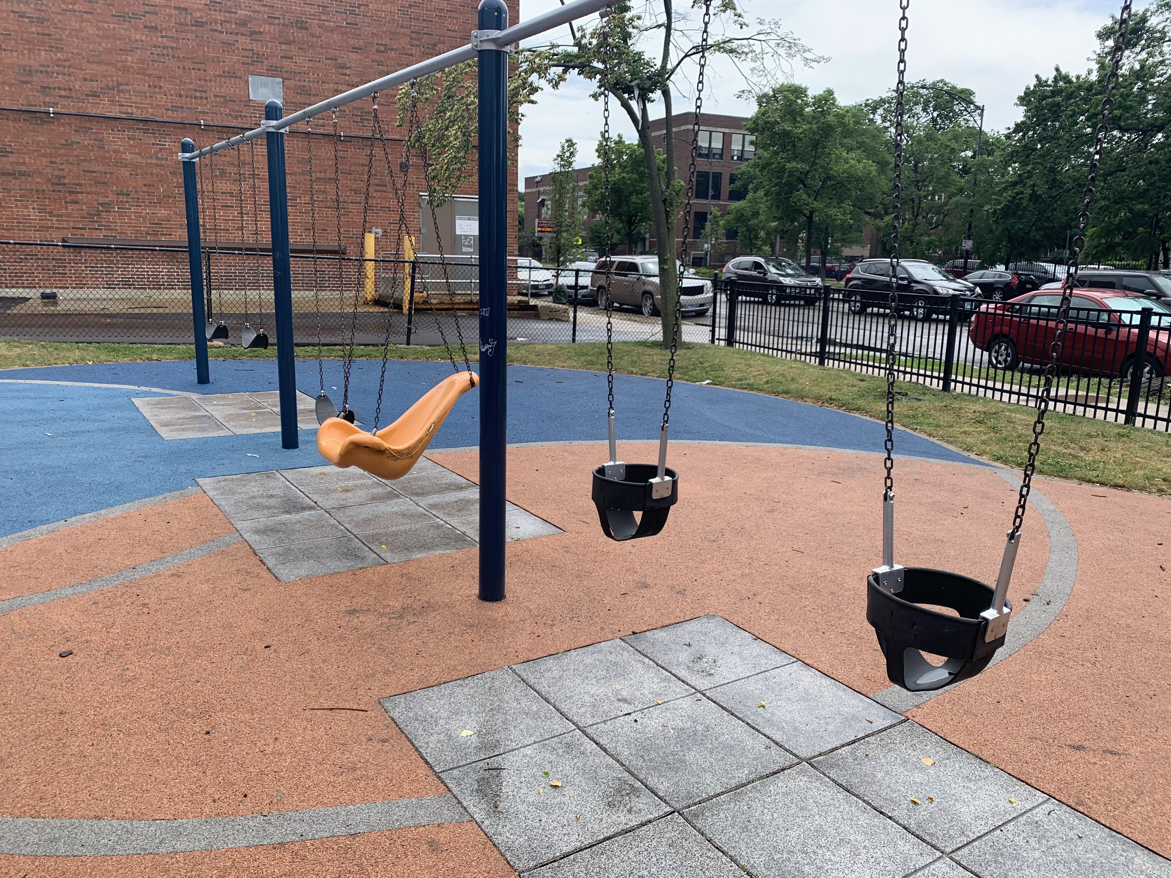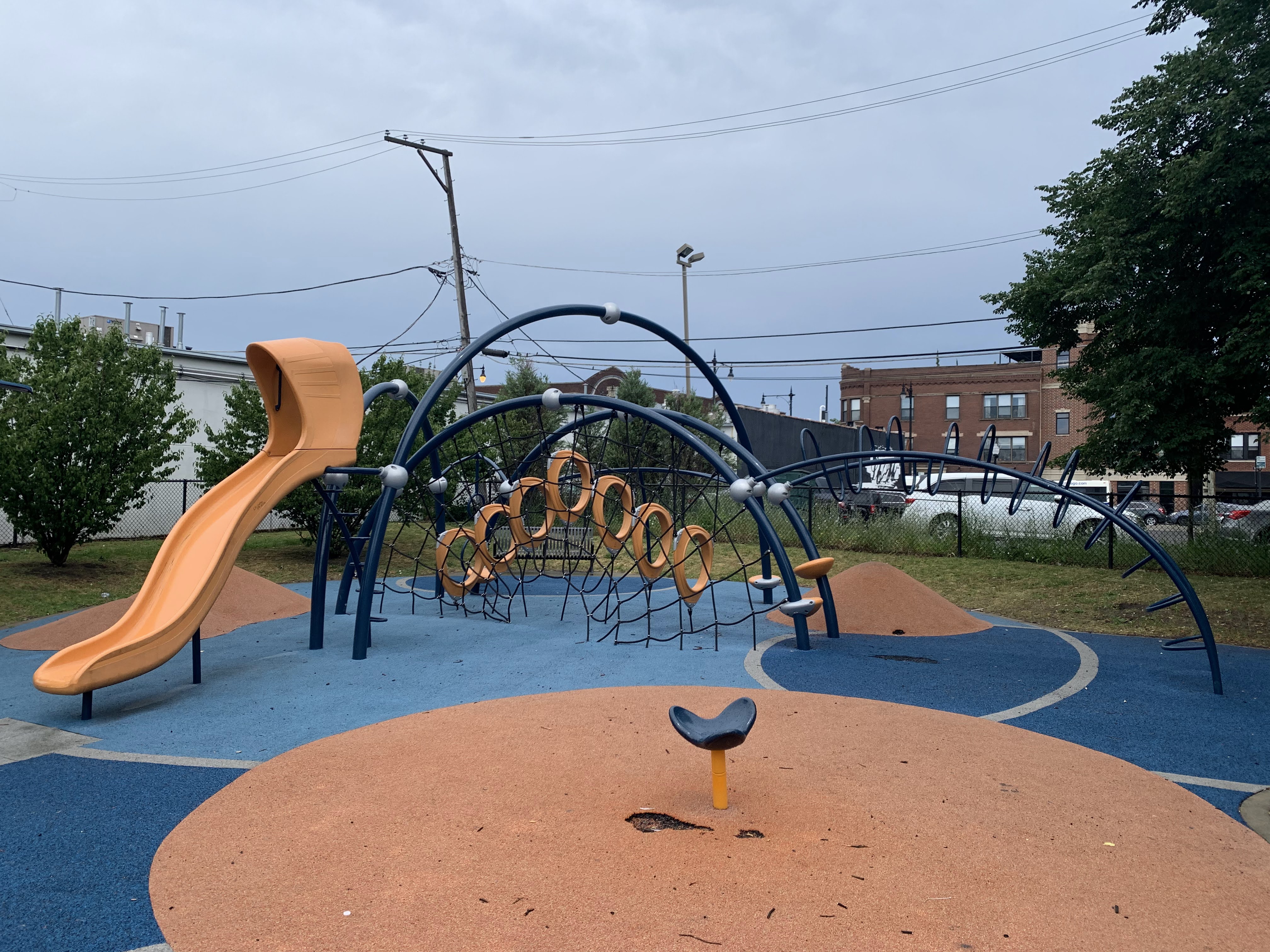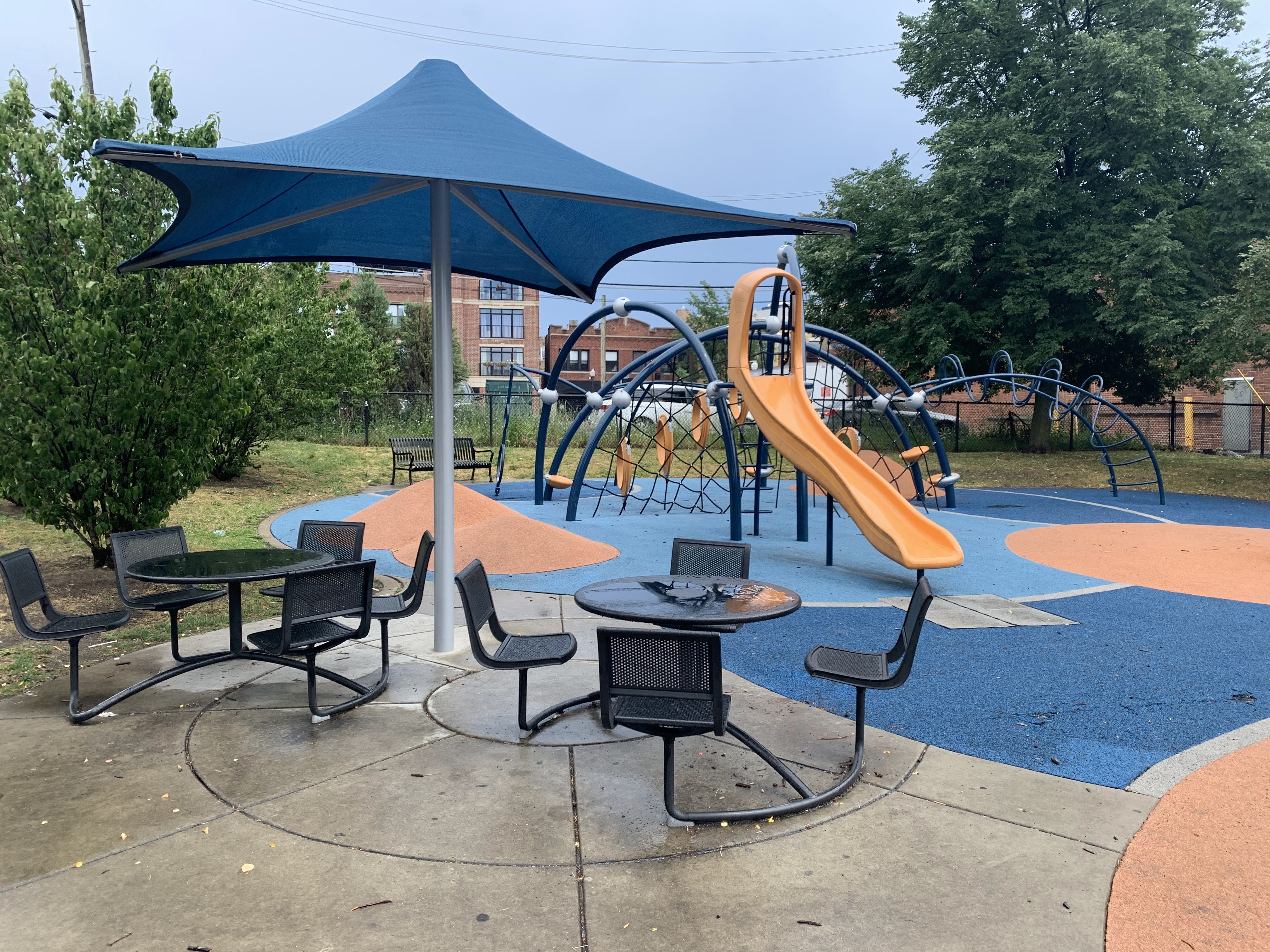 - Renovated in 2013, this small playground features a swing set and a set of modern climbing elements. The swing set includes the standard swings: toddler, adaptive, and belt seat. The rest of the playground isn't a traditional play structure but is instead a collection of climbing elements made of metal and rope and a single curved slide. The play area is fully enclosed and features a soft rubber surface that is mounded and sculpted so that the surface itself is a play element. There are a number of nice amenities in this park as well including benches, a drinking fountain, and picnic tables under a large shade umbrella.