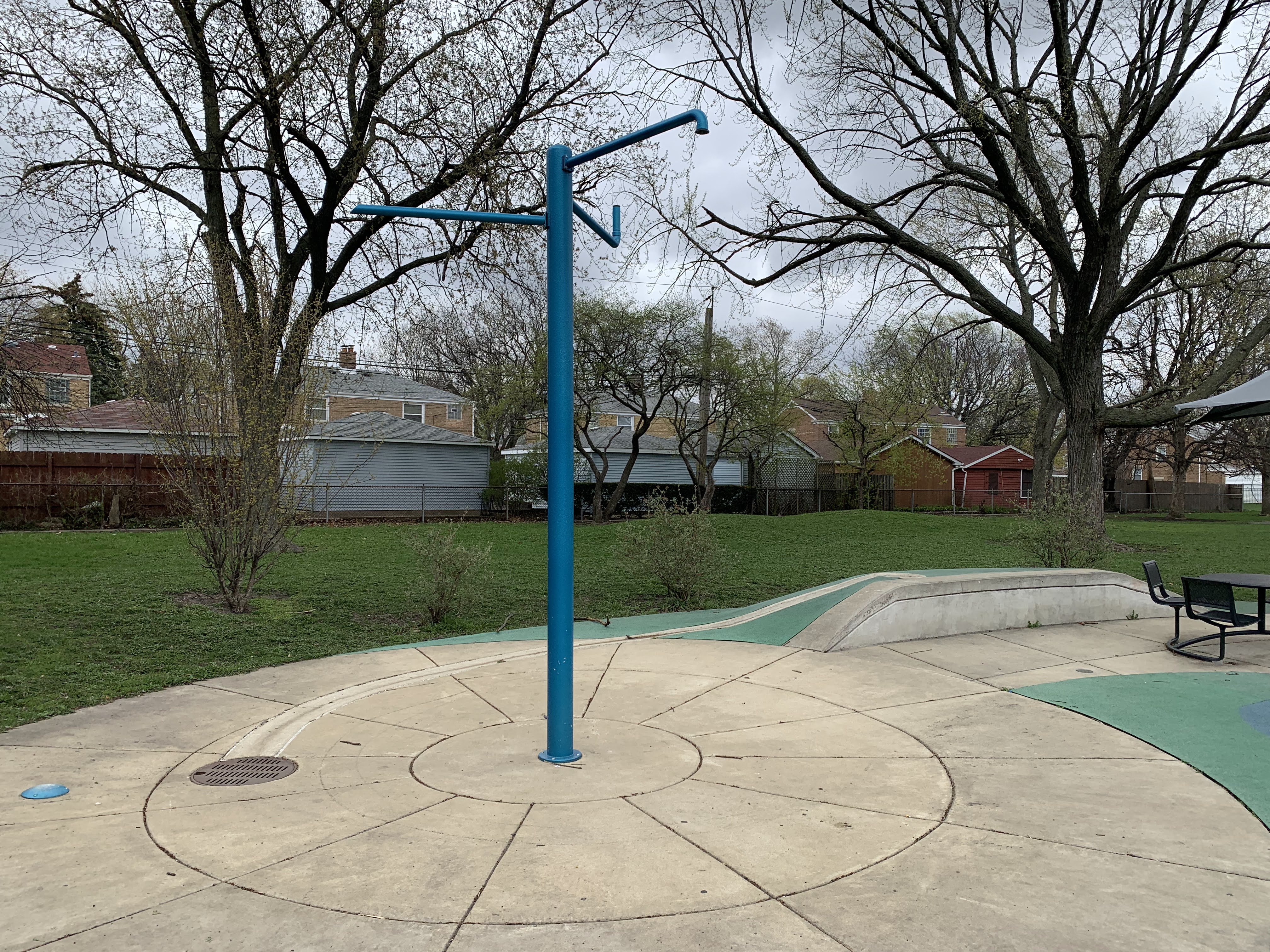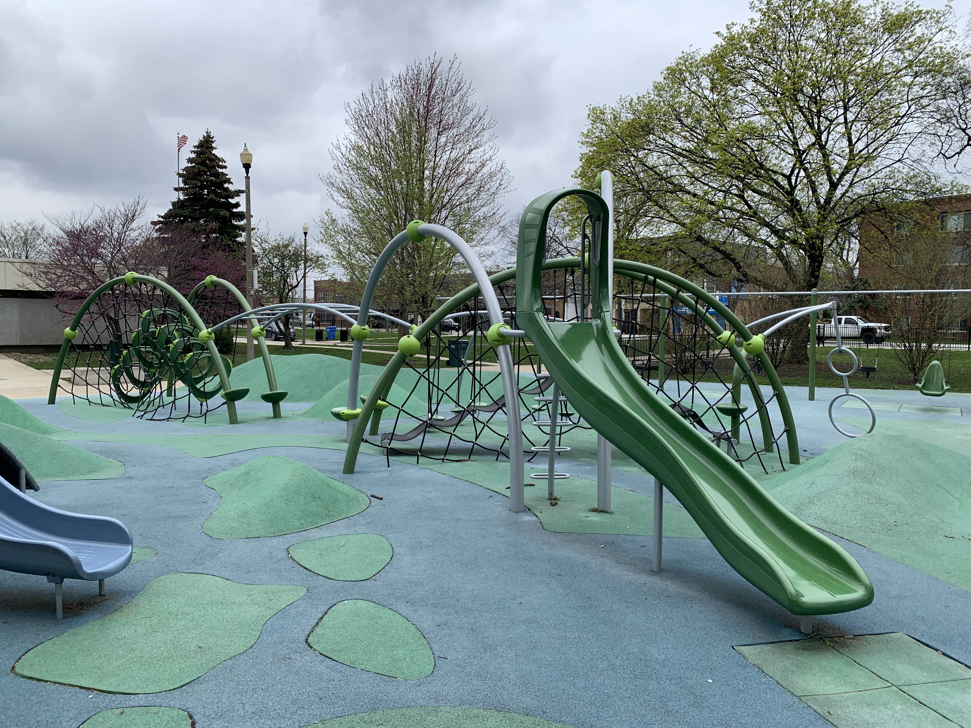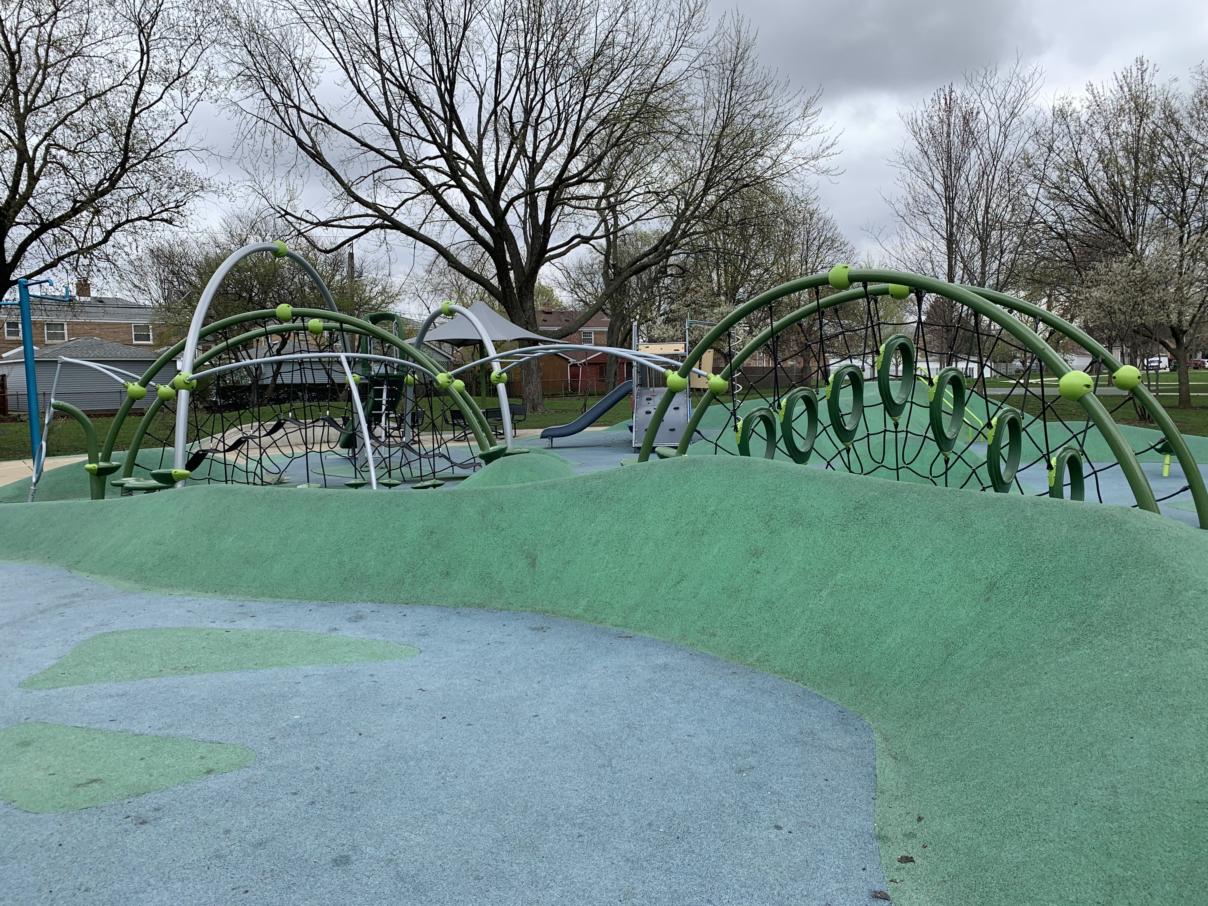 - The playground in Merrimac Park is located in the northeast corner of the park and has a lot of modern features. The play surface is soft rubber that is mounded in spots making the surface itself a play feature. On top of that surface, there are several large climbing and traversing elements that are very modern including some large semi-circular climbing nets, rings and hanging steps, and a wavy black belt bridge. There is also a smaller play structure for younger children. There are a few standalone elements including a rail slide and a spinning seat as well as the more traditional varieties of swings (toddler, traditional, and molded bucket). There is also a water spray feature with a triple overhead spray element. There are a few benches and picnic tables as well as a large shade canopy making for a comfortable experience for all. Highly recommend this modern playground.