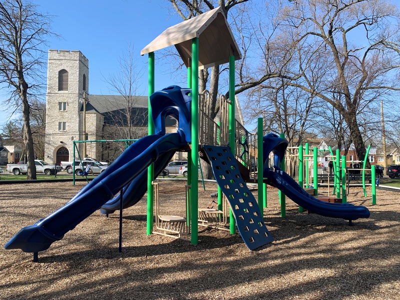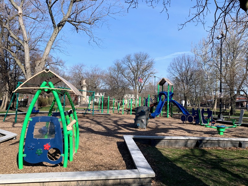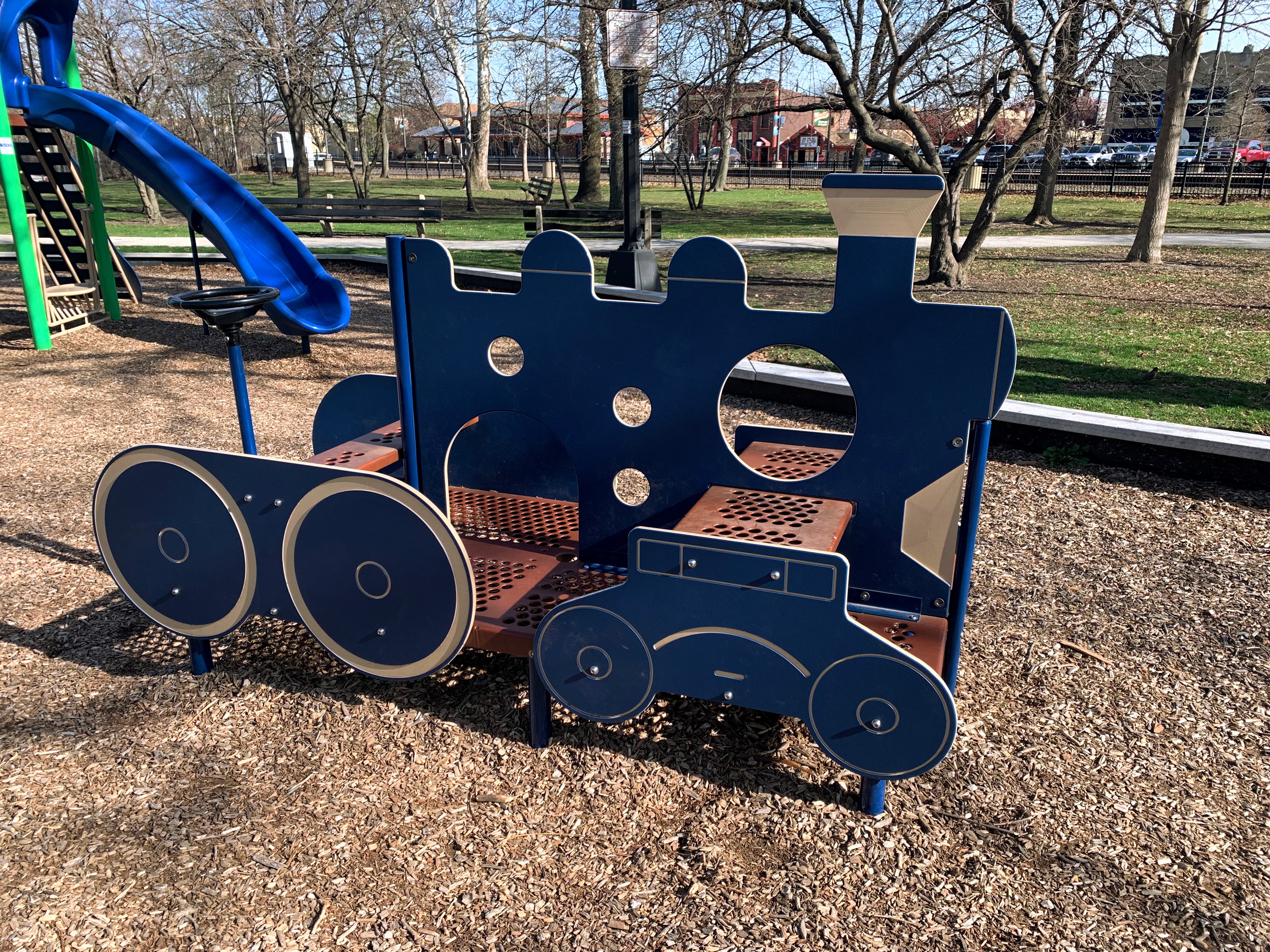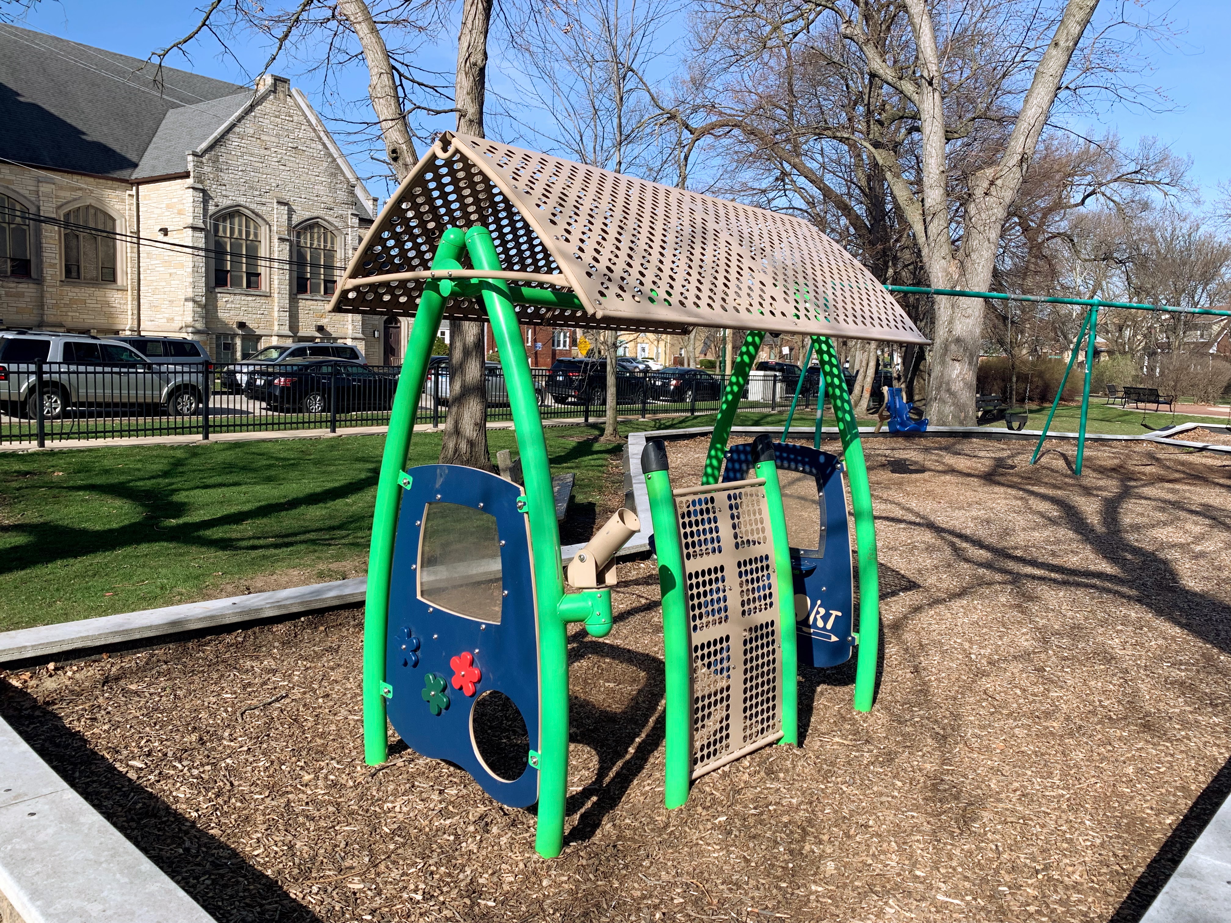 - Monument Park is a small neighborhood park with a playground featuring decent shade trees and wood chips underfoot. Standard playground equipment with a train play structure suitable for the location adjacent to the Metra tracks. The play area is fenced but not fully enclosed and there are a few benches for seating.