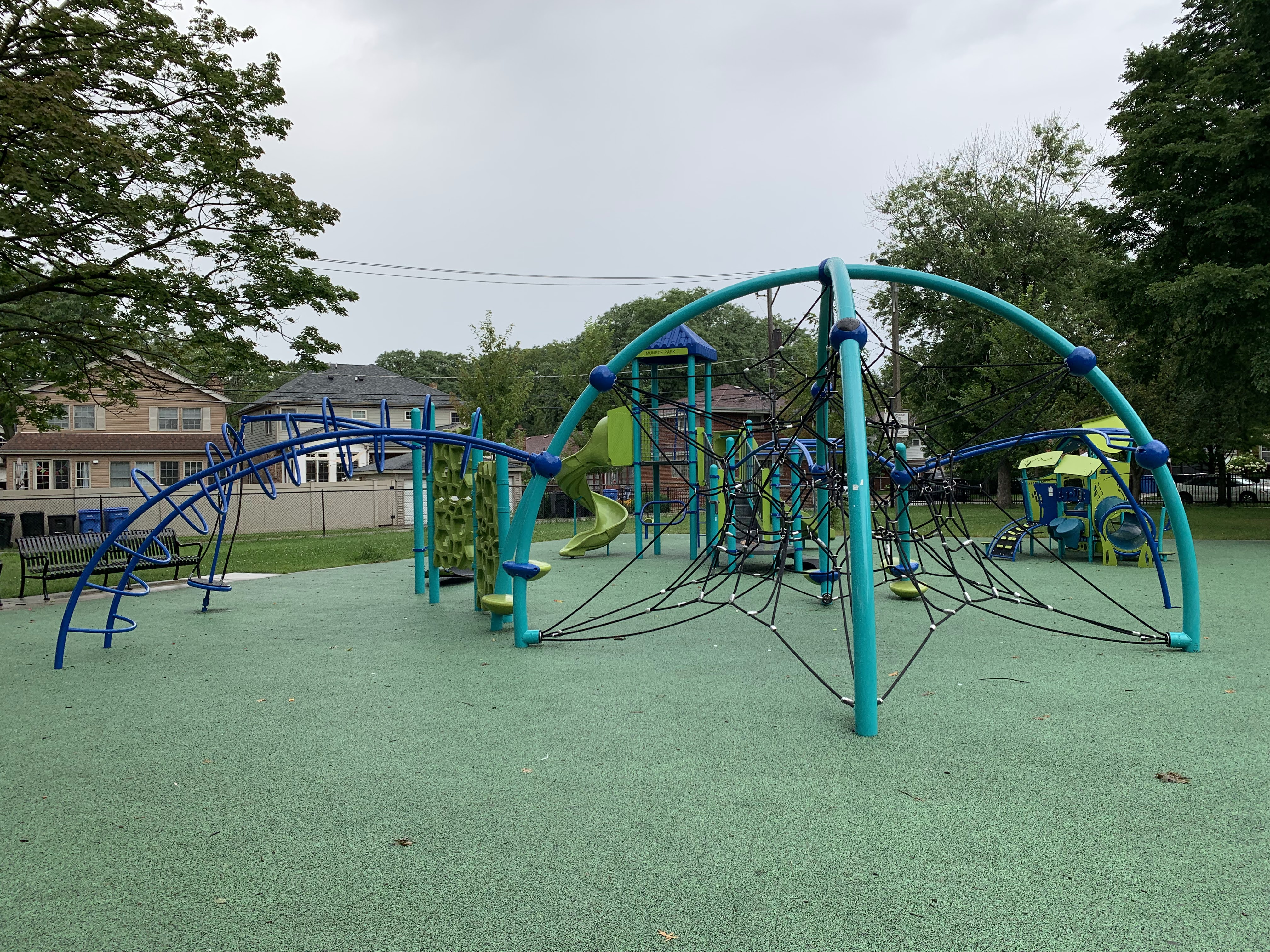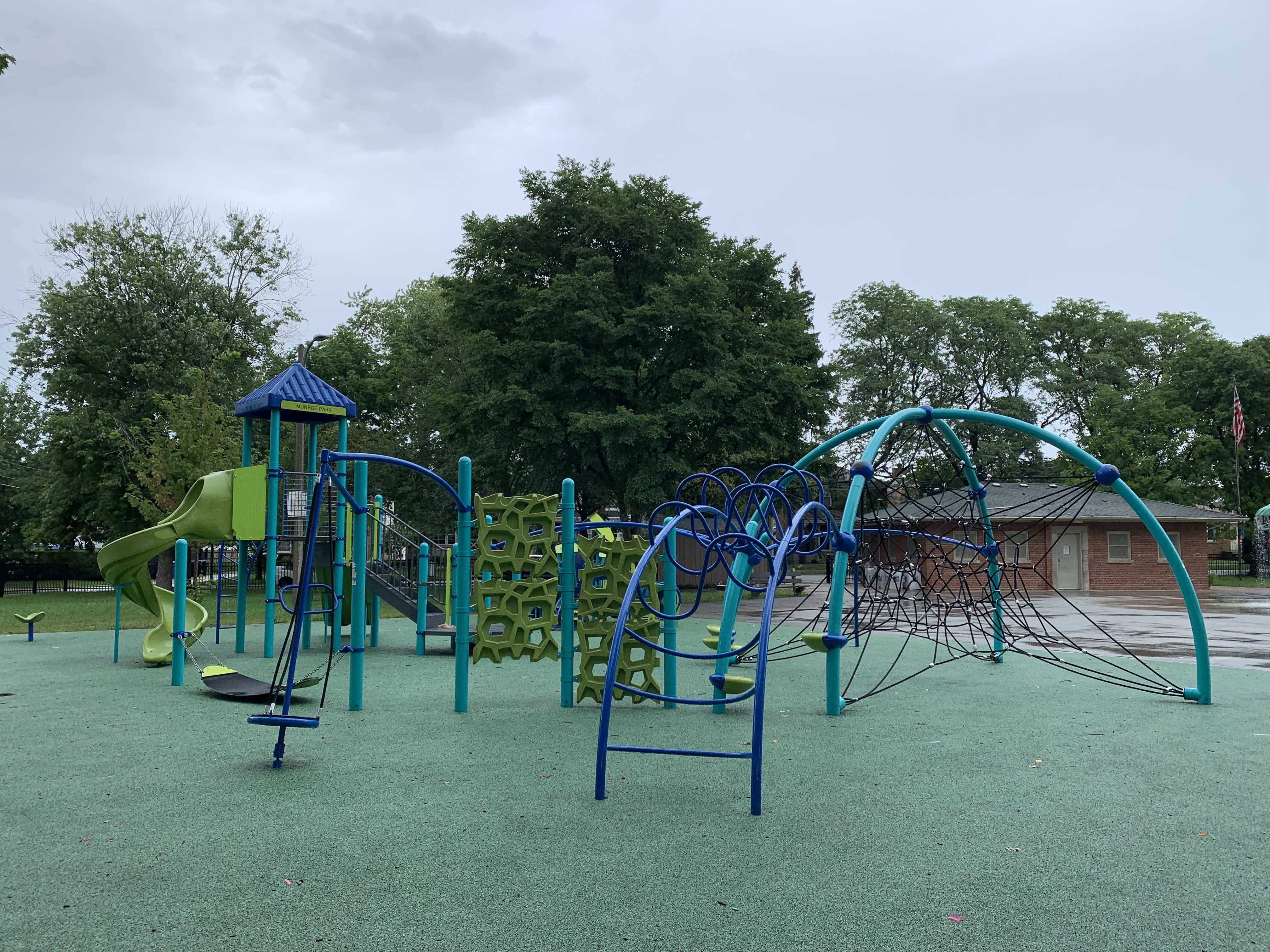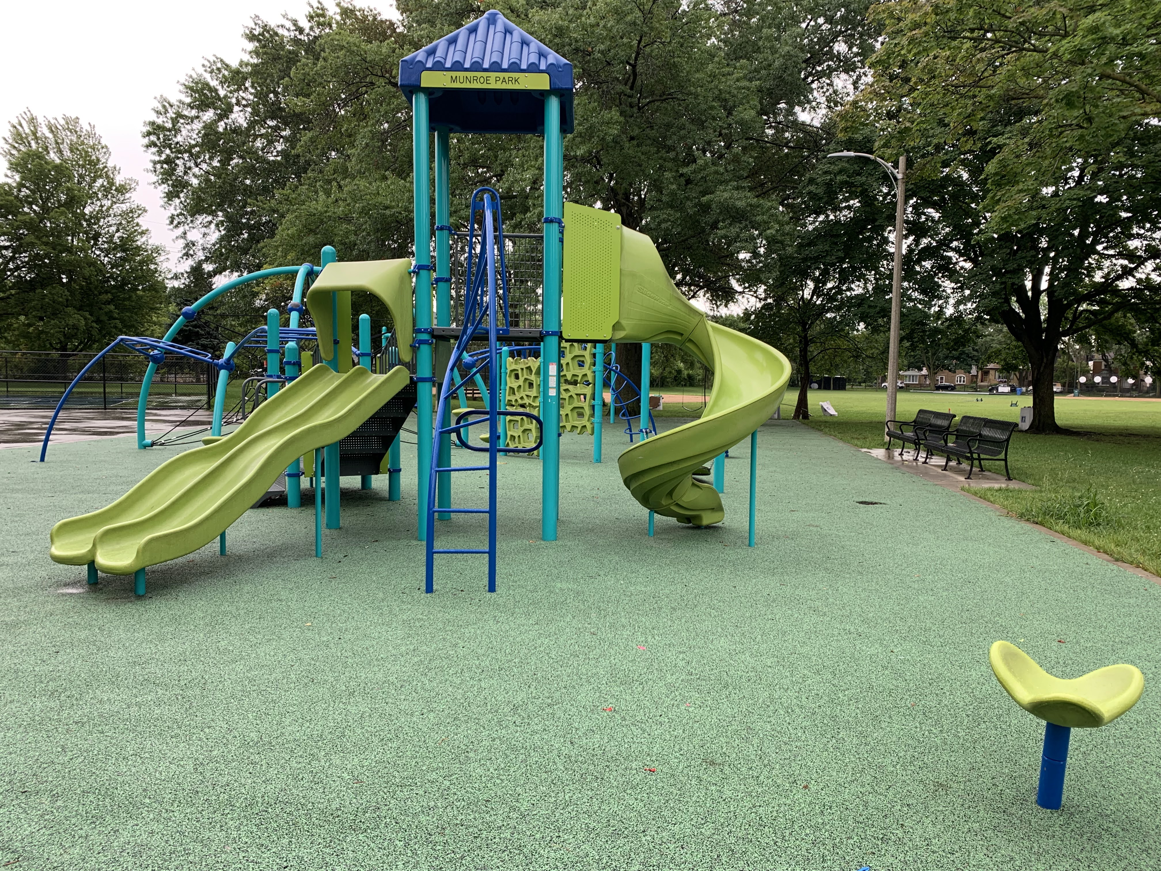 The playground at Munroe Park features a small structure for younger children, a larger collection of elements for older children , the standard set of Chicago Park swings, and a small water spray feature. The collection of elements for older children features a rope net climbing element, geometric climbing walls, and other metal climbing elements.