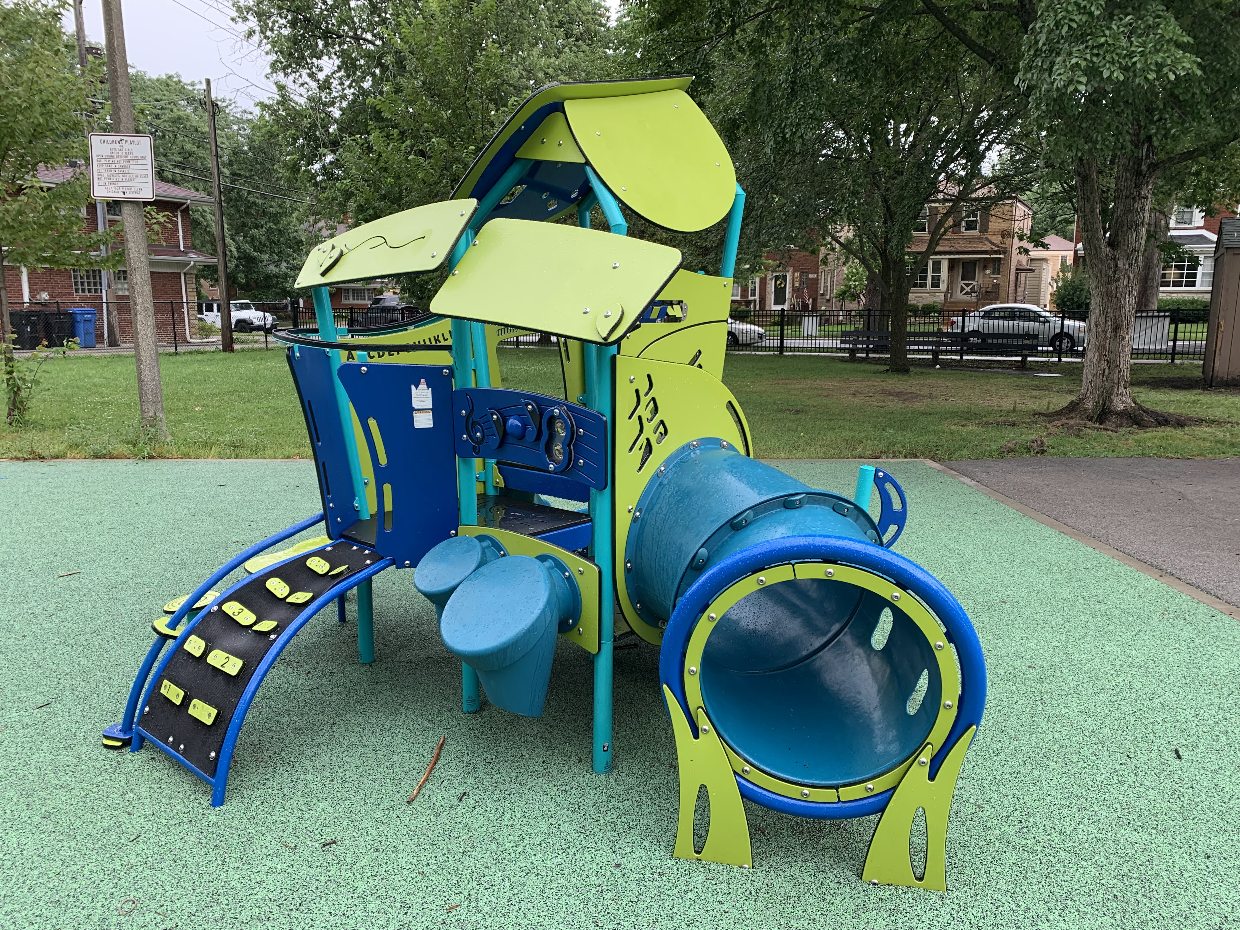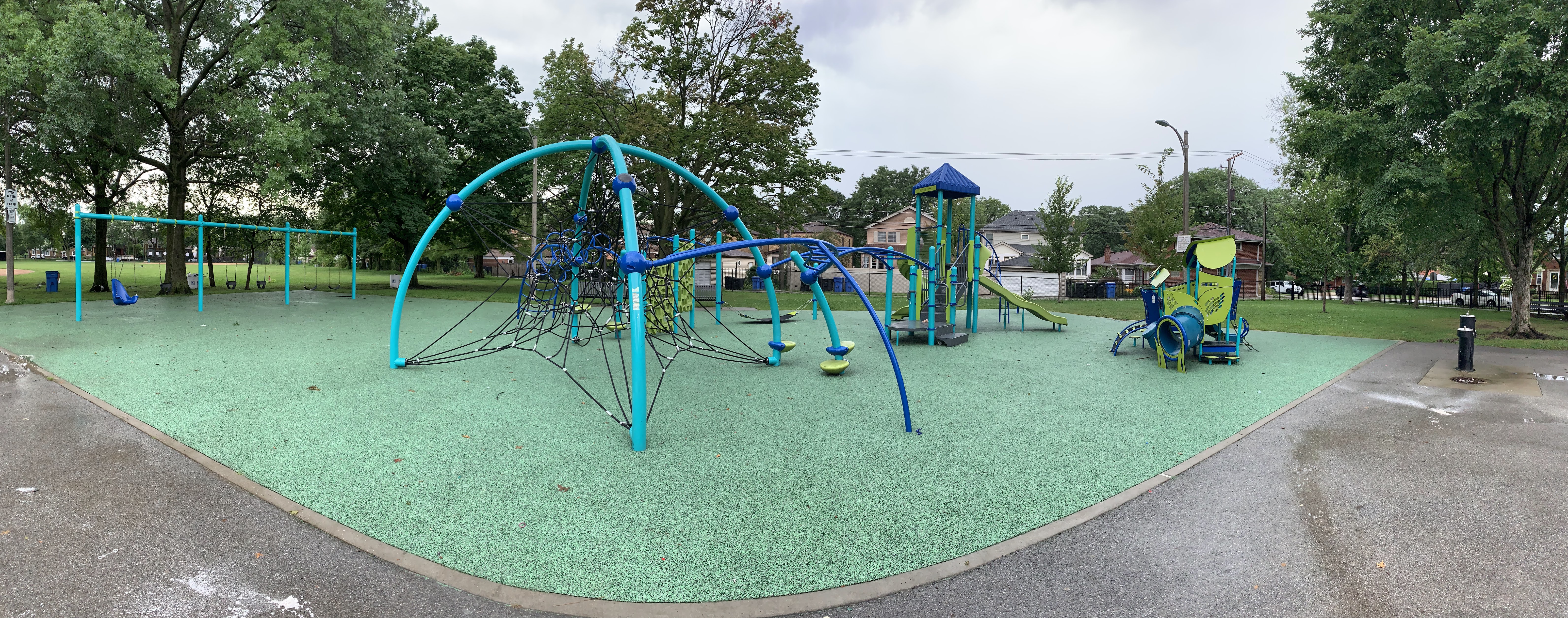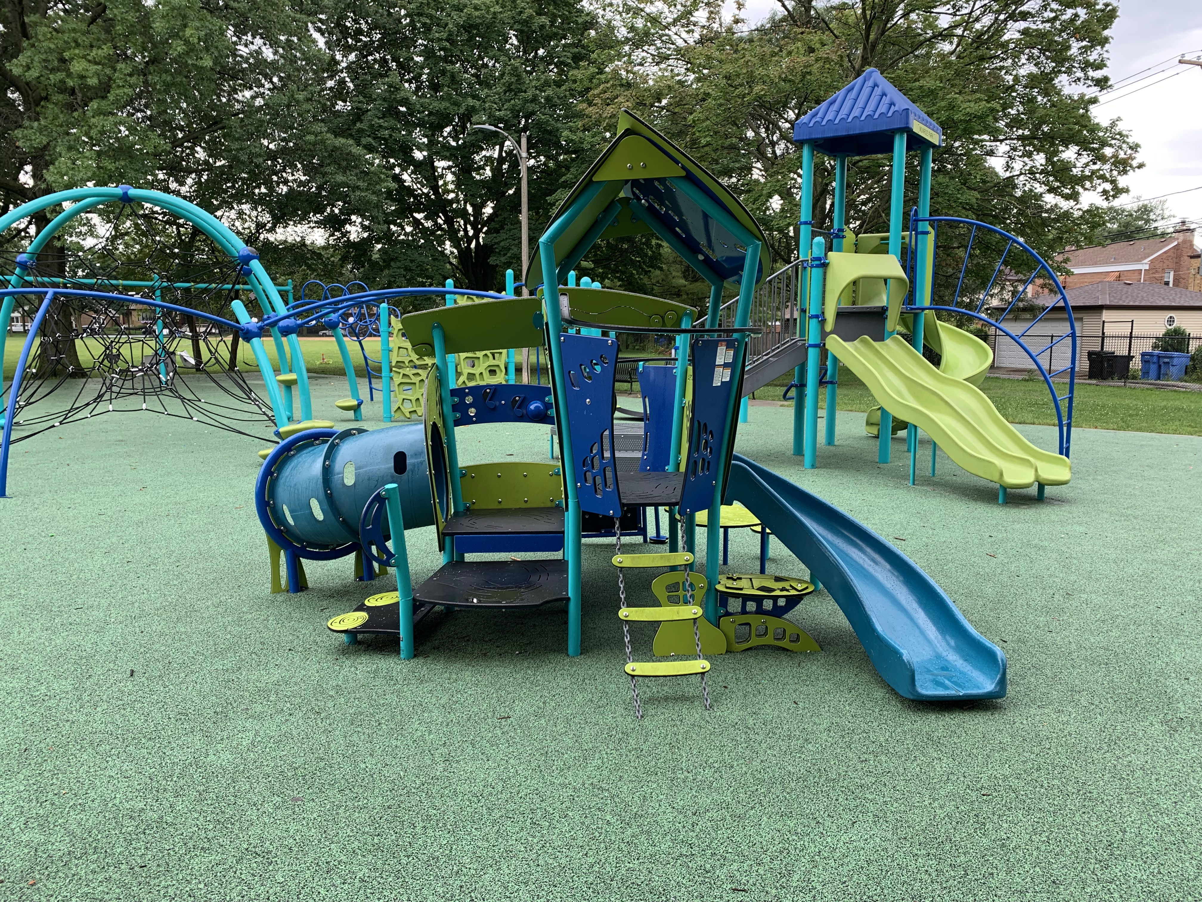 The play surface is soft rubber and there are a few benches and a drinking fountain in the area. The play area opens to the rest of the park but is fenced and fully enclosed from the street. Some trees to the south provide some shade and the park fieldhouse provides access to bathrooms (when open). All in all, this is a good neighborhood playground. - Playground Features