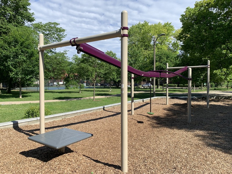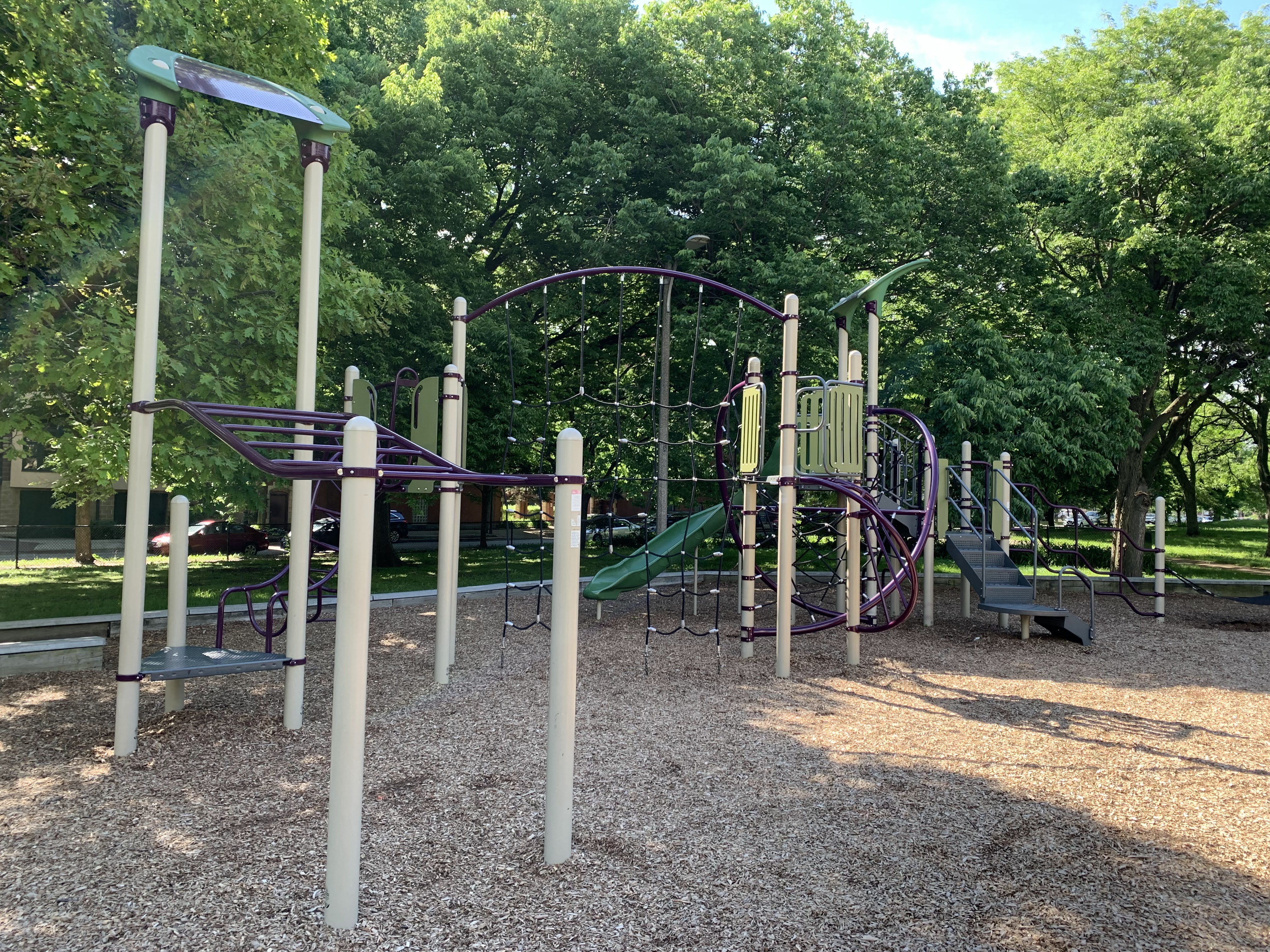 - This playground - one of two in Nichols Park - is located on the east side of the park and seems designed for older children. Rather than a traditional play structure, this playground is a collection of various climbing and traversing elements as well as a few standalone elements (including a zipline!). The playground is fenced from the street but is not fully enclosed and instead opens directly into the park. Although there aren't benches of picnic tables, the low perimeter wall provides some seating. Large trees provide some shade to the area and the play surface is wood chips.