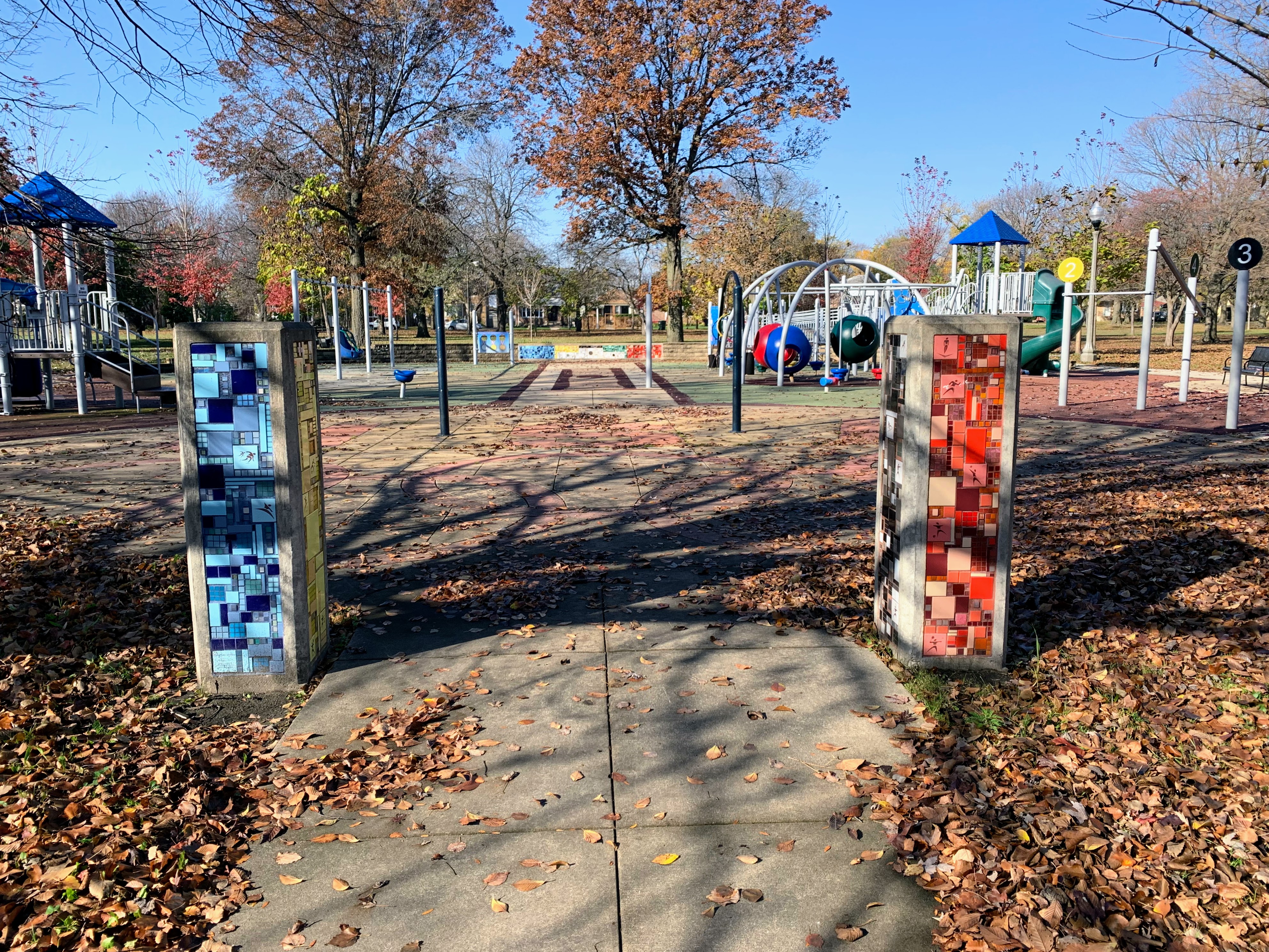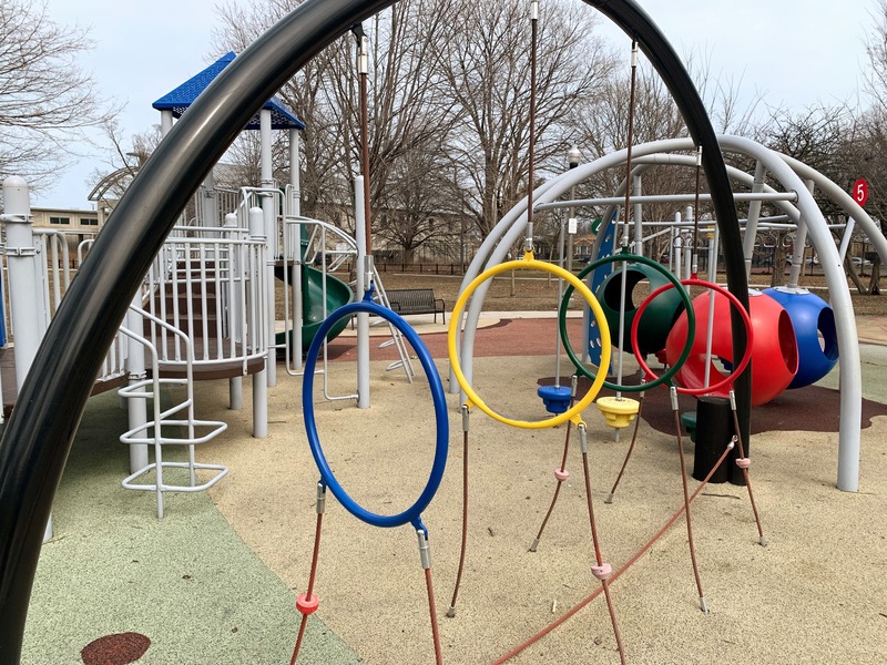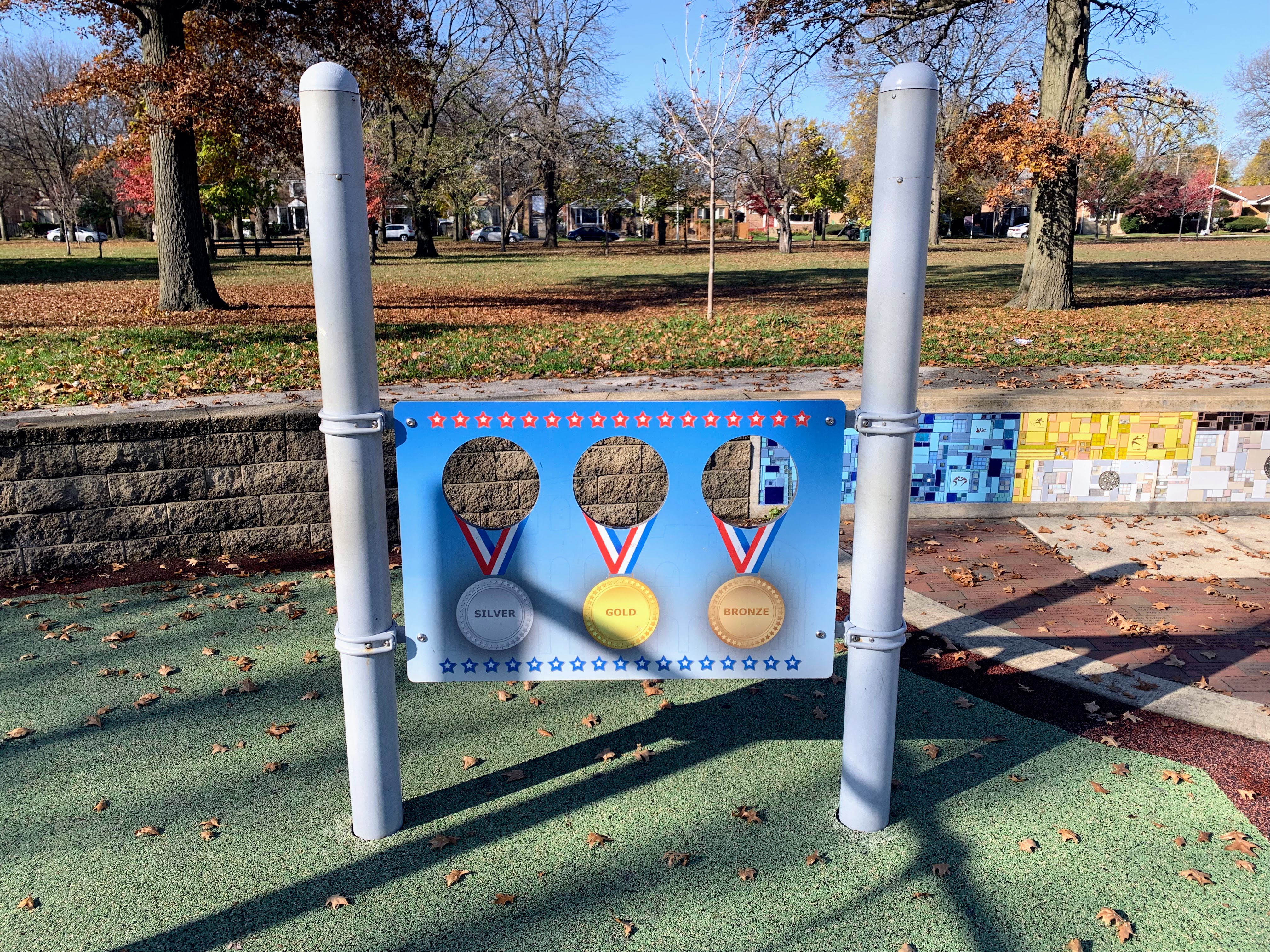 Owens Park - named for Olympian Jesse Owens - features a great playground that reflects some of the achievements of the person this park is named to honor. There is wonderful mosaic art throughout the play area with the Olympic color and themes and much of the equipment itself reflect these colors. There is a panel that challenges park-goers to compete in events like Jesse Owen, suspended metal climbing rings that reflect the Olympic Rings, a small podium, and cut-out panel with gold, silver, and bronze metals.