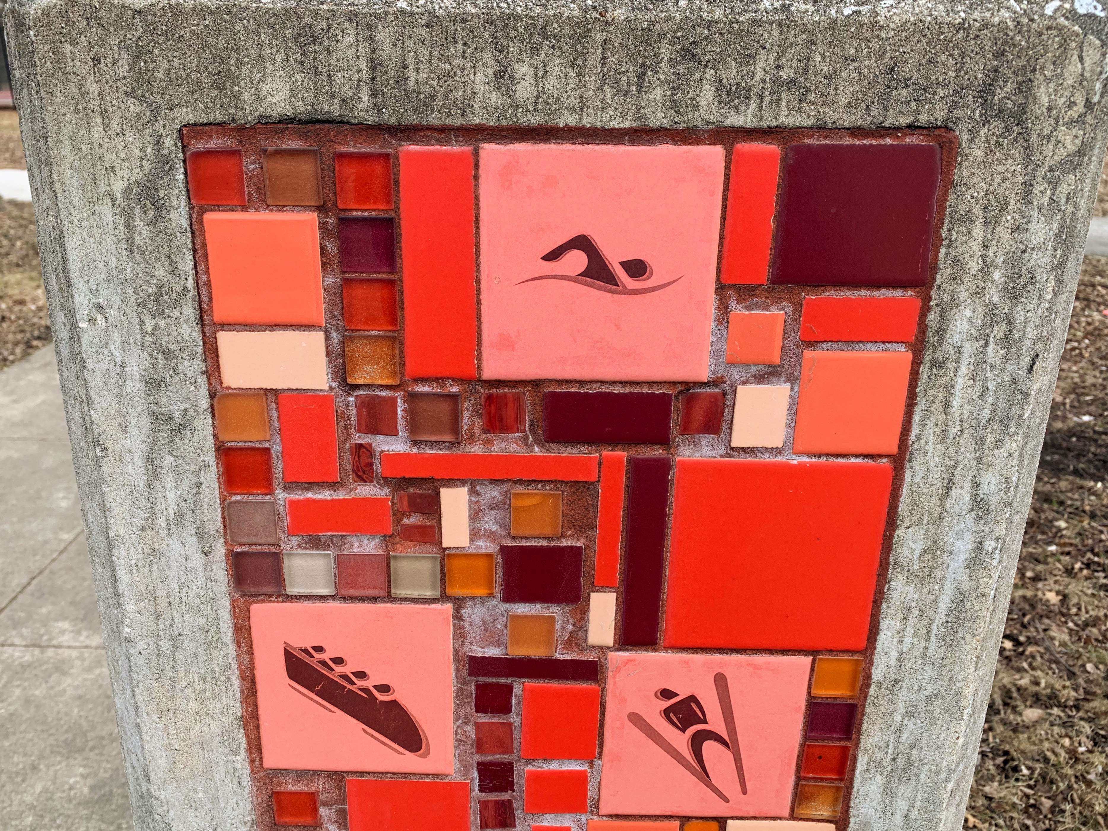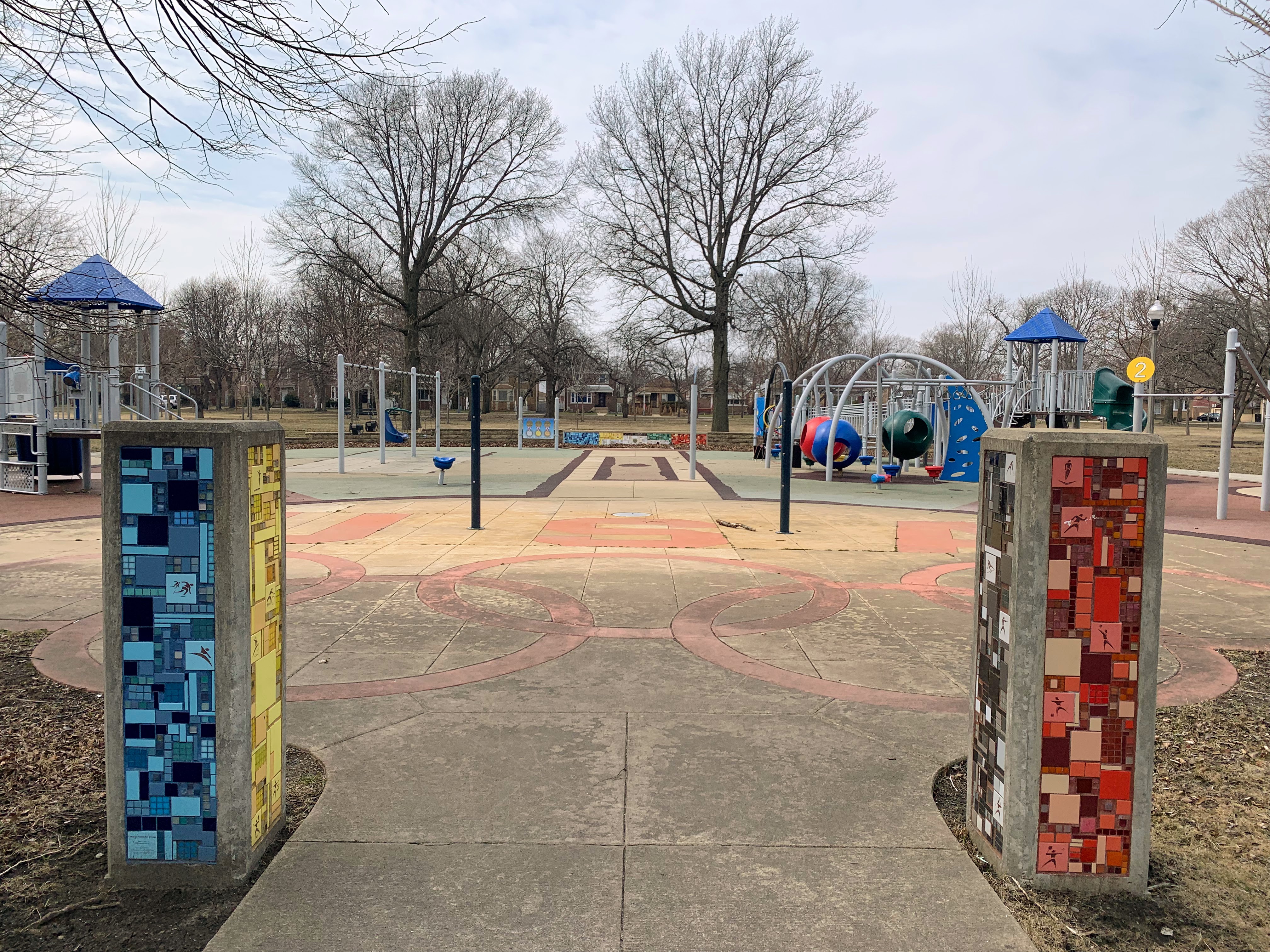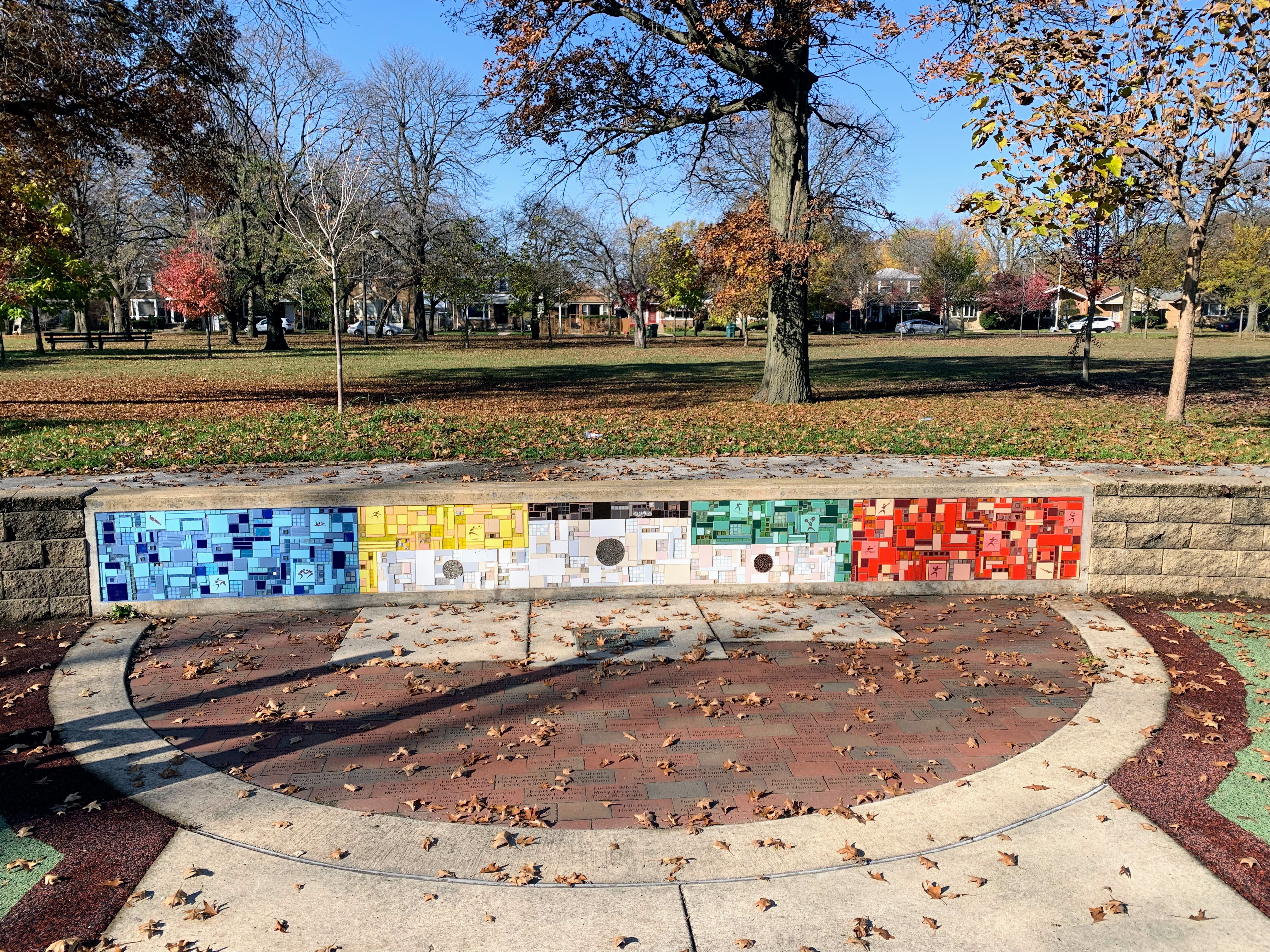 Owens Park - named for Olympian Jesse Owens - features a great playground that reflects some of the achievements of the person this park is named to honor. There is wonderful mosaic art throughout the play area with the Olympic color and themes and much of the equipment itself reflect these colors. There is a panel that challenges park-goers to compete in events like Jesse Owen, suspended metal climbing rings that reflect the Olympic Rings, a small podium, and cut-out panel with gold, silver, and bronze metals.