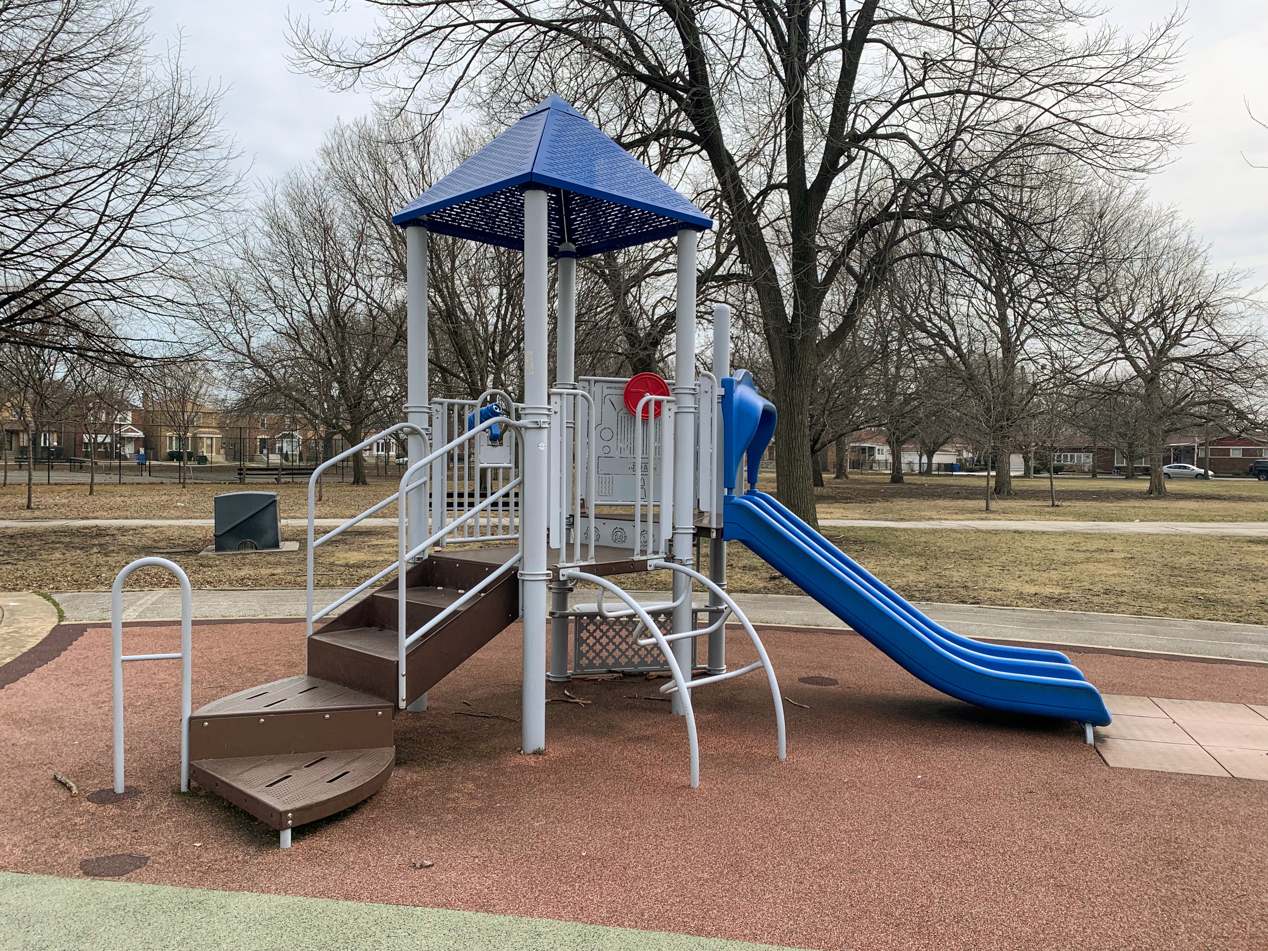 Yet this isn't a gimmick, the playground is a great little playground with two play structures and a standard set of swings. There is also a water feature during the summer months. The non-play amenities are nice as well: benches and a modern fieldhouse with drinking fountains and bathrooms.