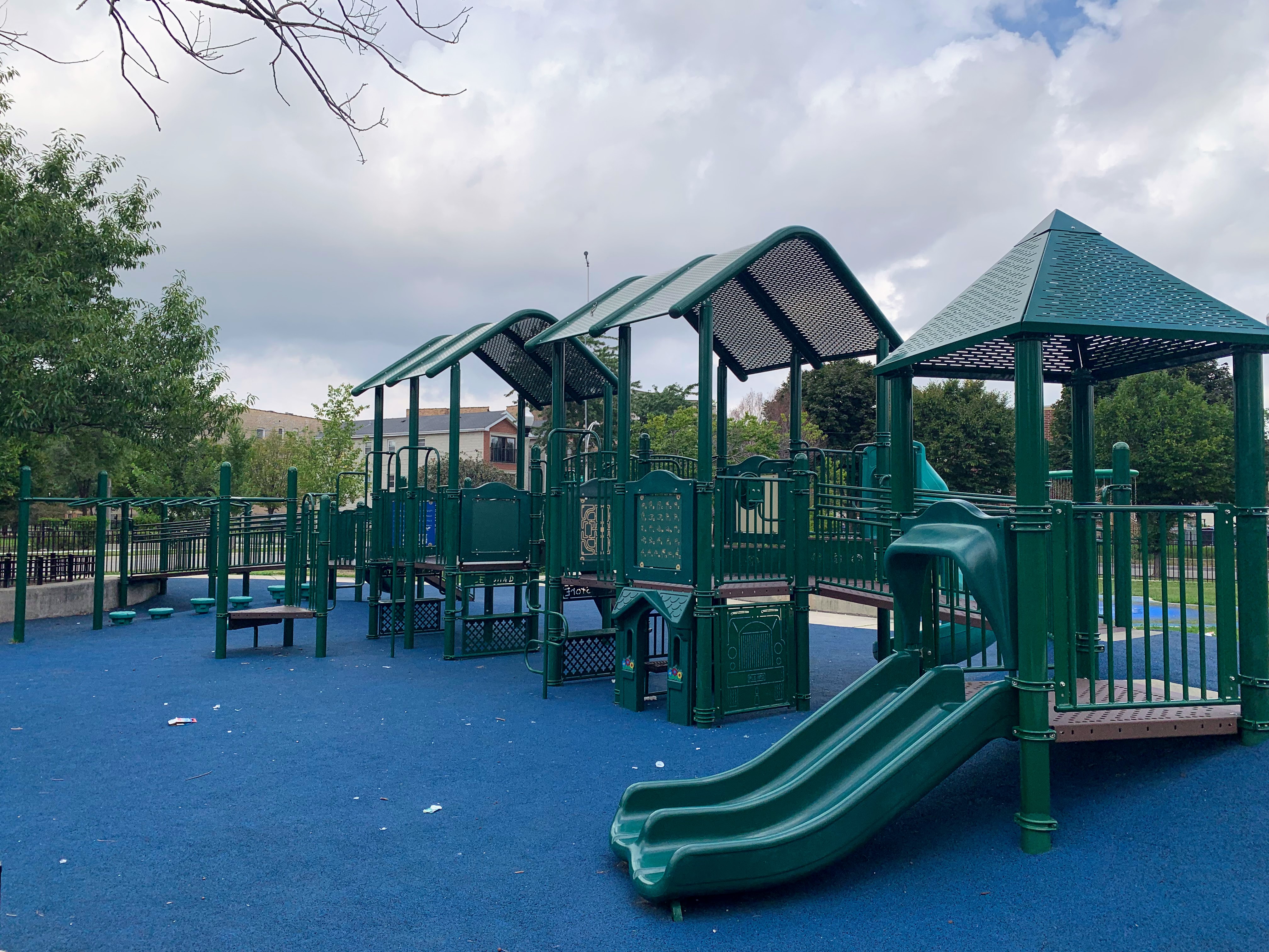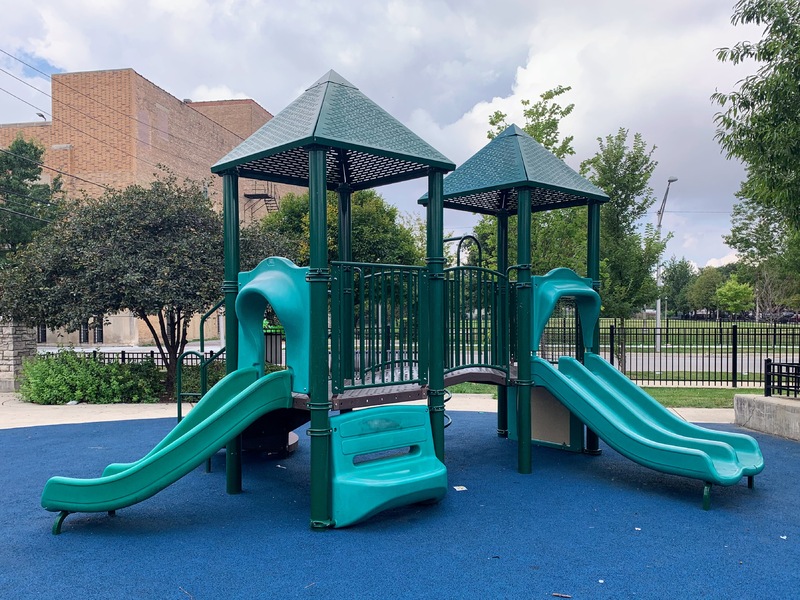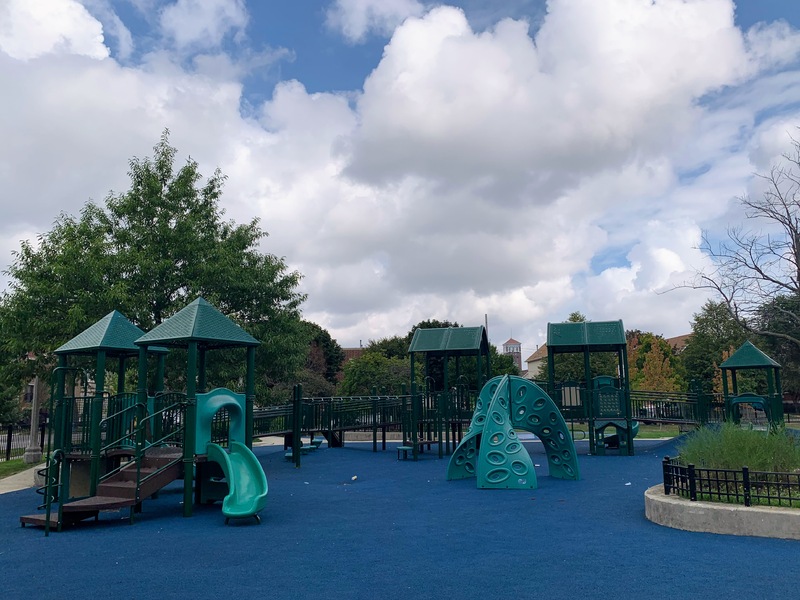 Park 534 features a nice playground and water spray feature in the middle of the park. There is small swing set with two toddler swings and two belt seat swings and then two play structures. The smaller one is for younger children and features a couple of slides and climbing elements. The larger structure is quite large and sprawling with a few slides, climbing elements, and a variation of monkey bars. The larger structure is also quite accessible via ramps on both sides. The water spray feature includes two water spraying arches and a halo shower sprayer.