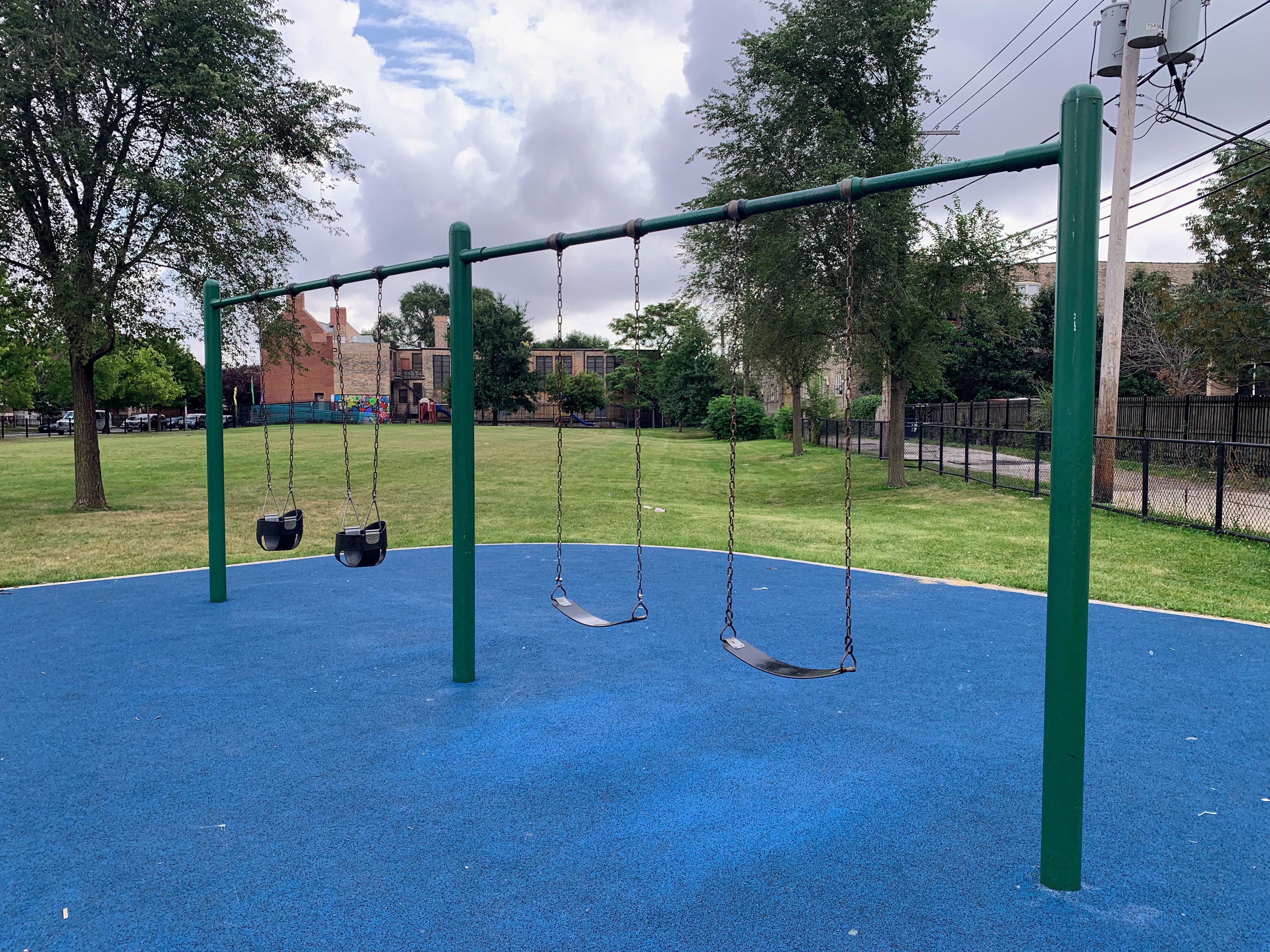 The playground is bright and sunny and is fenced from the street and opens into a large grassy space. The play surface is soft rubber and there are a few benches dotting the play area. All in all, this is a solid neighborhood playground. - Playground Features