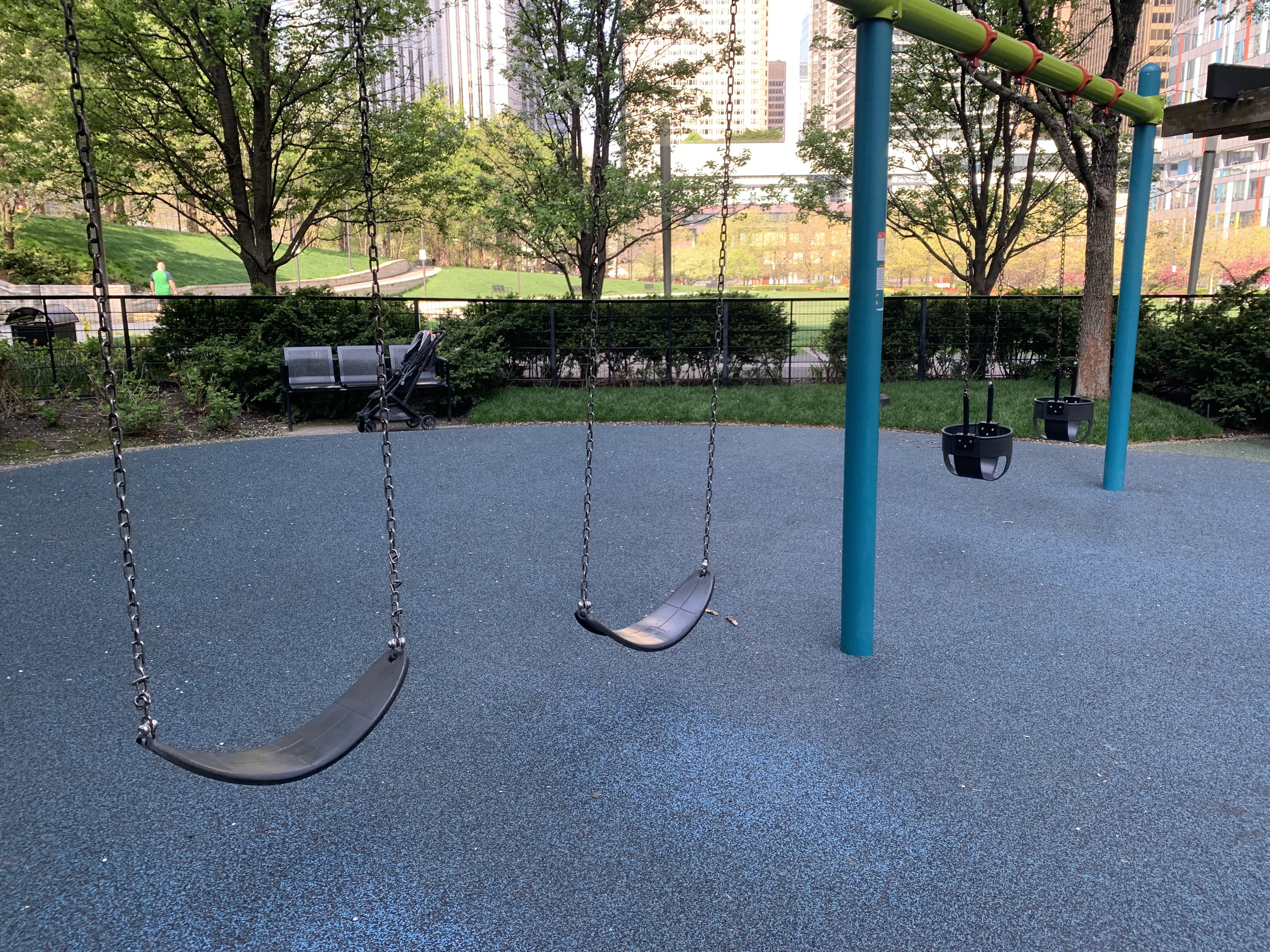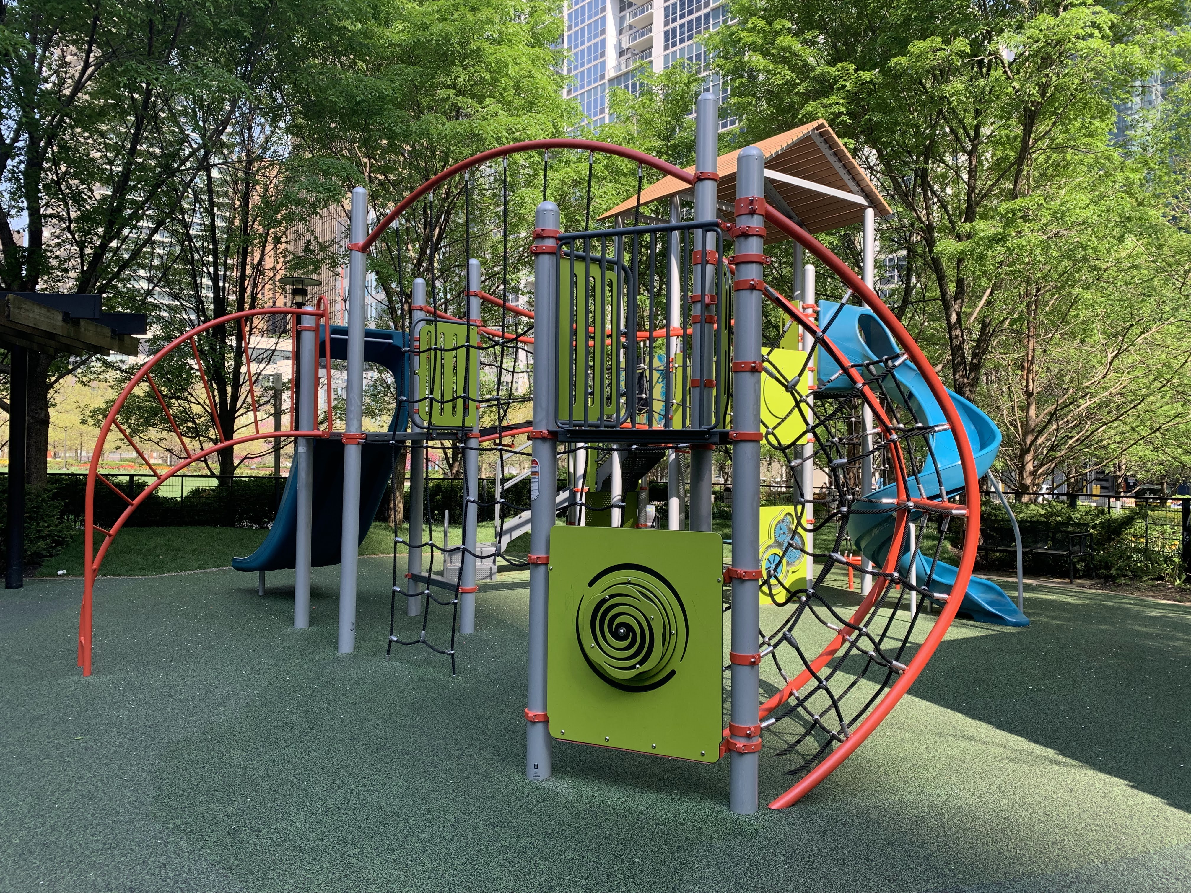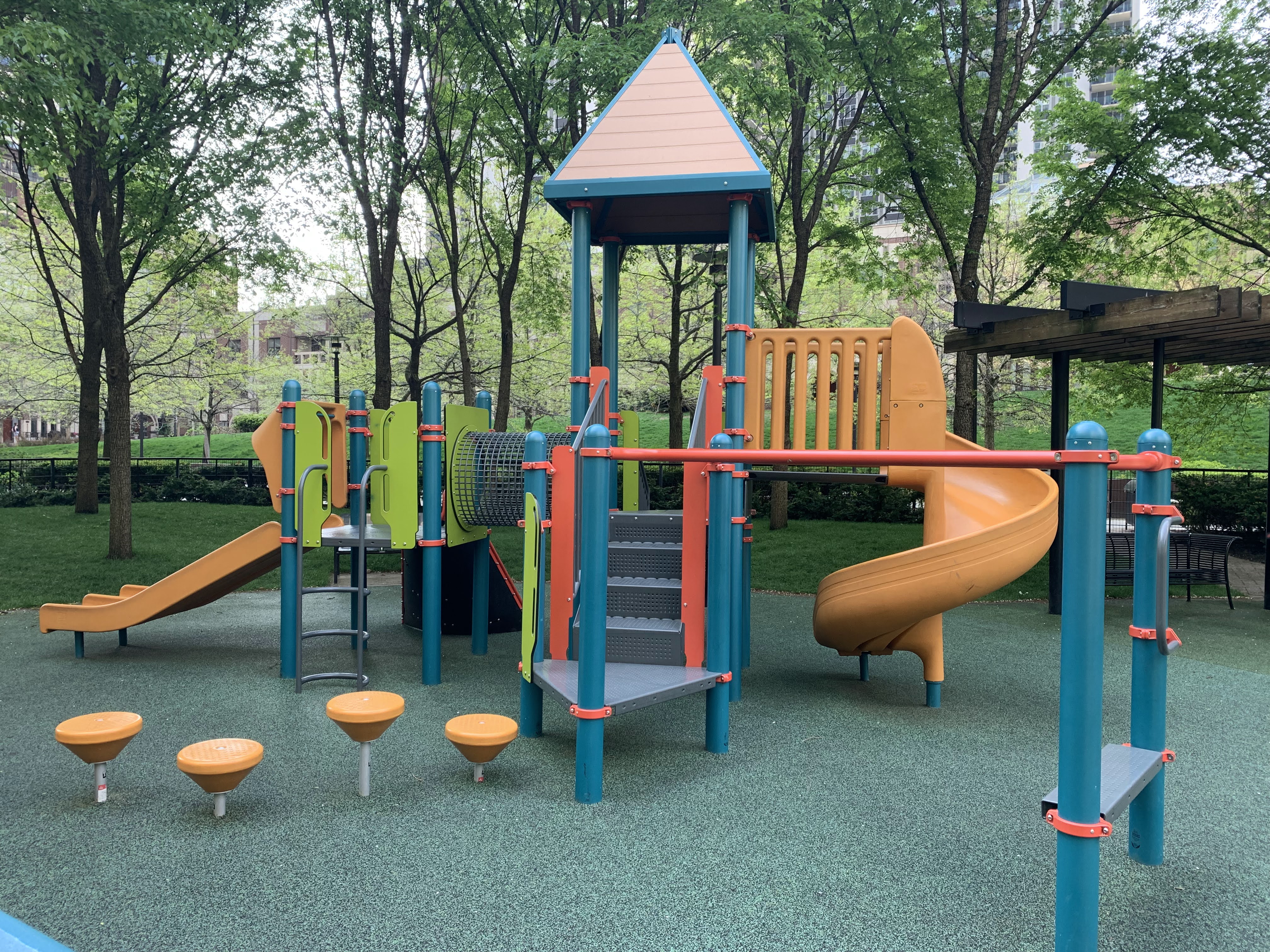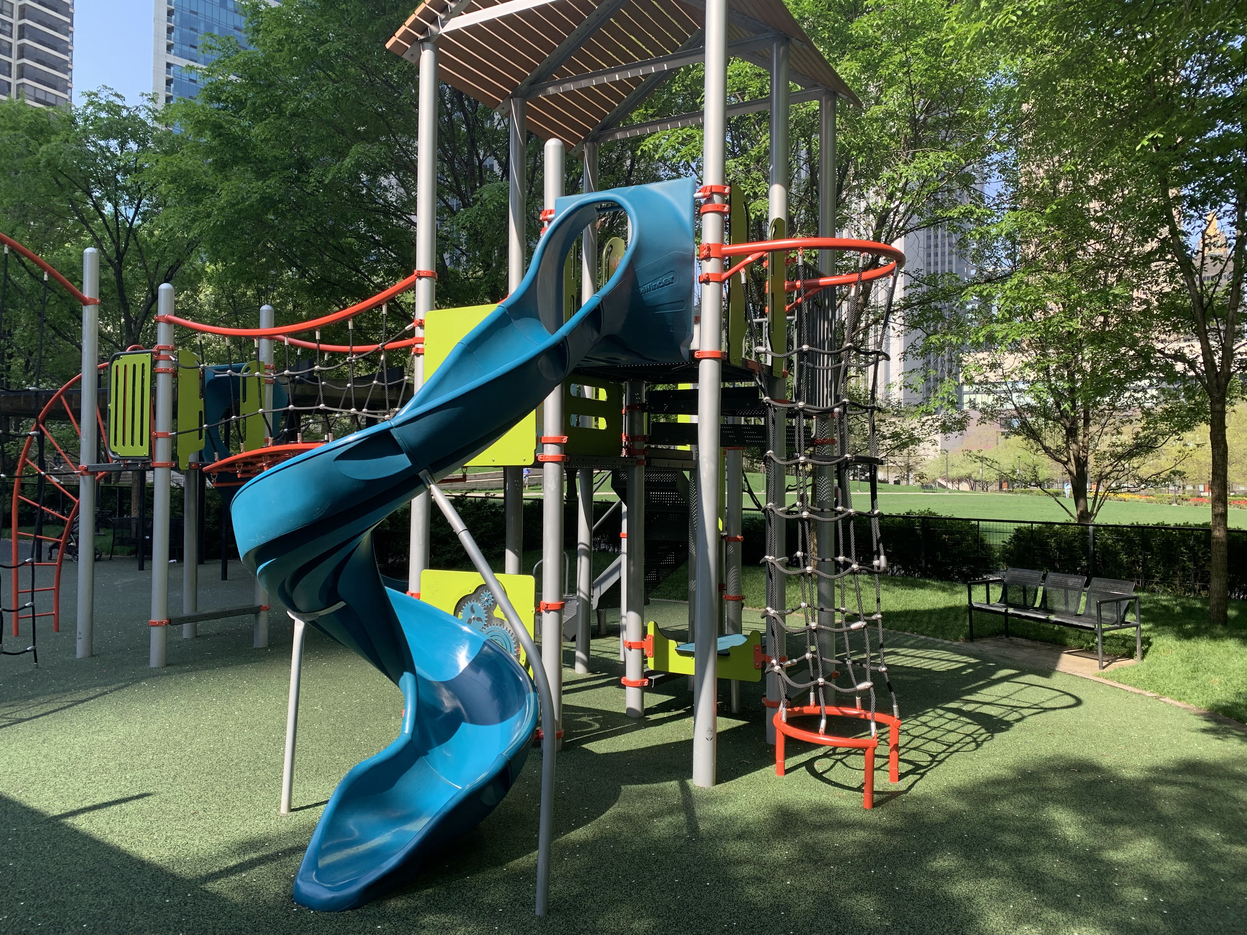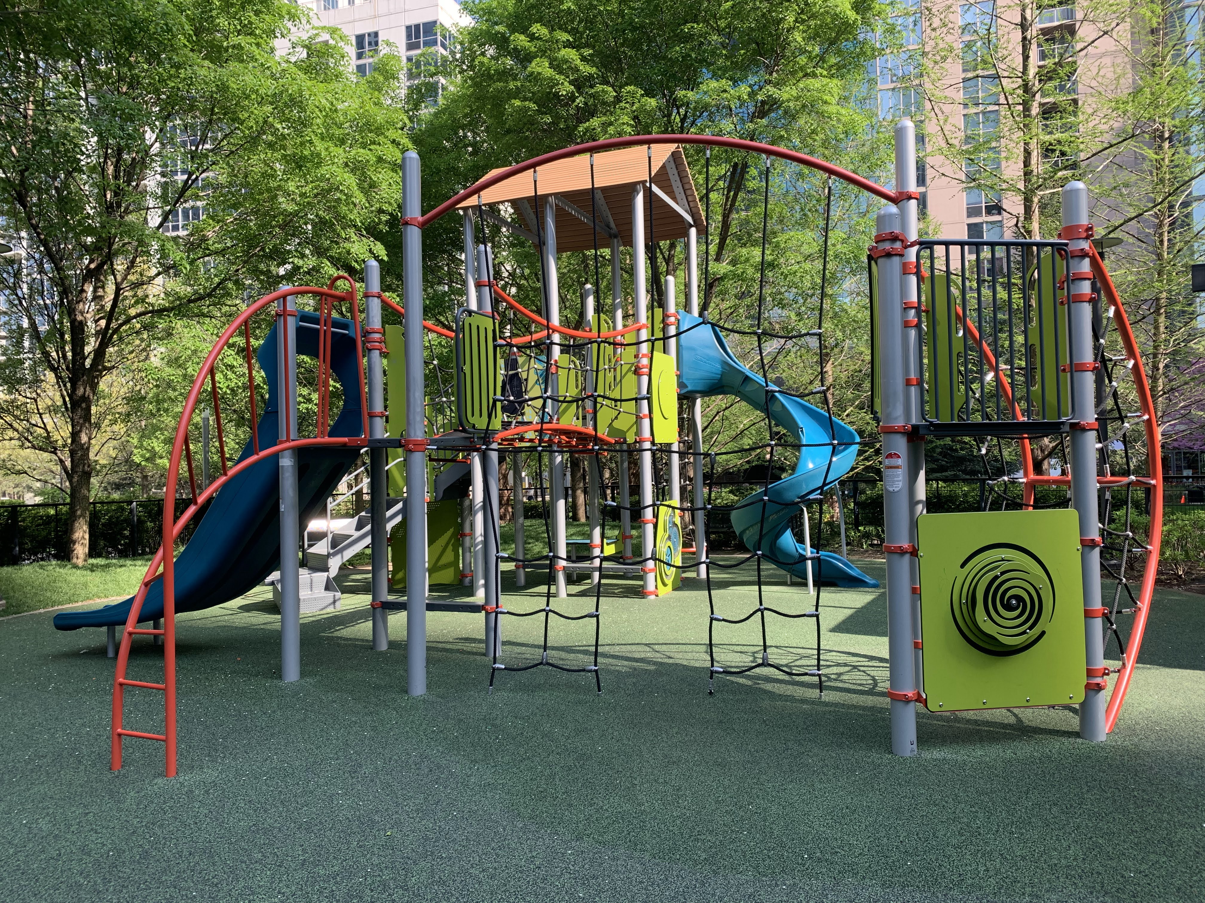 The playground is set away from the surrounding street and is fully enclosed. There is ample shade from both buildings and trees and plenty of benches around the perimeter of the play area.