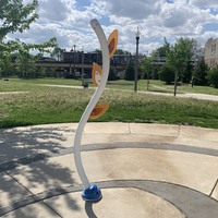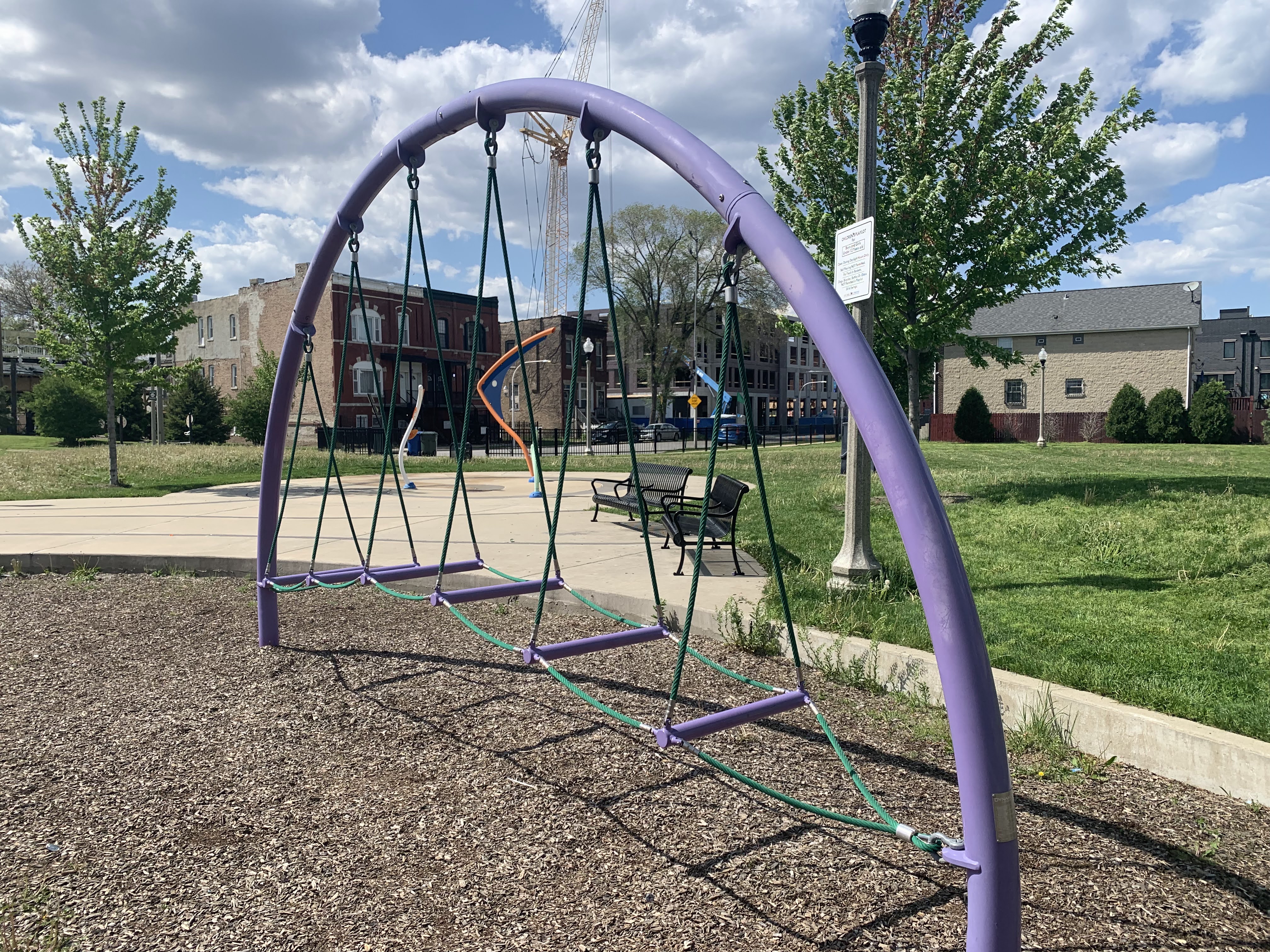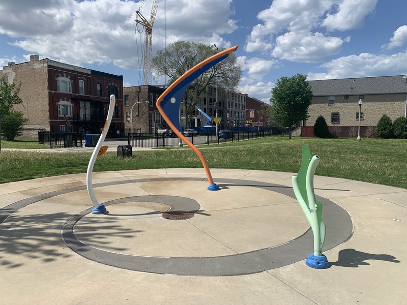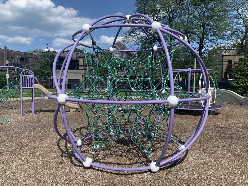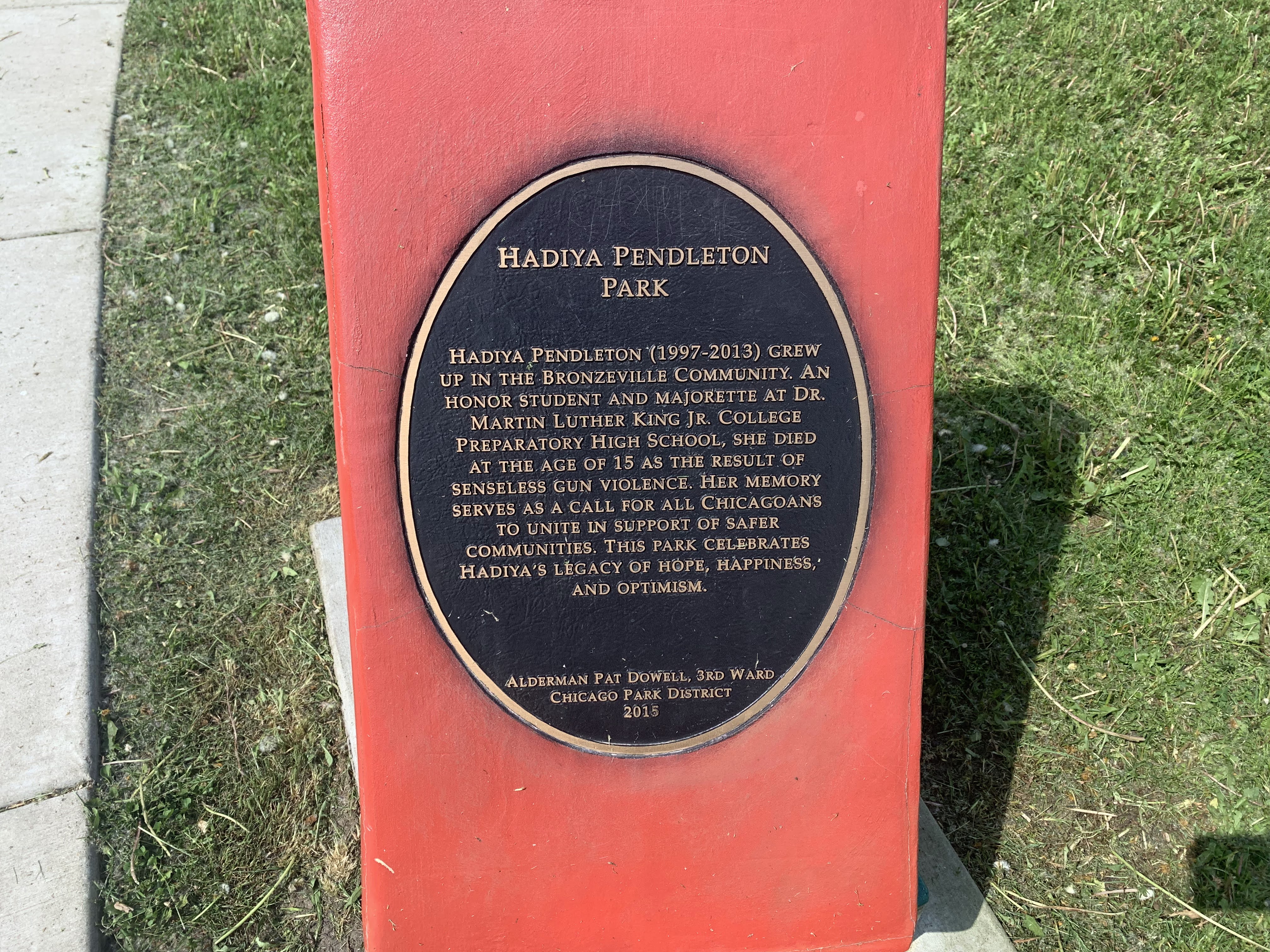 - Hadiya Pendelton Park is named after a Chicago teen killed by gun violence in 2013 and some of the parks design elements - a stack of books and a large musical motif printed on the main walking path - reflect this fact. The playground within the park isn't a traditional playground and instead consists of large, modern standalone elements. These elements include two large net climbing structures, a huge spinning platform with additional elements, a saucer swing, and a rope traverse. Immediately next to the playground is a small water spray feature with three modern spray elements. The entire park is fenced from the street but not fully enclosed. The playground surface is wood chips though there are large grassy areas throughout the park. There are benches and a drinking fountain in this bright and sunny park.