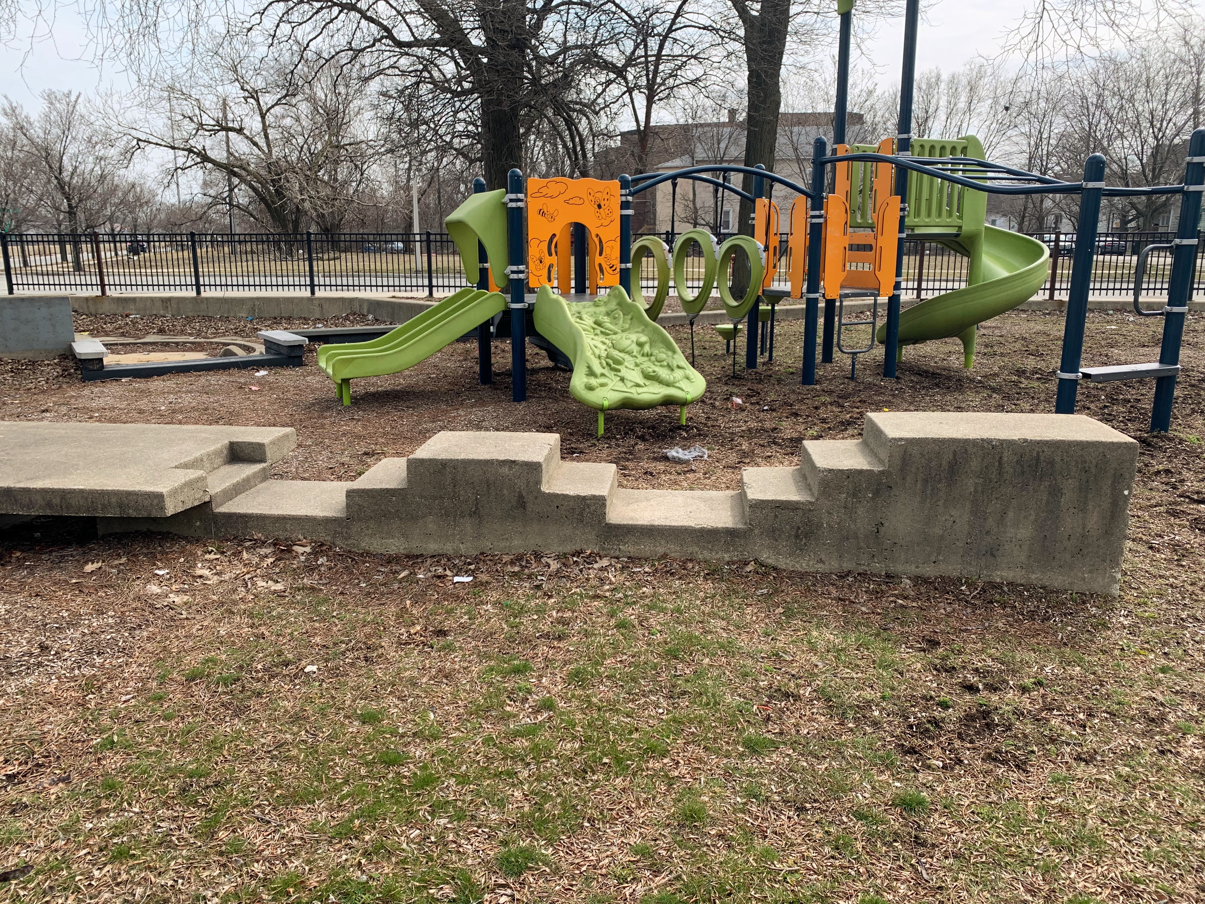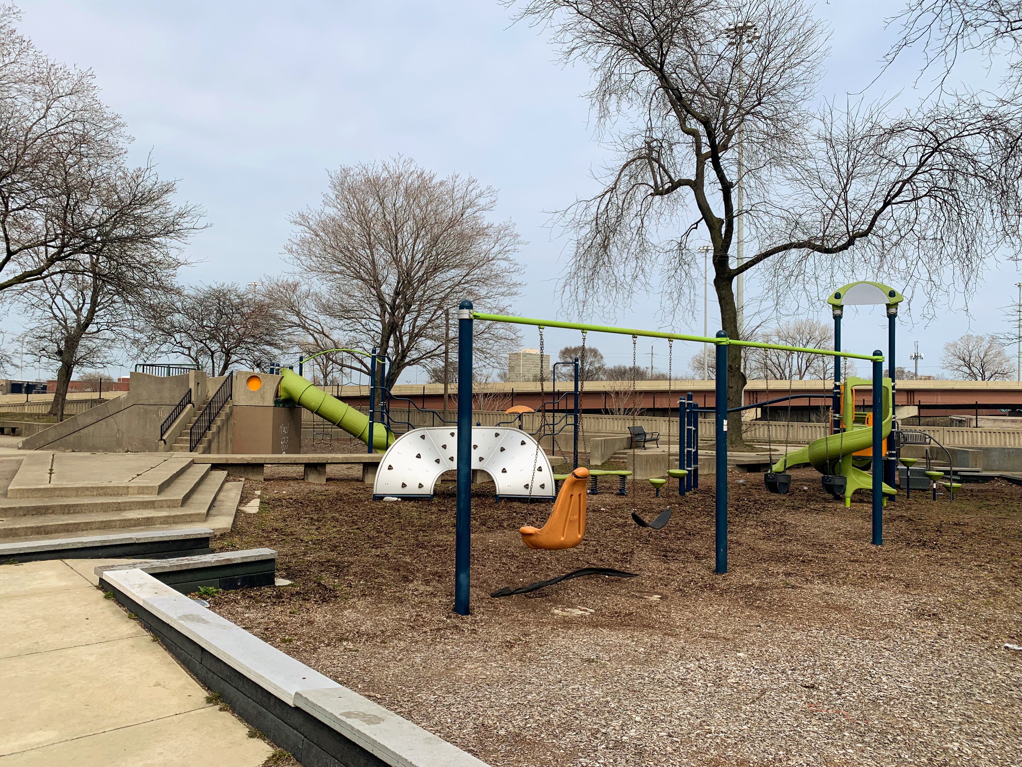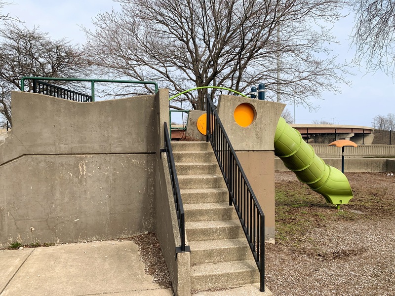 Periwinkle Park is located near the junction of the Chicago Skyway and I-94; this fact of location is relevant to the playground at this site because 1) the road noise is quite loud in the playground and 2) it may explain the concrete aesthetic for this playground. Though wood chips are the primary play surface, there is a striking amount of concrete in this park including benches, stairs, and a raised platform. One slide is somewhat integrated into the concrete and the rest of the structures seems like modern structures set between the concrete elements. So the overall aesthetic is somewhat bizarre but not terrible.