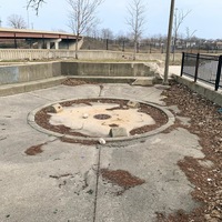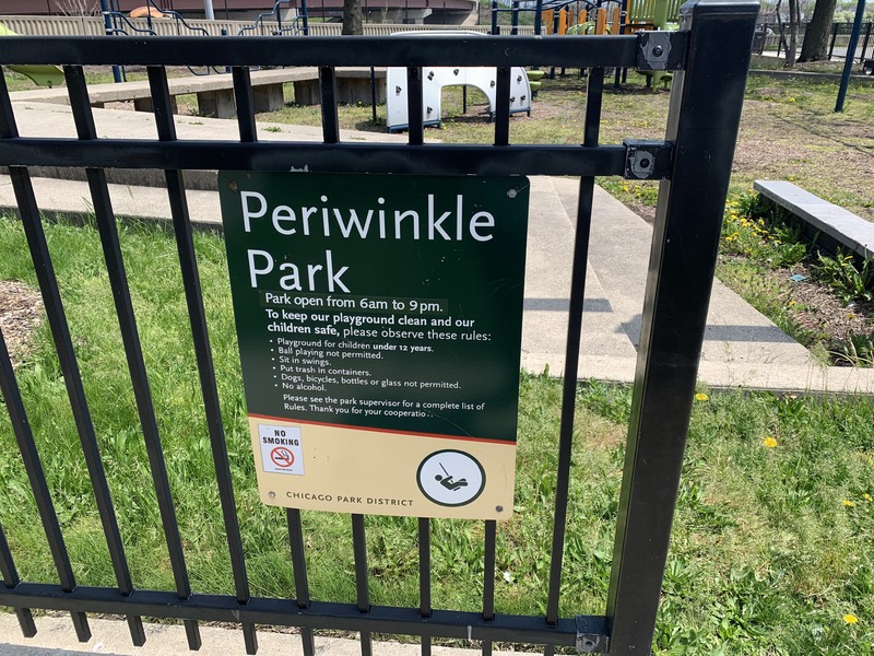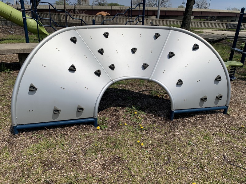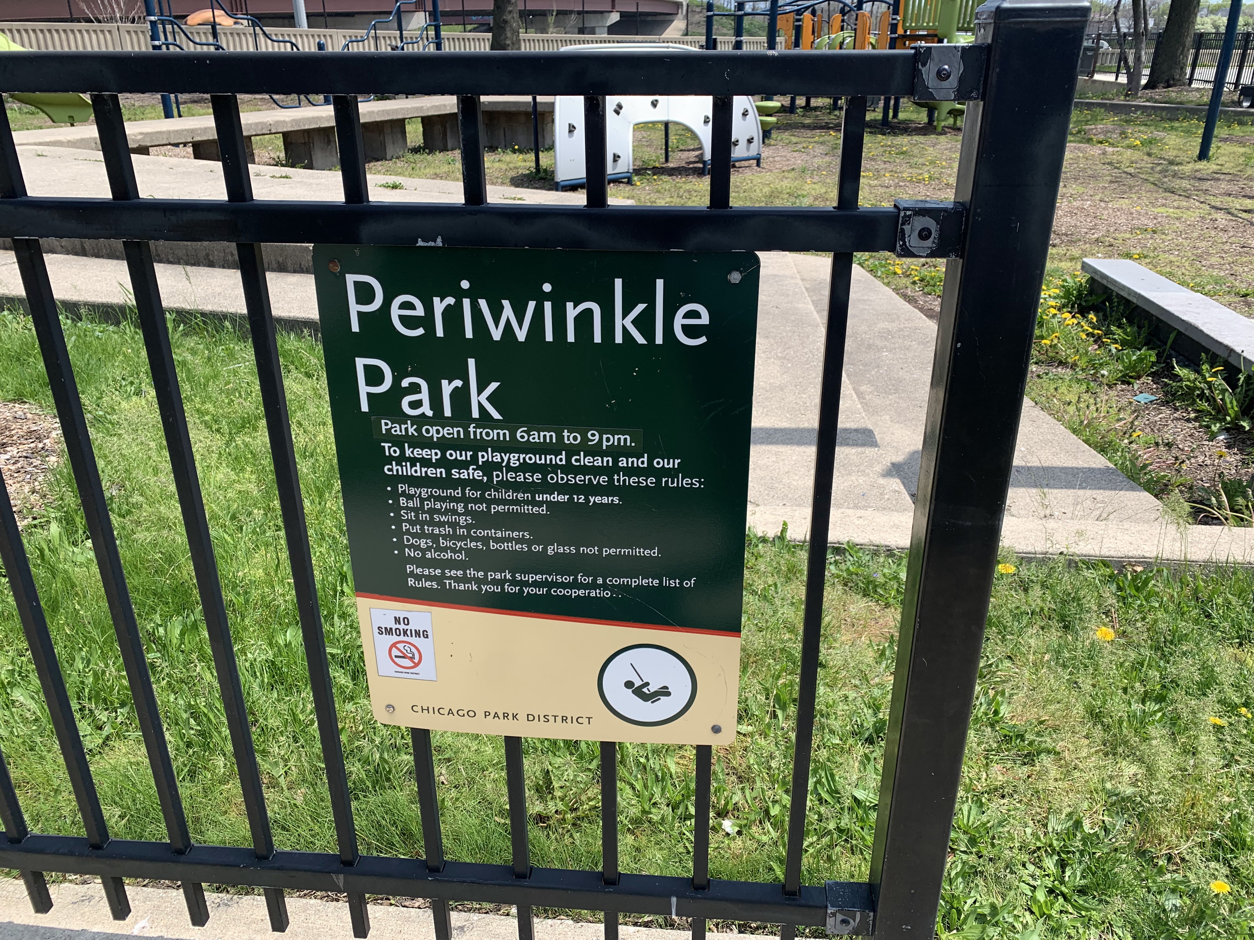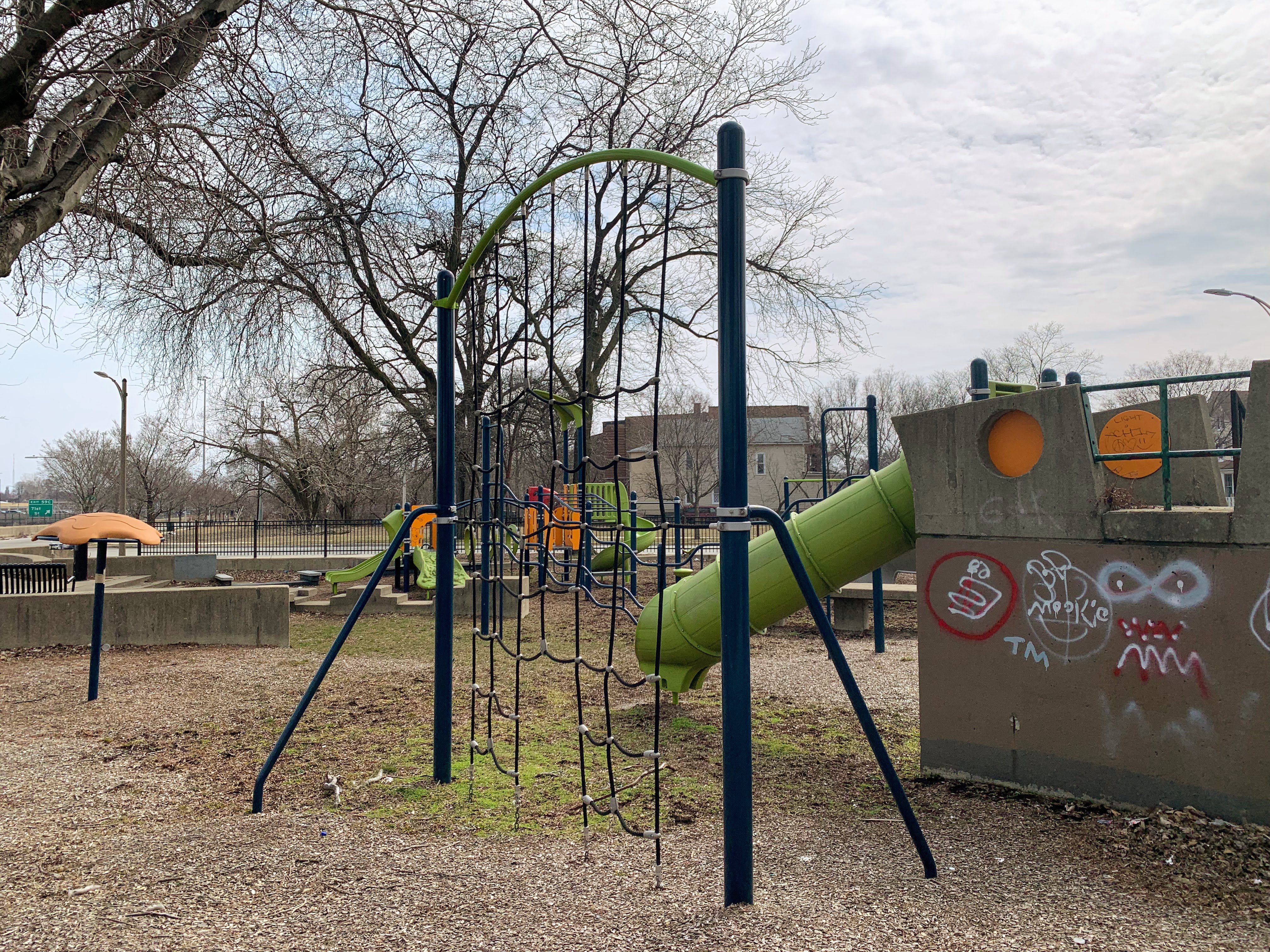 Periwinkle Park is located near the junction of the Chicago Skyway and I-94; this fact of location is relevant to the playground at this site because 1) the road noise is quite loud in the playground and 2) it may explain the concrete aesthetic for this playground. Though wood chips are the primary play surface, there is a striking amount of concrete in this park including benches, stairs, and a raised platform. One slide is somewhat integrated into the concrete and the rest of the structures seems like modern structures set between the concrete elements. So the overall aesthetic is somewhat bizarre but not terrible.
