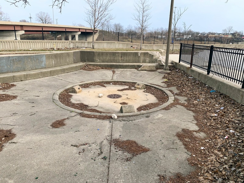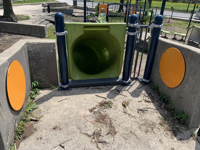 Beyond the small structure, there is a small water spray feature in a corner of the park. The play area has a few benches and gets some morning shade from tall trees to the east of the park But the playground tends to be bright, sunny, and - thanks to the highway - quite loud. - Playground Features