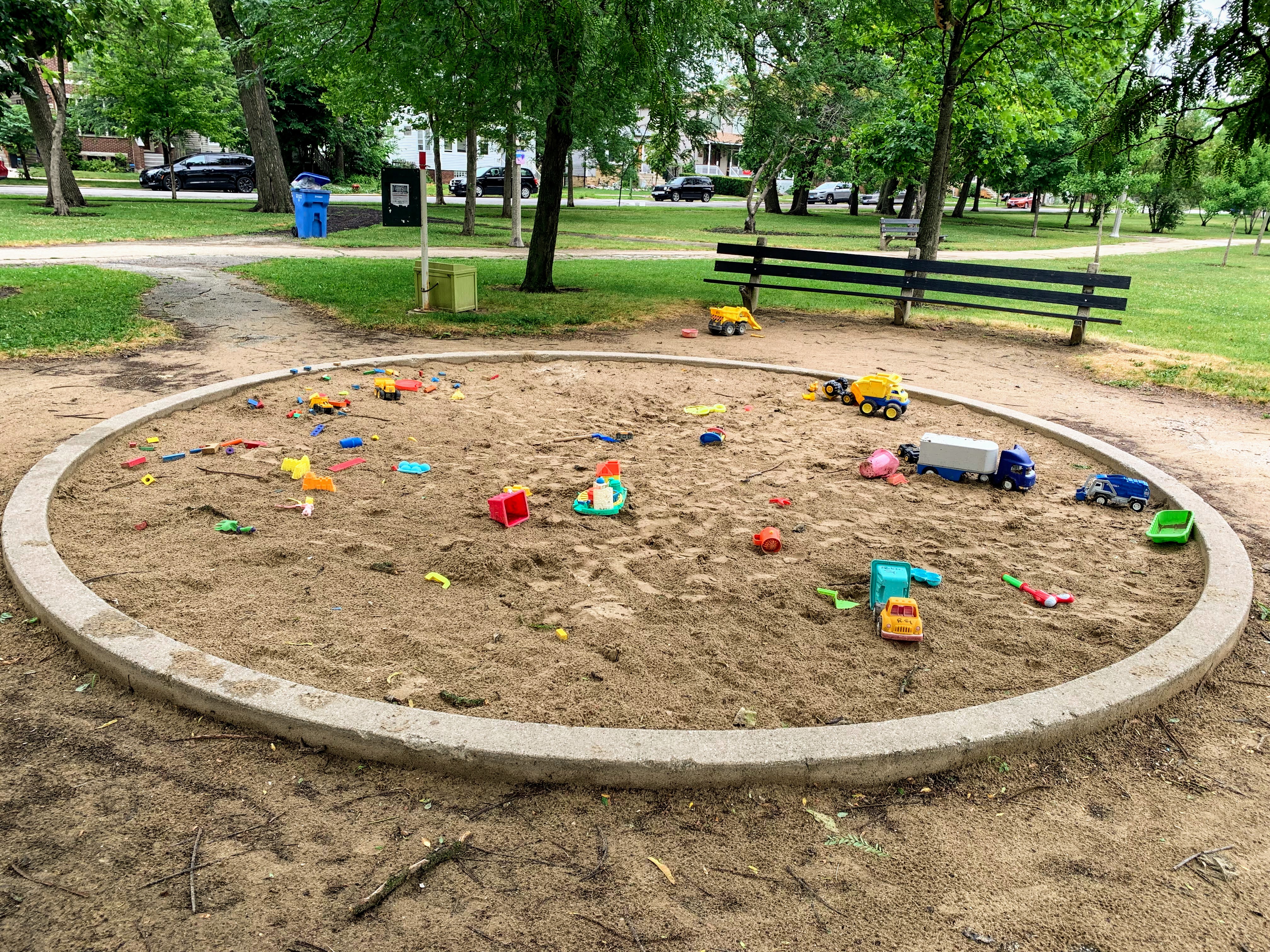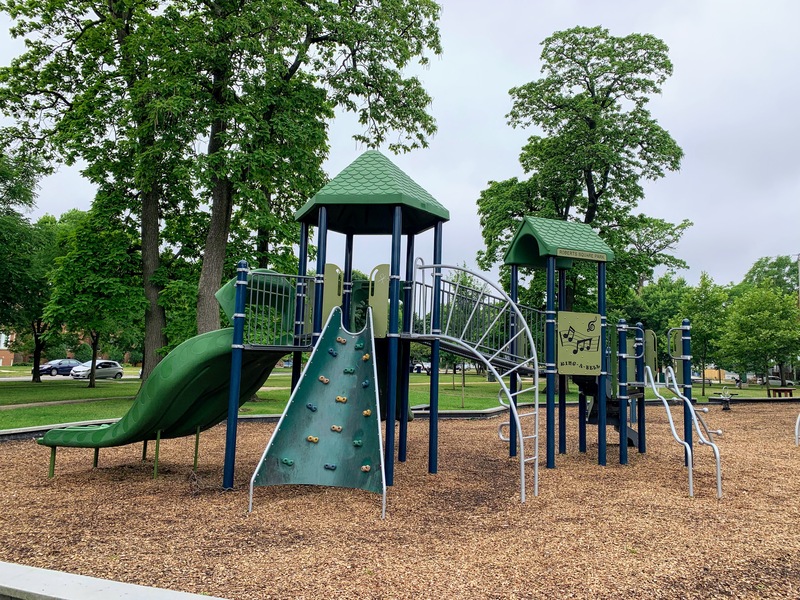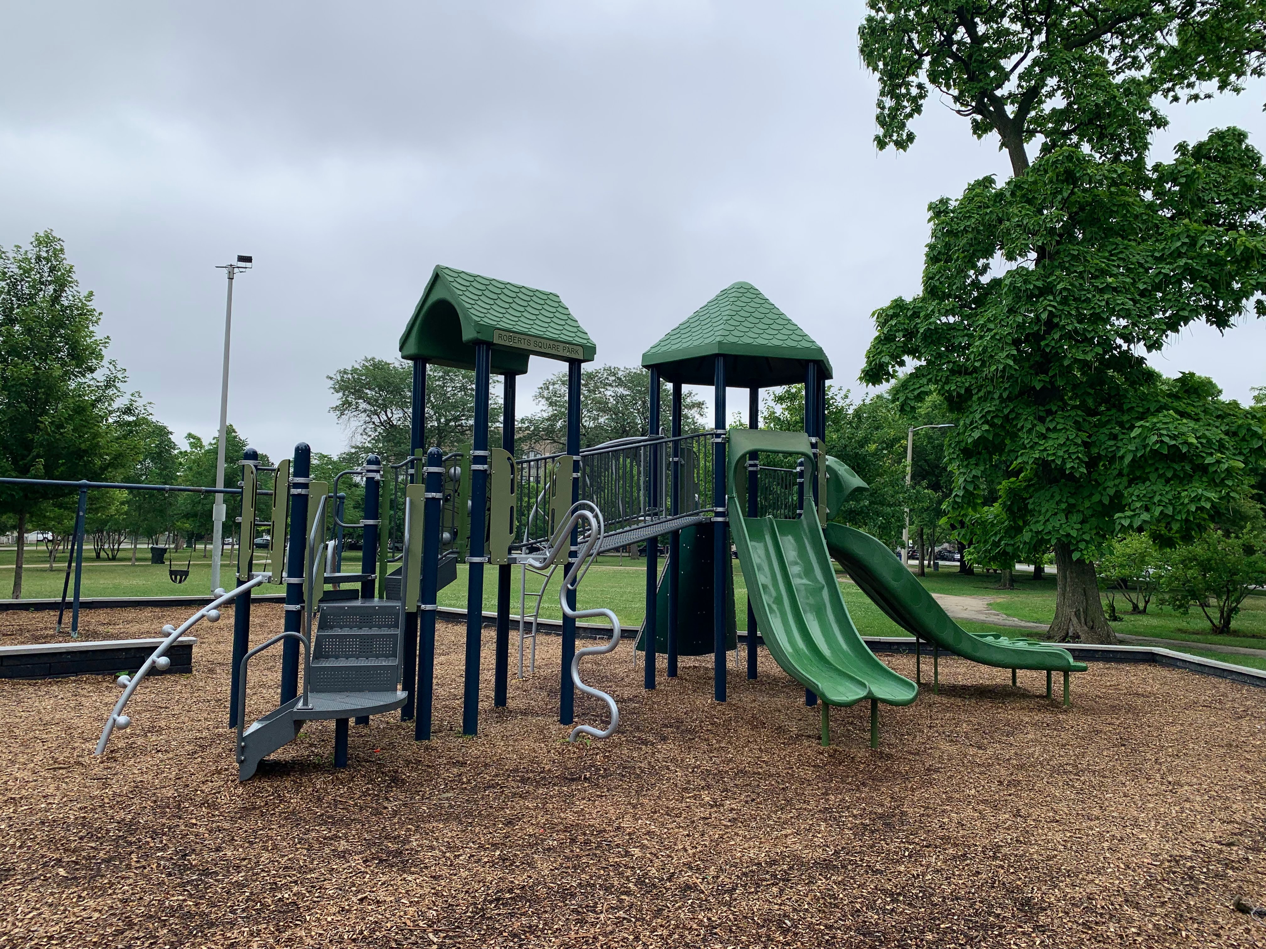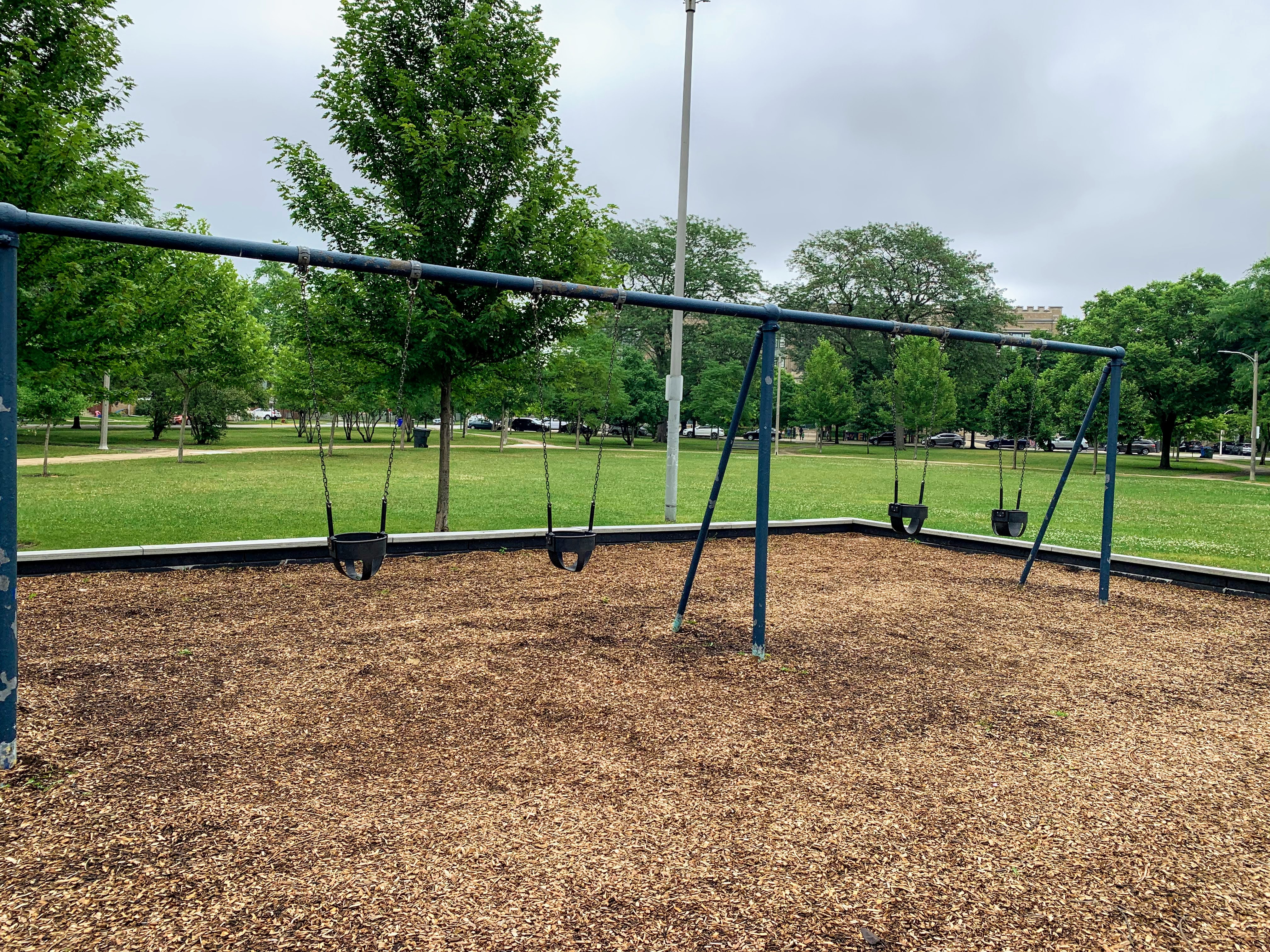 - The playground at Roberts Square Park is right in the middle of the park and features a large play structure, a variety of swings, and a sandbox. The play structure features a few slides and a variety of climbing elements (though no monkey bars) and there is a small, twisting metal structure with climbing wall holds. There are the standard Chicago Park swings (toddler, adaptive, and belt seat) as well as a tire swing. There are also a few standalone elements and a playhouse as well as a sand play area. Neither the playground nor the park are fenced from the street though the playground has short walls that provide some informal seating and a sense of boundaries. The main play surface is wood chips and large mature trees provide some shade in this otherwise bright and sunny park.