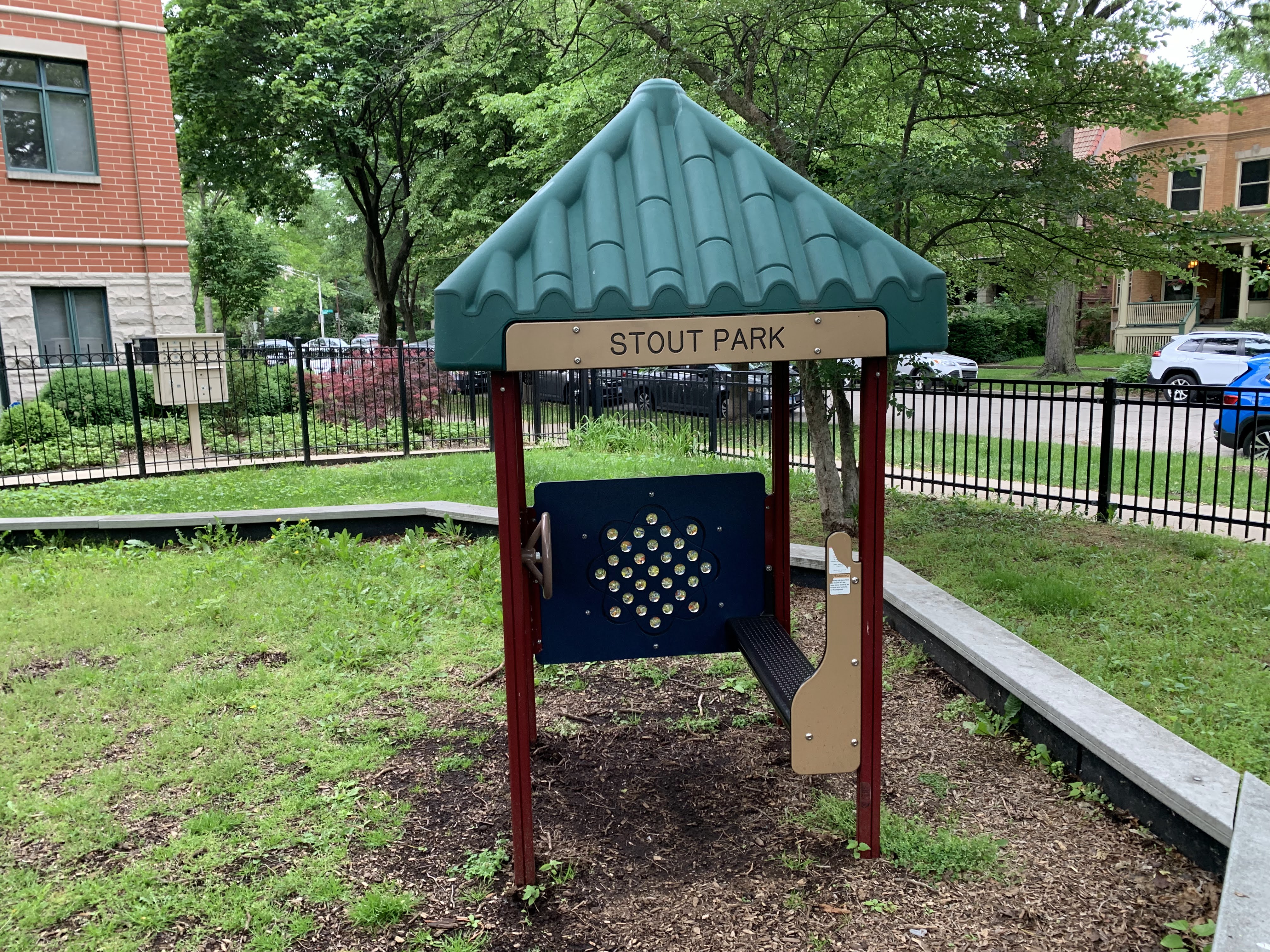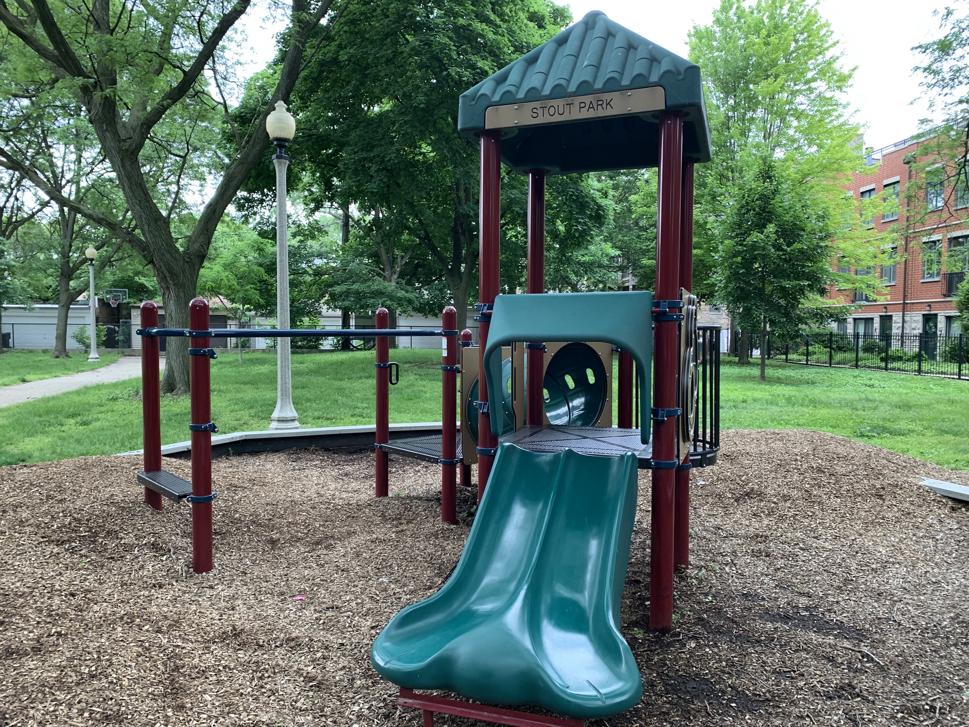 - This playground - one of two in Stout Park - is located in the northeast corner of the park and is designed for younger children. It features a small play structure, low-to-the-ground monkey bars, two toddler swings, and a little play house. The play surface is wood chips and the play area is fully enclosed (and opens to the rest of Stout Park). There are a few benches and the area is heavily shaded by large trees.