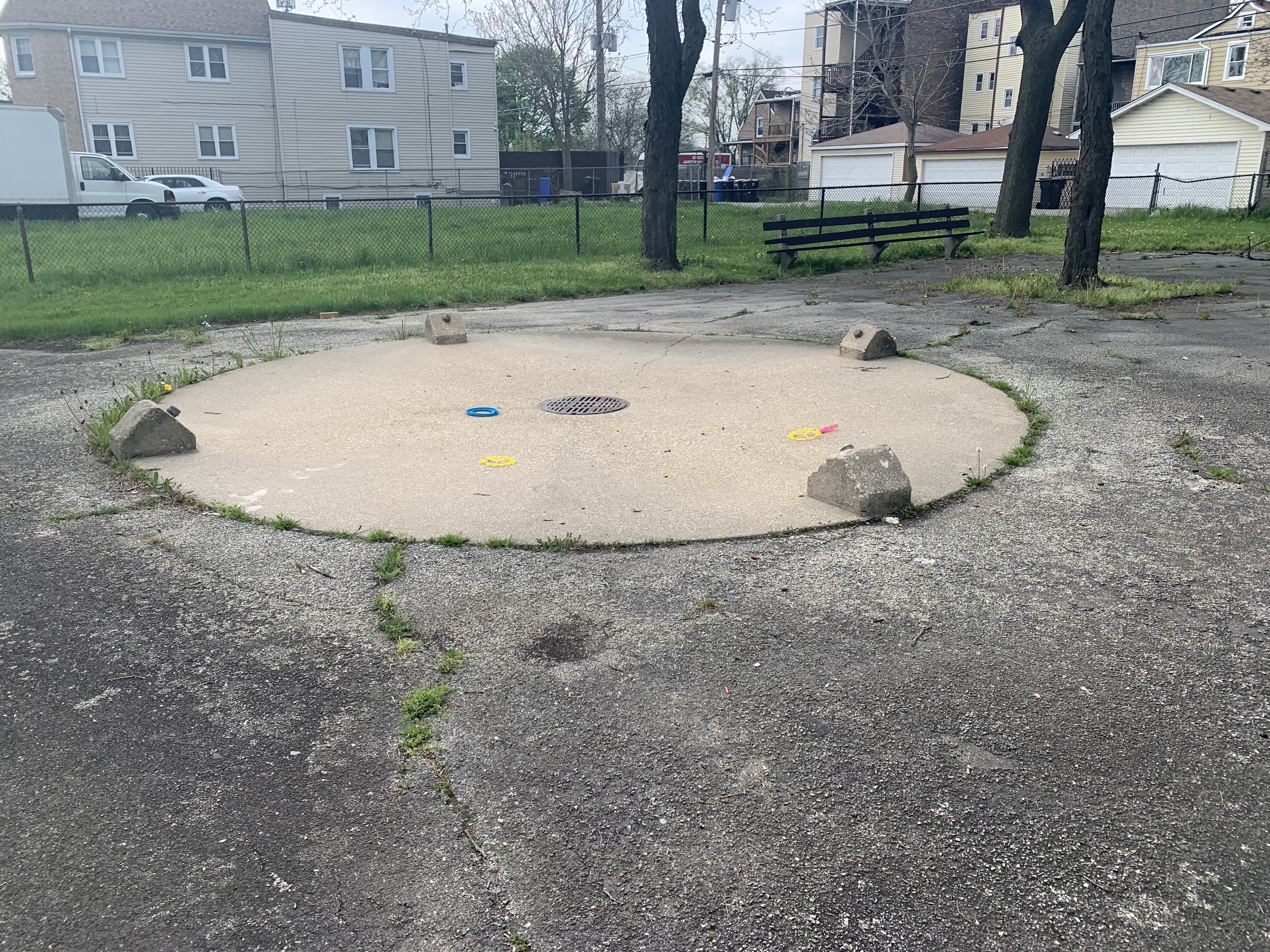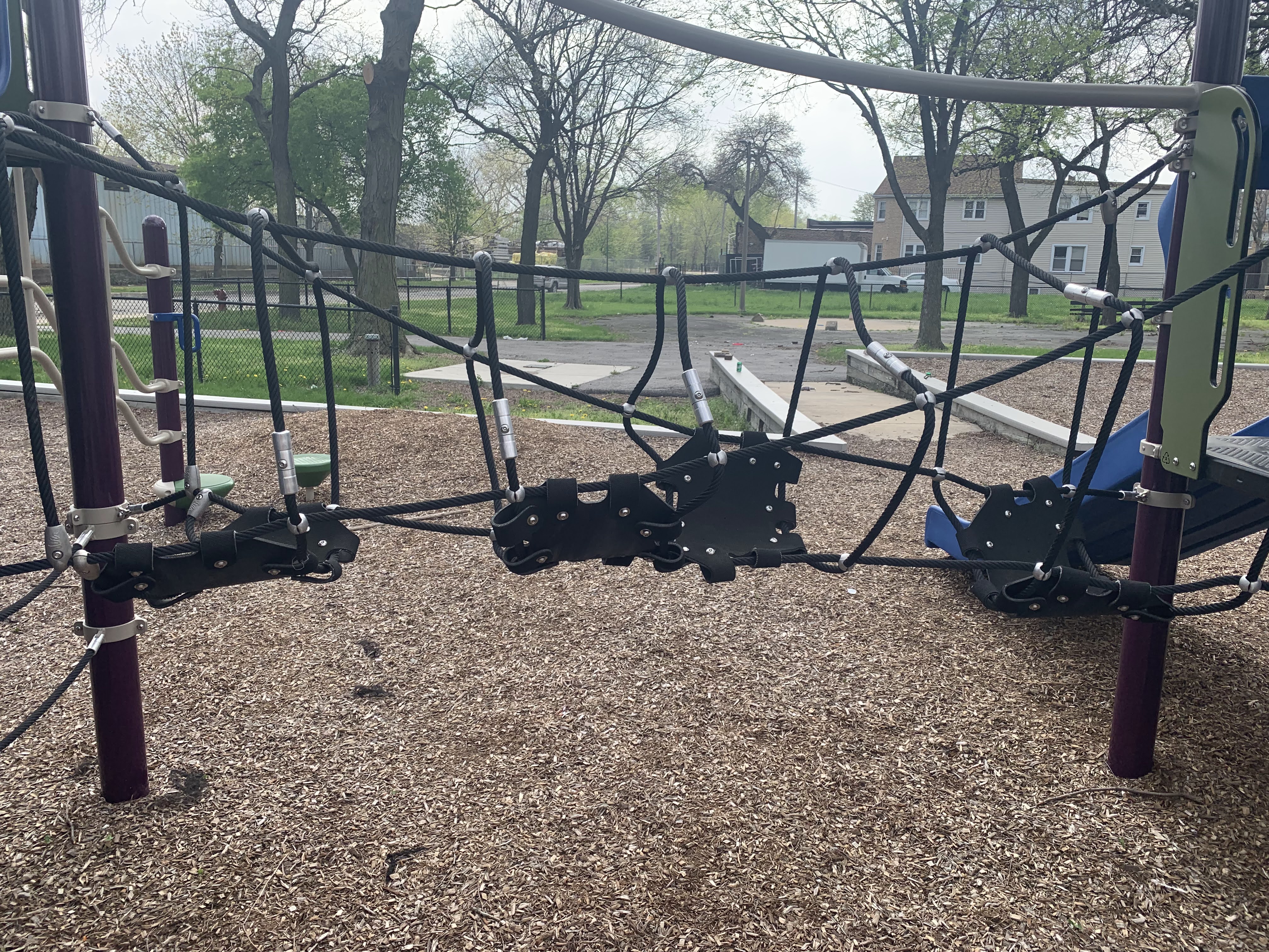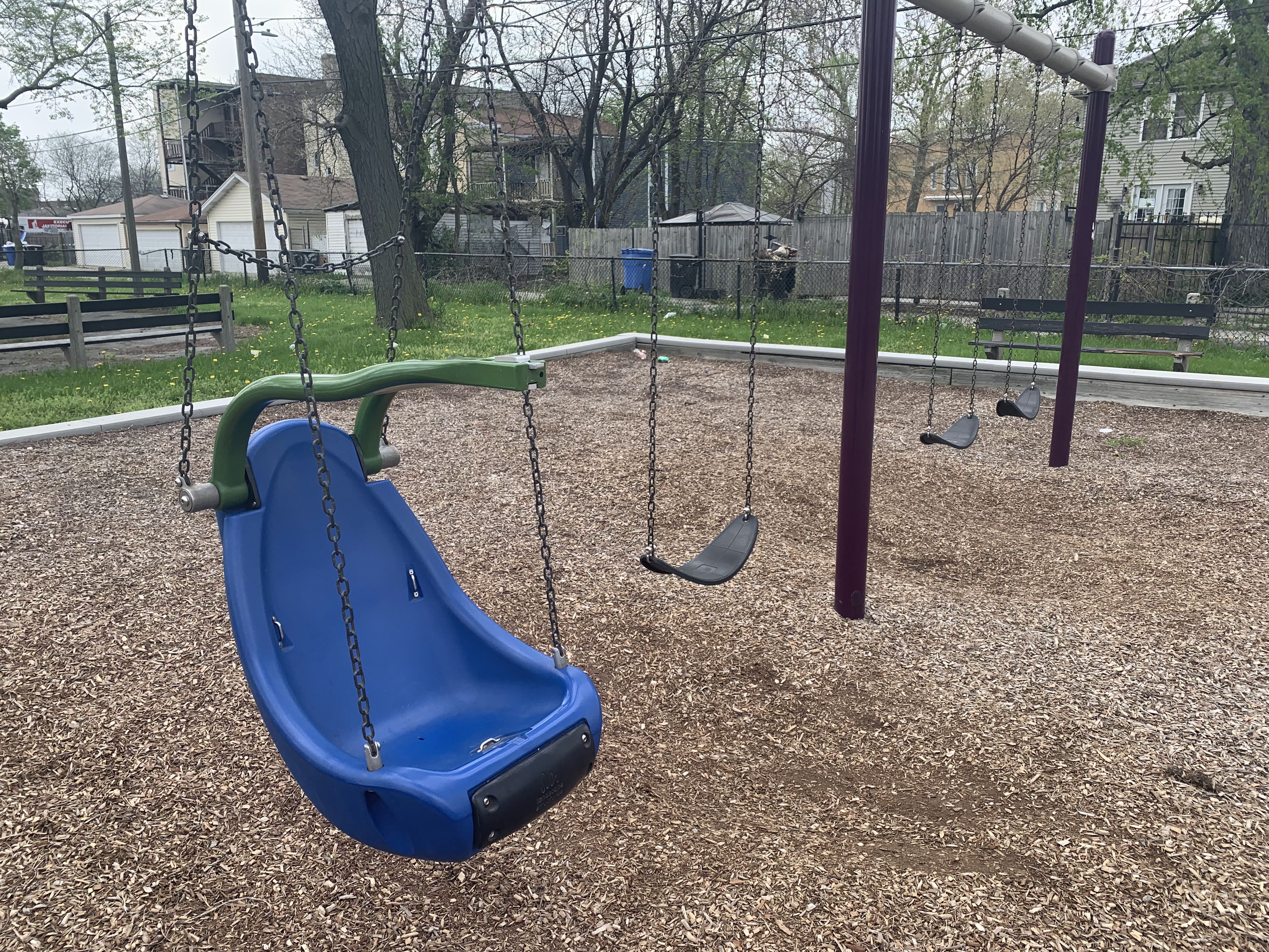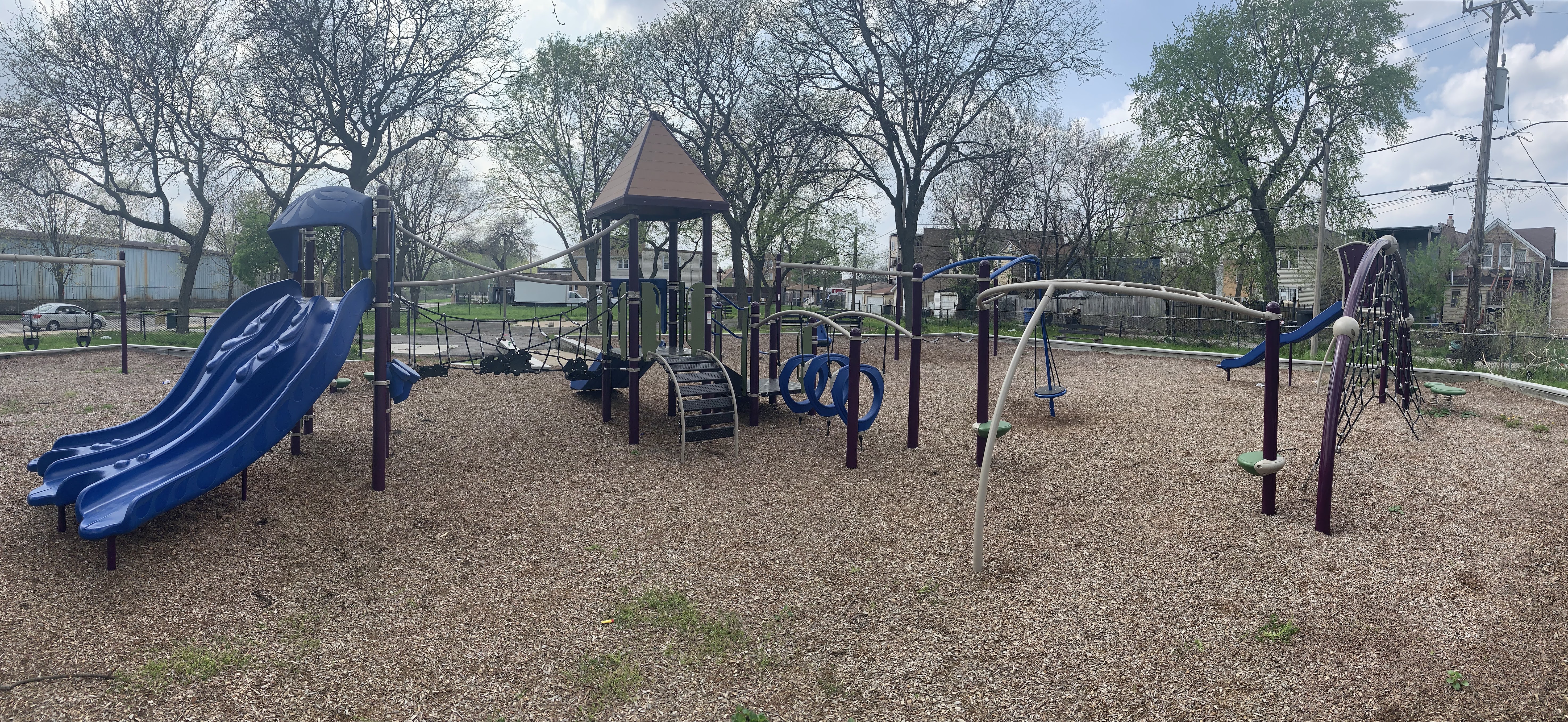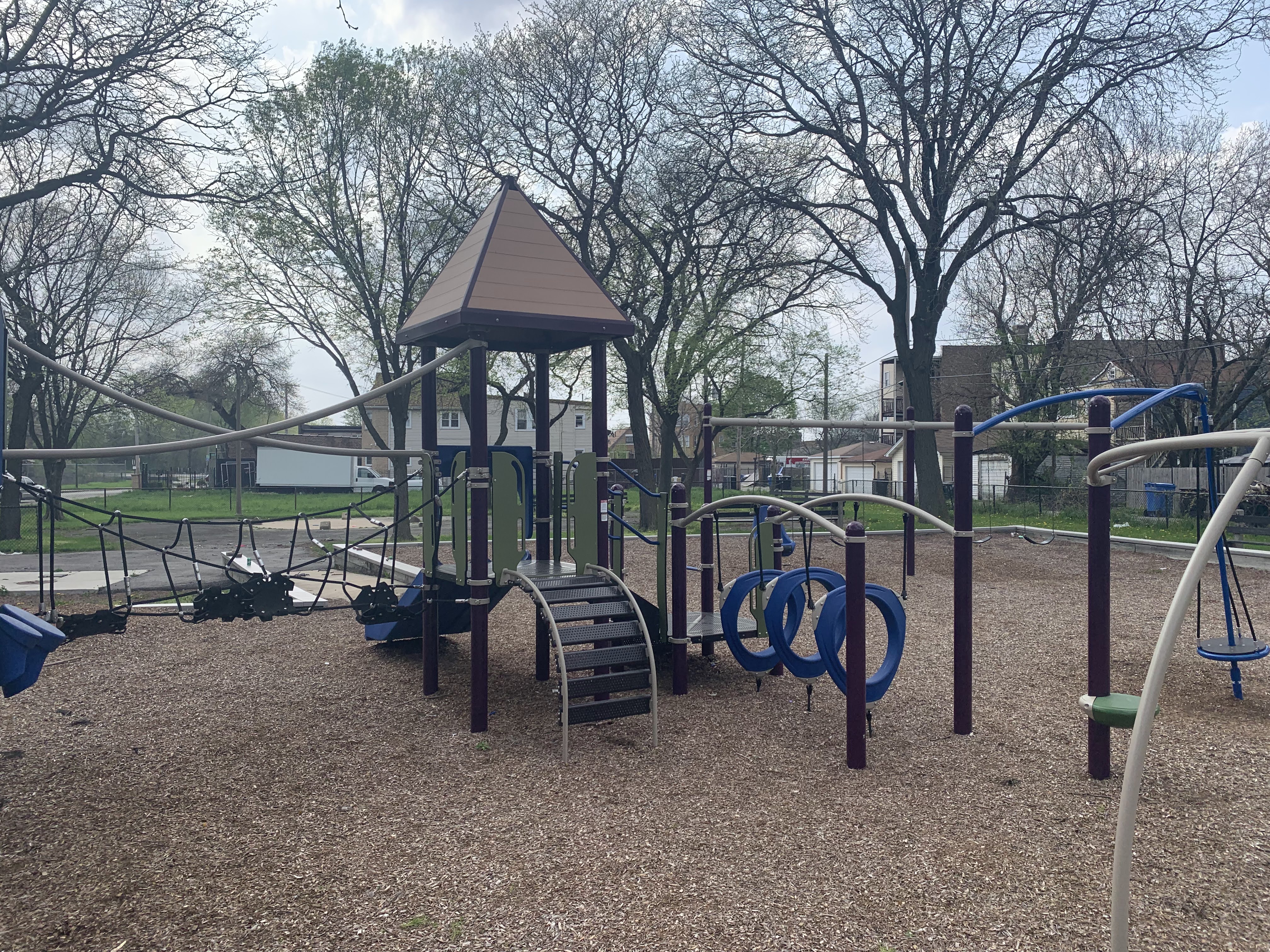 - Violet Park is a small neighborhood park with a large playground structure, two sets of swings, and a water spray feature. The playground structure is quite large and contains a few slides, climbing elements, overhead elements, and traversing elements. The swings sets are standard for Chicago parks and the water feature is a standard 'four sprayer.' Large trees on the west side of the play area provide some shade and there are also a few benches for comfort. The play surface is wood chips and the play area is fenced from the street but not fully enclosed.