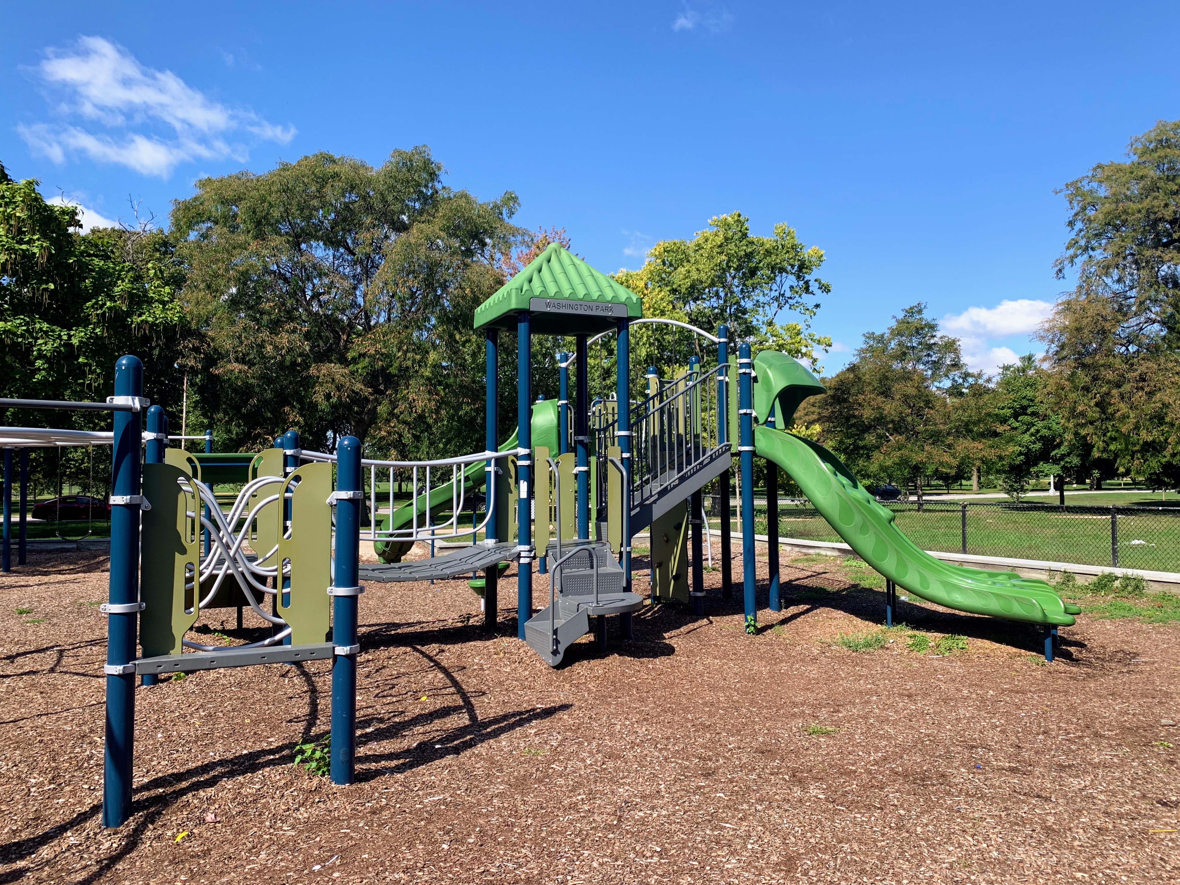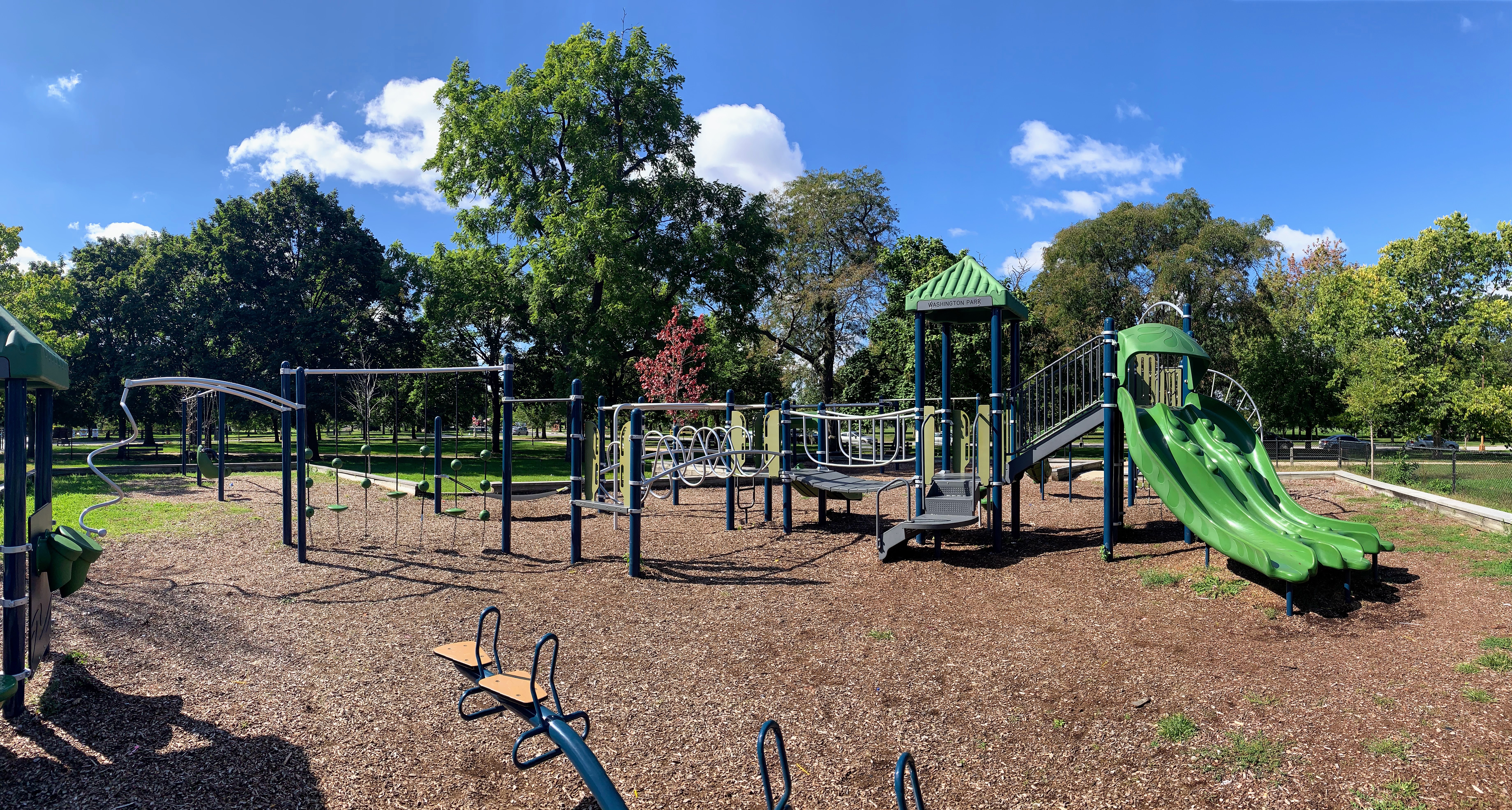 - This playground - one of four in Washington Park - is located on the east side of the park just north of 55th street. It features a large and sprawling play structure with a variety of swings. The structure is pretty standard and offers lots of standard play elements (slides, climbing elements, monkey bars) and overall works quite well. There are swings - toddler, adaptive, belt seat, and a tire swing - as well as a few small standalone elements. The amenities are just the basics: a few wooden benches and a play surface of wood chips. Nearby trees provide some shade but the playground itself is bright and sunny.