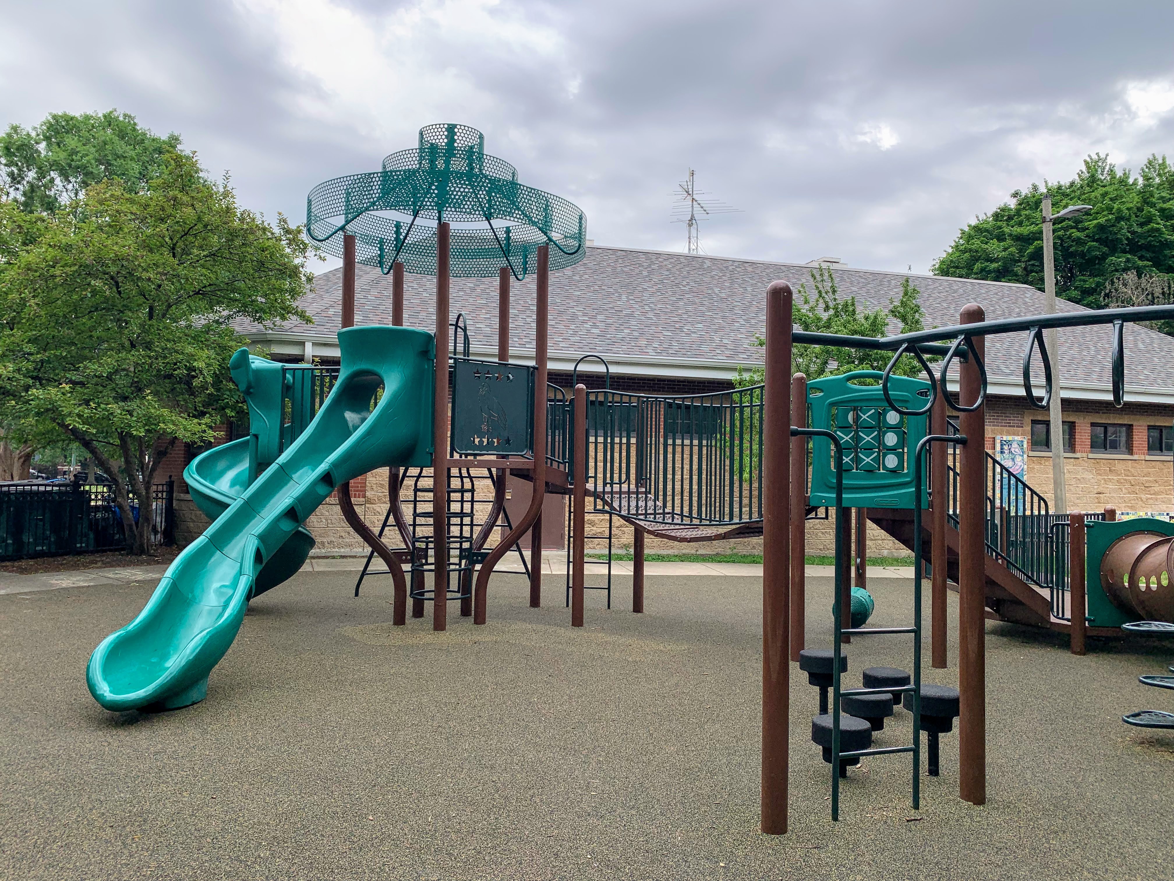 The other amenities of the park are also very solid. The playground is fully enclosed and the play surface is soft rubber. There are benches, picnic tables, and a drinking fountain in the play area and the nearby fieldhouse provides access to bathrooms (when open). There are even some trees that provide some shade throughout the day. All in all a great playground; highly recommend. - Playground Features