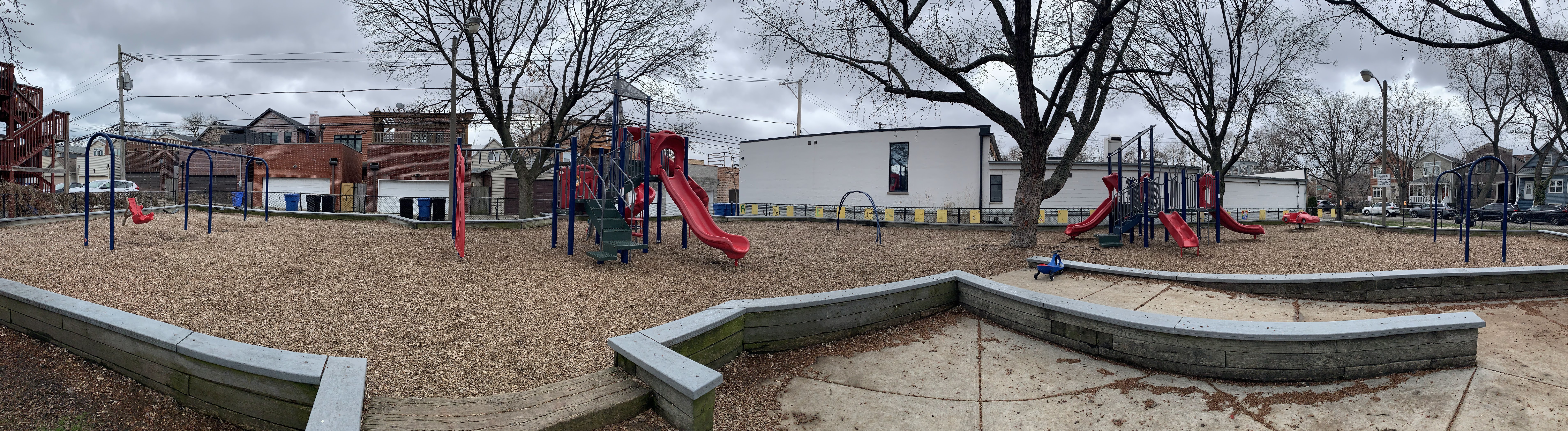 - This small and shady park features a variety of unique equipment. There are two areas with swings, another area designed for older children, and another area for younger children. The play area is large and consumes nearly the entire small site. The Metra tracks are immediately to the west of the playground and the passing of trains interrupts the general quiet of the neighborhood. The surface is wood chips and there are two benches.