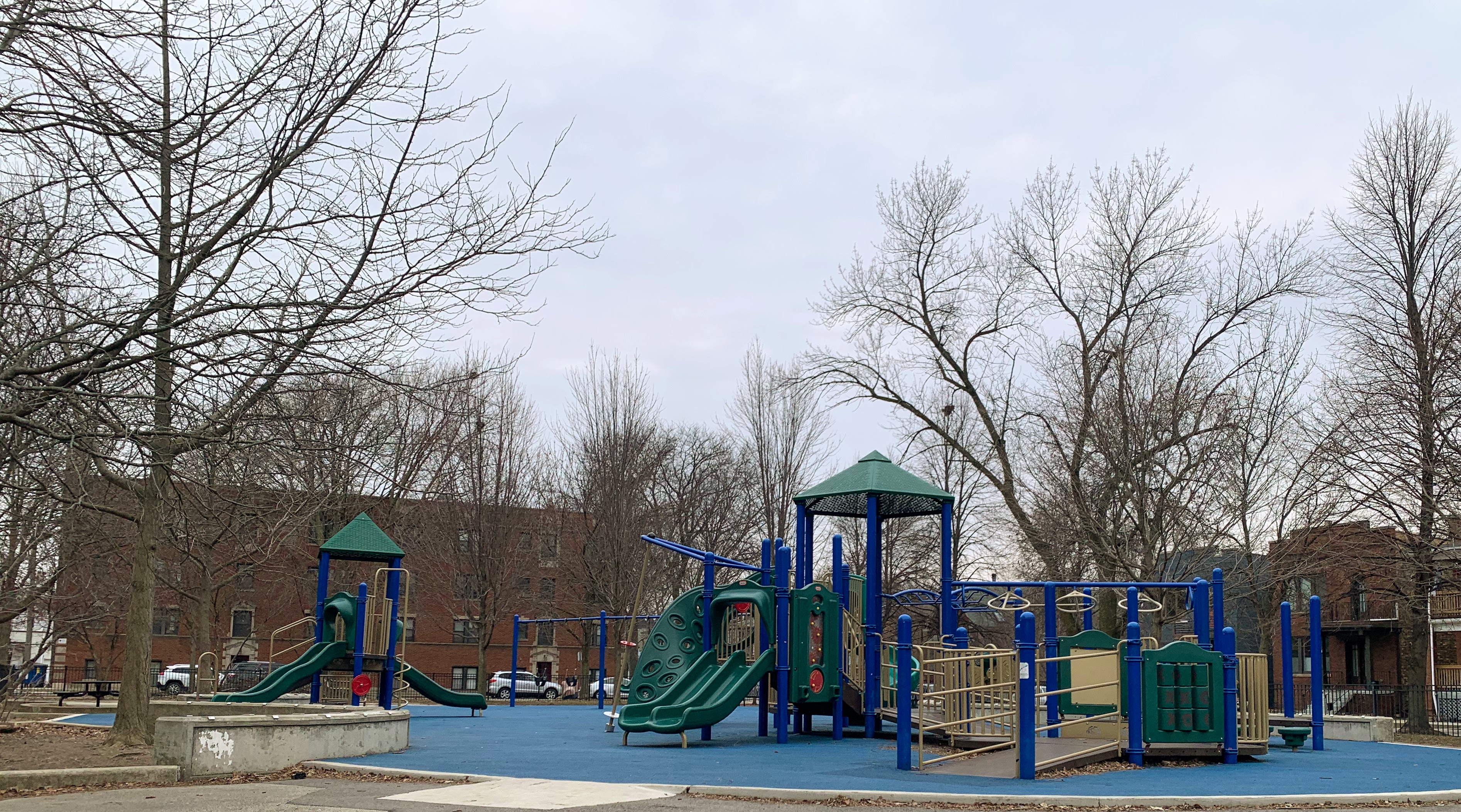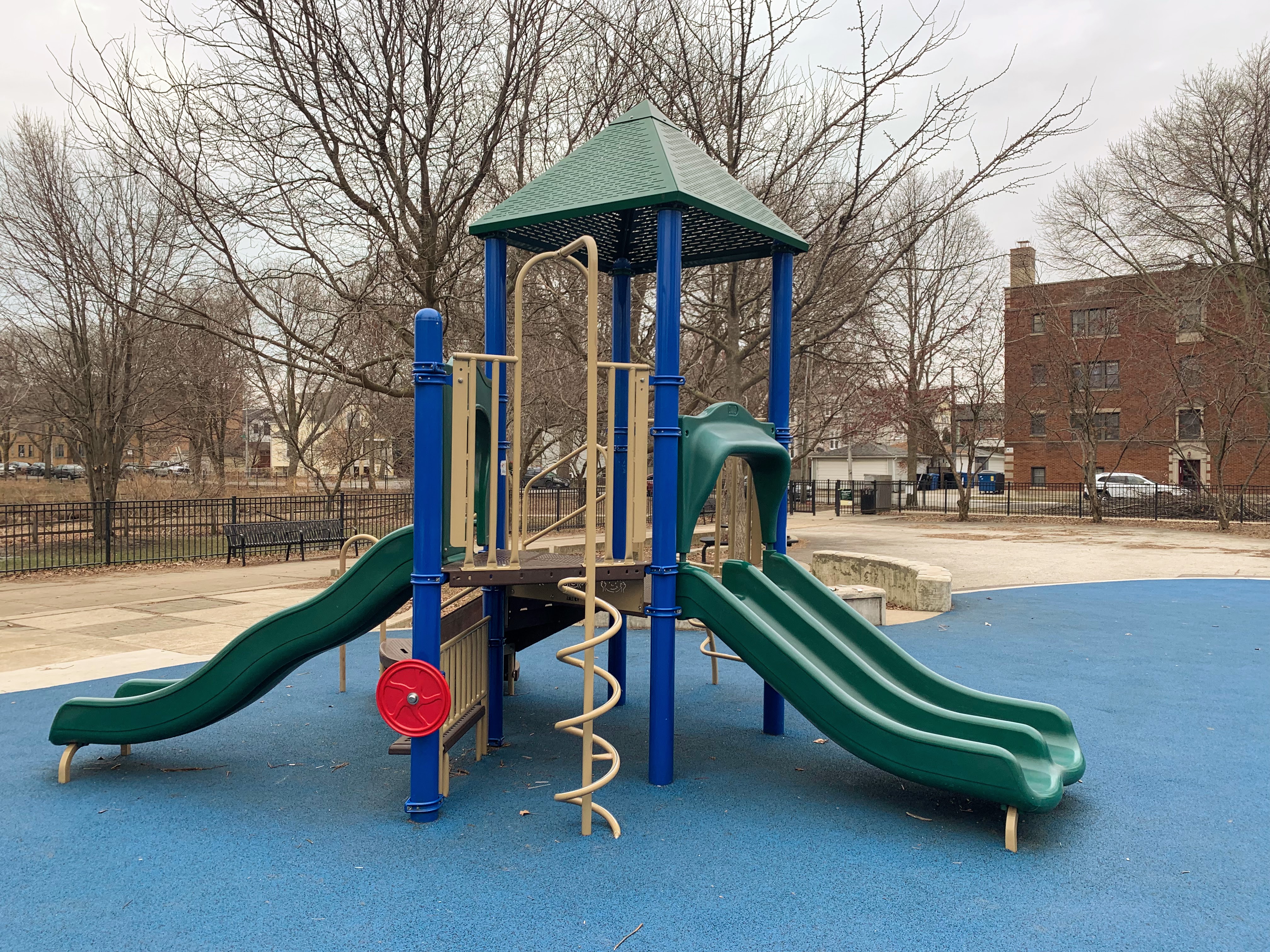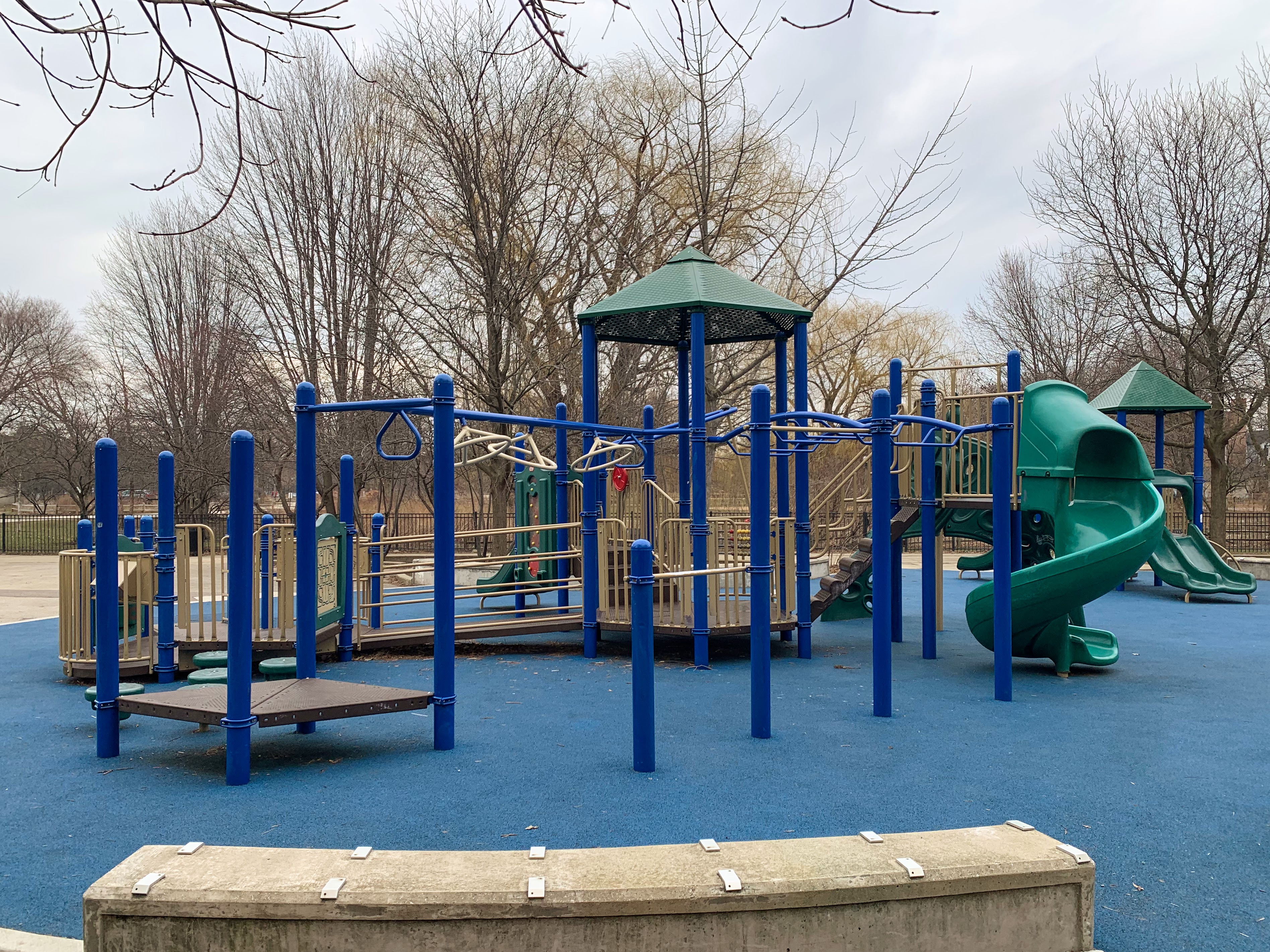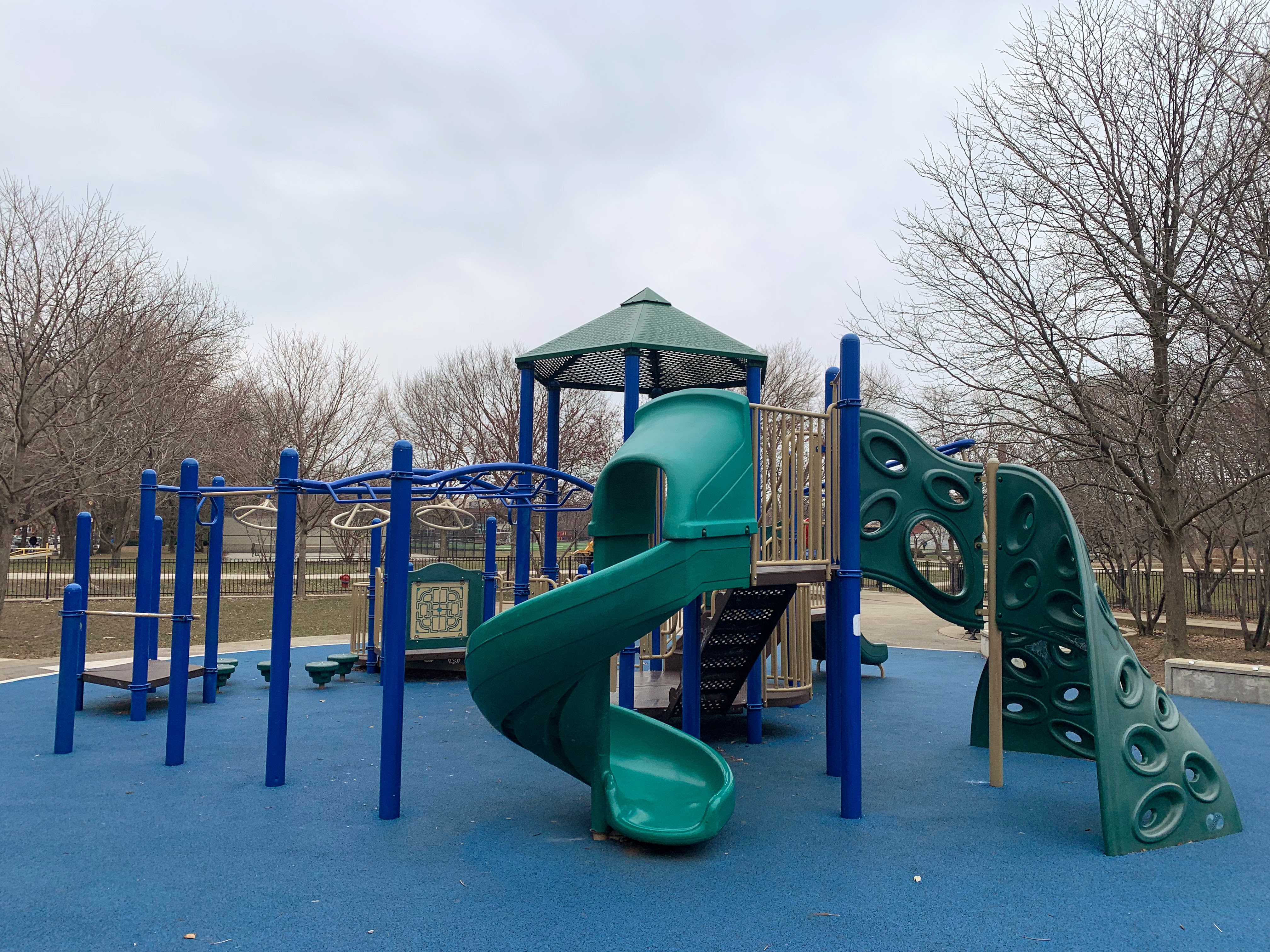 - Located in the southwest corner of Winnemac Park, this playground has lots of play structures and other amenities. There is a larger play structure for older children, a smaller play structure for younger children, and the standard set of swings. The play area is quite large and fully enclosed and uses a combination of soft rubber, concrete, and grass as the play surface. Mature trees on all sides provide spots of shade throughout the day and there are benches and picnic tables within the play area. In total, these features and amenities make this a wonderful and popular playground.