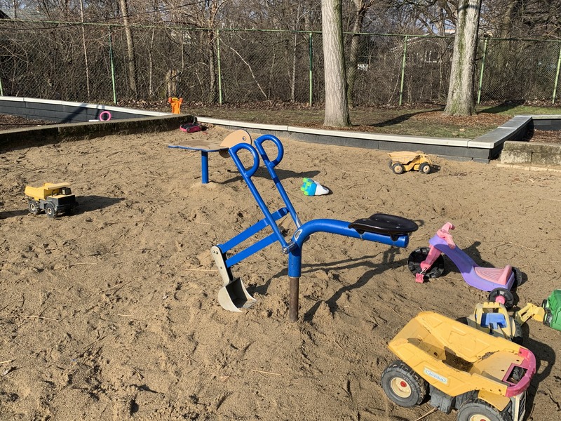 - A standalone piece of equipment with a fixed seat, a bucket, and two handles whereby the user can scoop and dump sand.