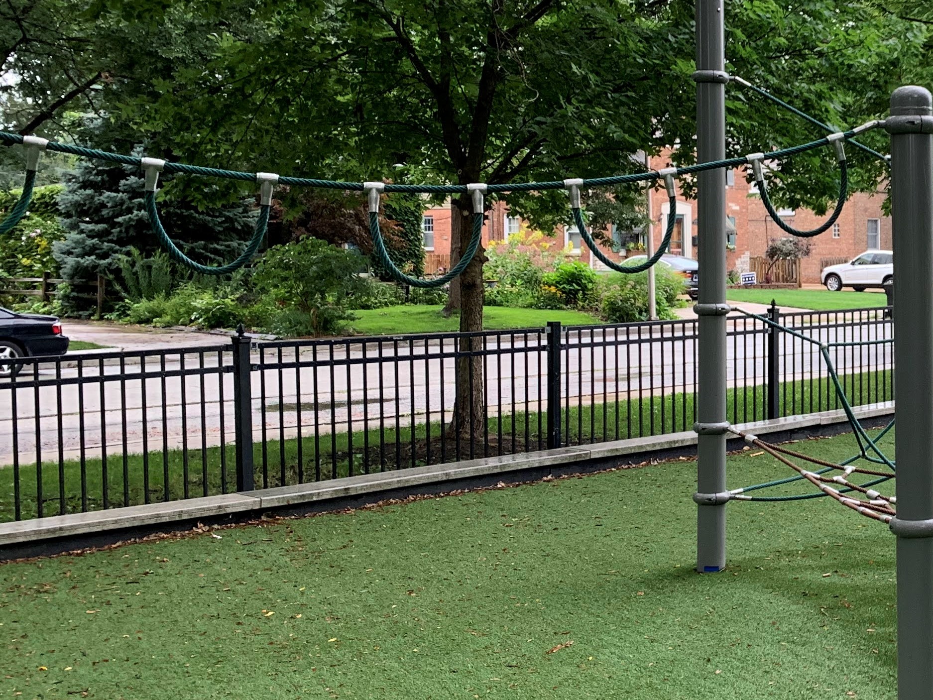 - A single rope suspended horizontally between two posts with several U shaped loops attached to the horizontal rope.