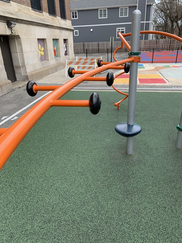 - An overhead element consisting of a single beam with alternating hand holds; each hand hold has a end cap.
