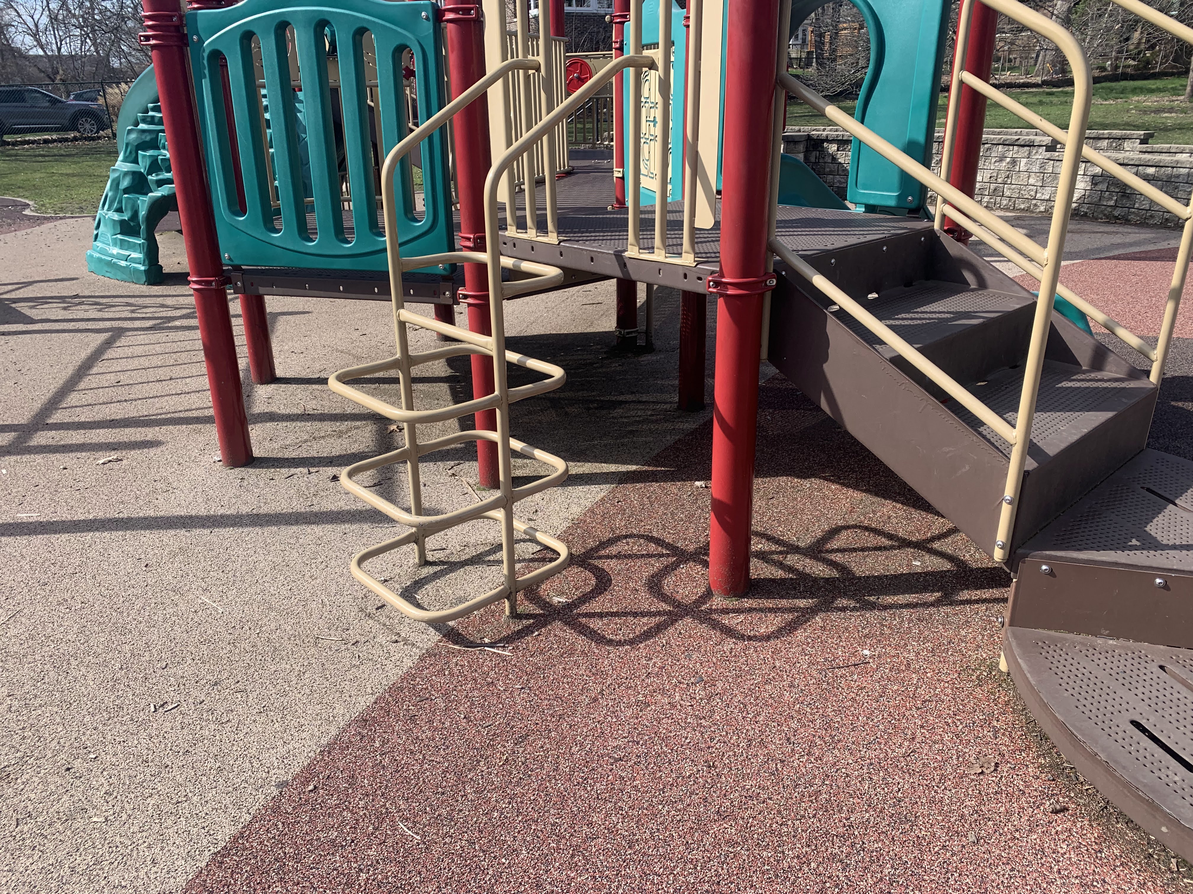 - A climbing element with two vertical supports that angle toward the platform with steps created by metal squares with rounded corners attached to the supports .