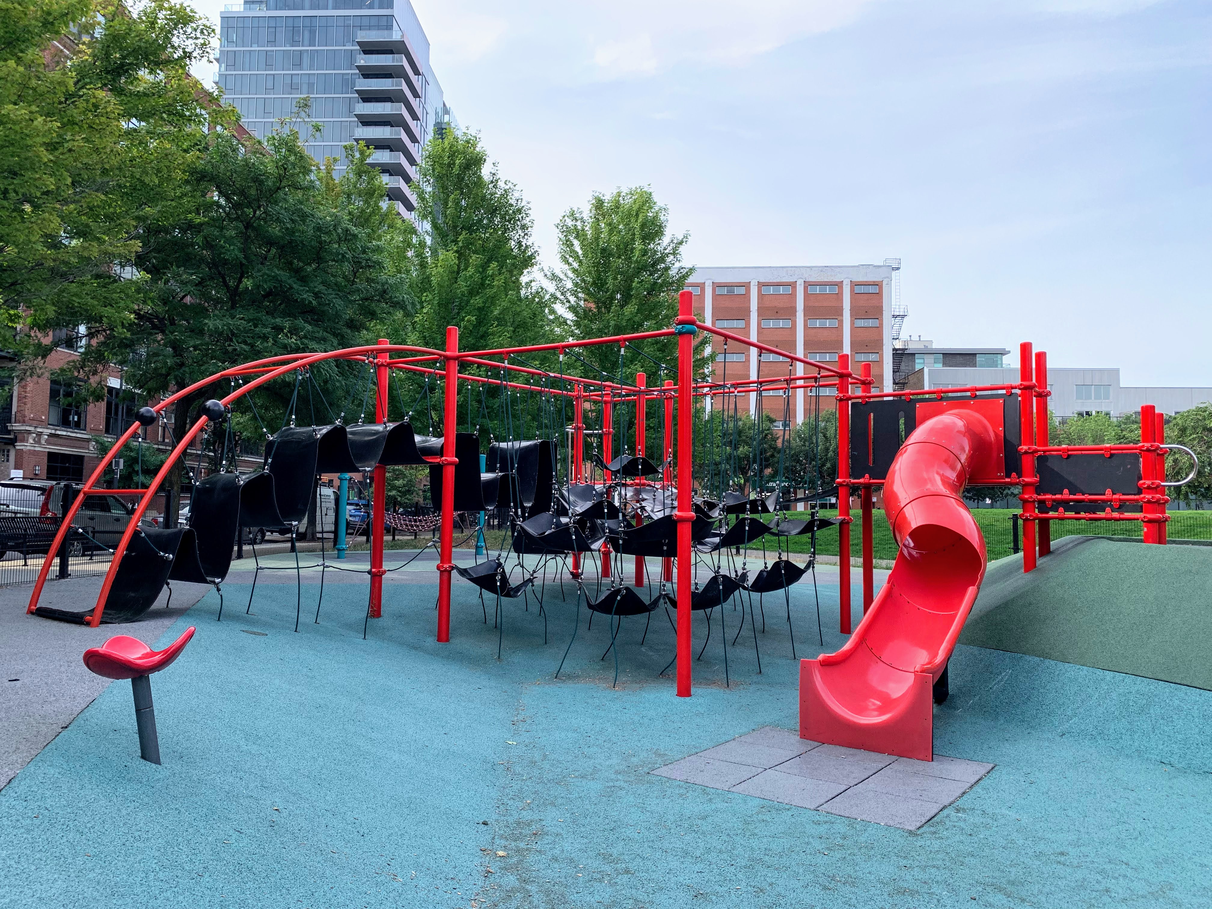 A unique play structure at Bartelme Park, this consists of a a belt made of black rubber crafted into a wavy bridge and a three dimensional jungle gym structure.