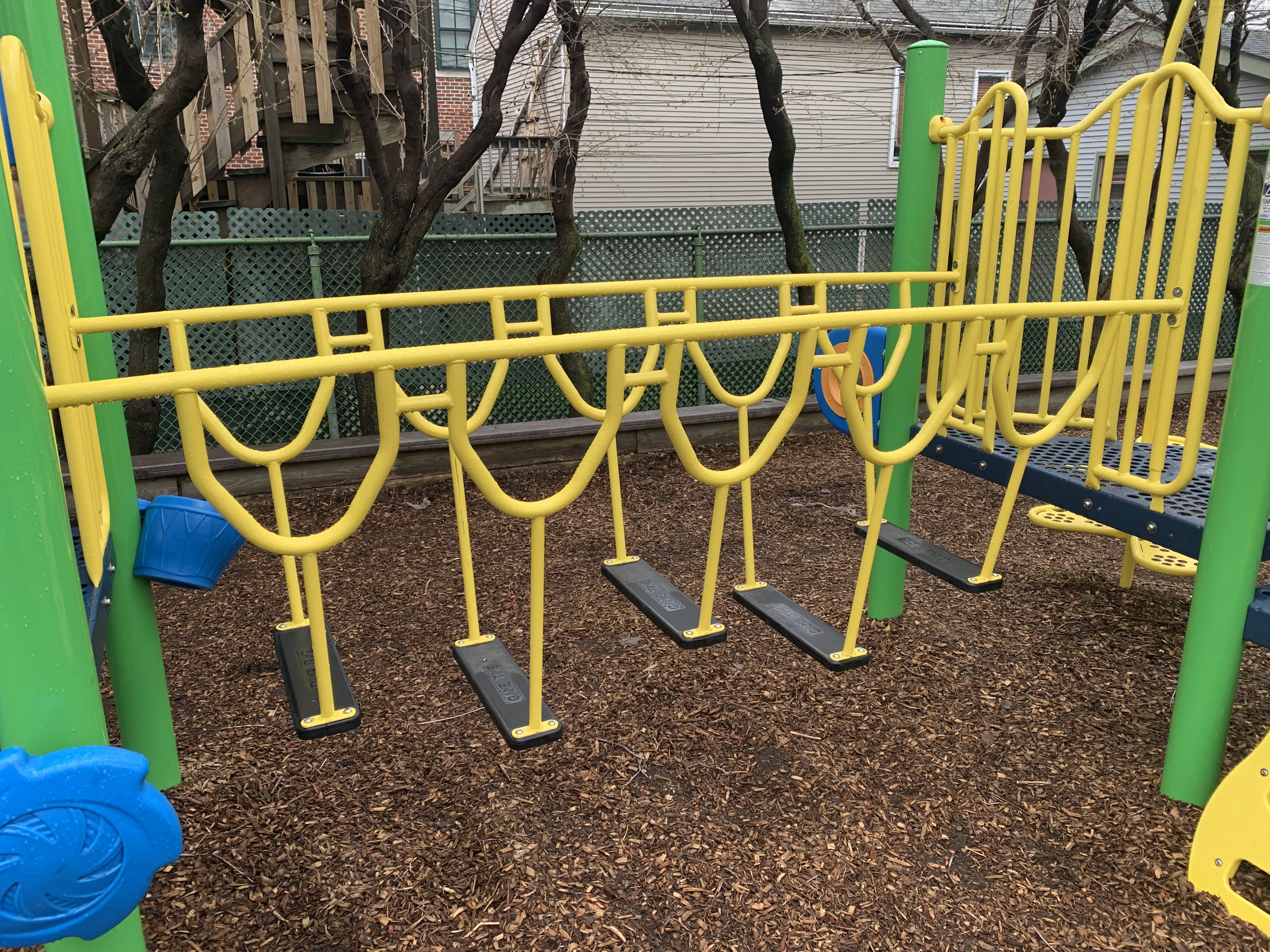 A bridge element connecting two platforms where each step is suspended by two metal poles from the two horizontal supports.