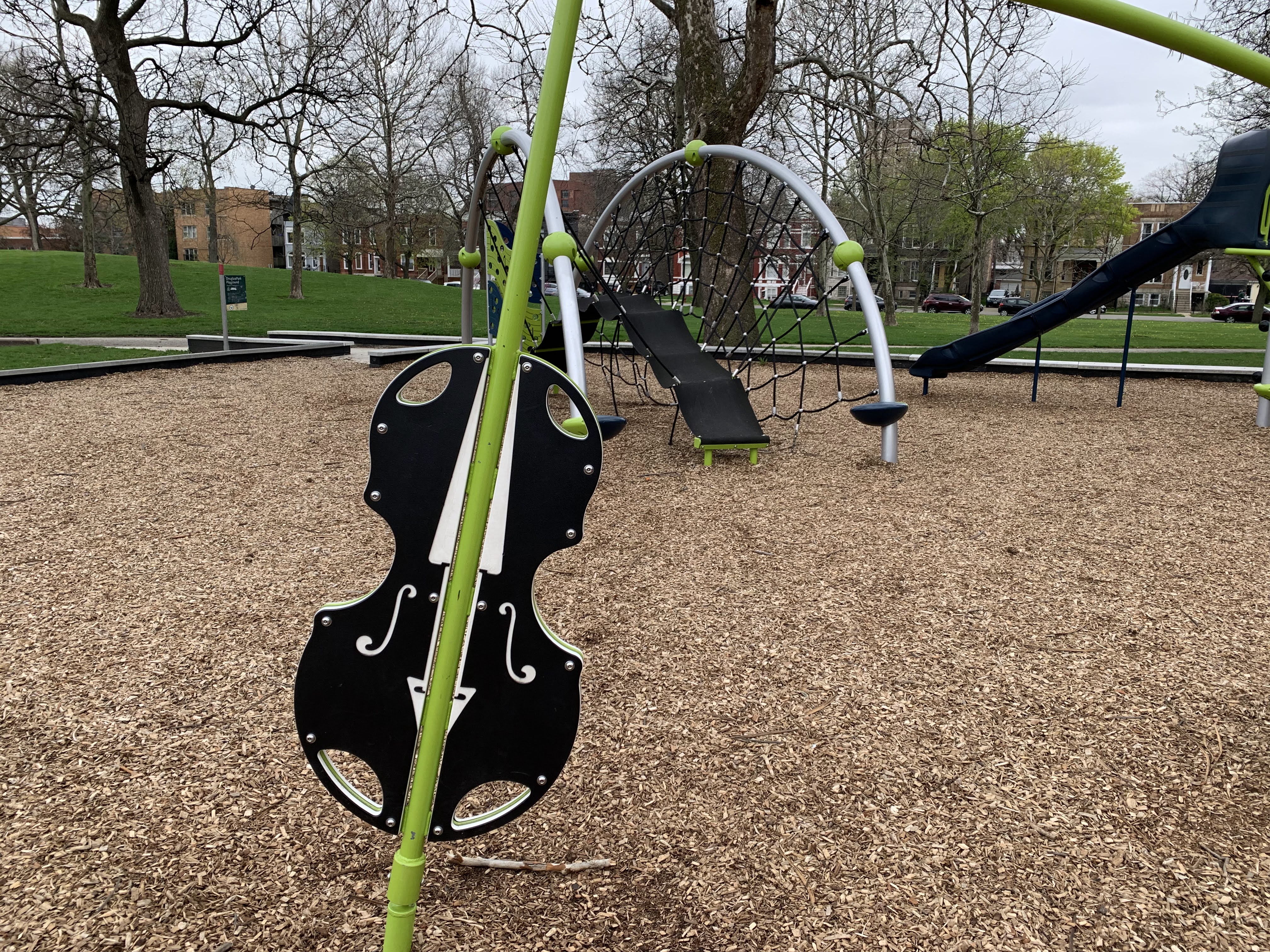 This element is strangely not a musical instrument but instead a spinning element that looks like a cello.