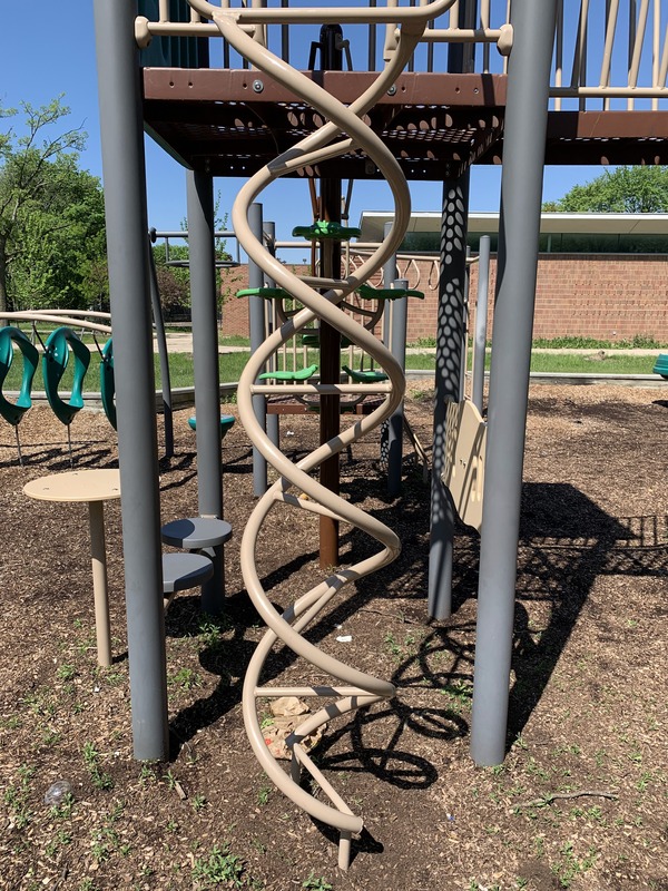 - A climbing element created by two vertical poles that spiral upwards and straight metal rungs connecting them.