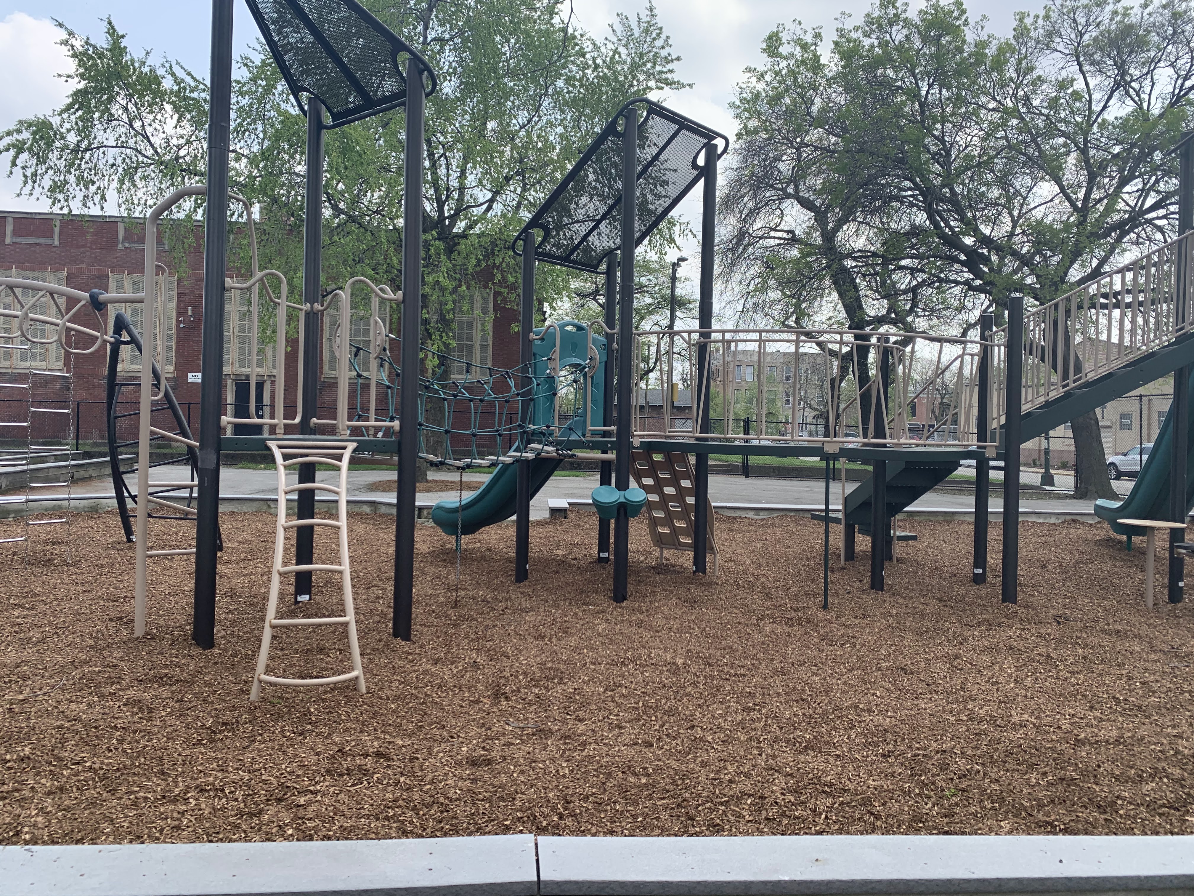 - A bridge element connecting two platforms created by a rope net bridge with small, separate planks along the bottom.