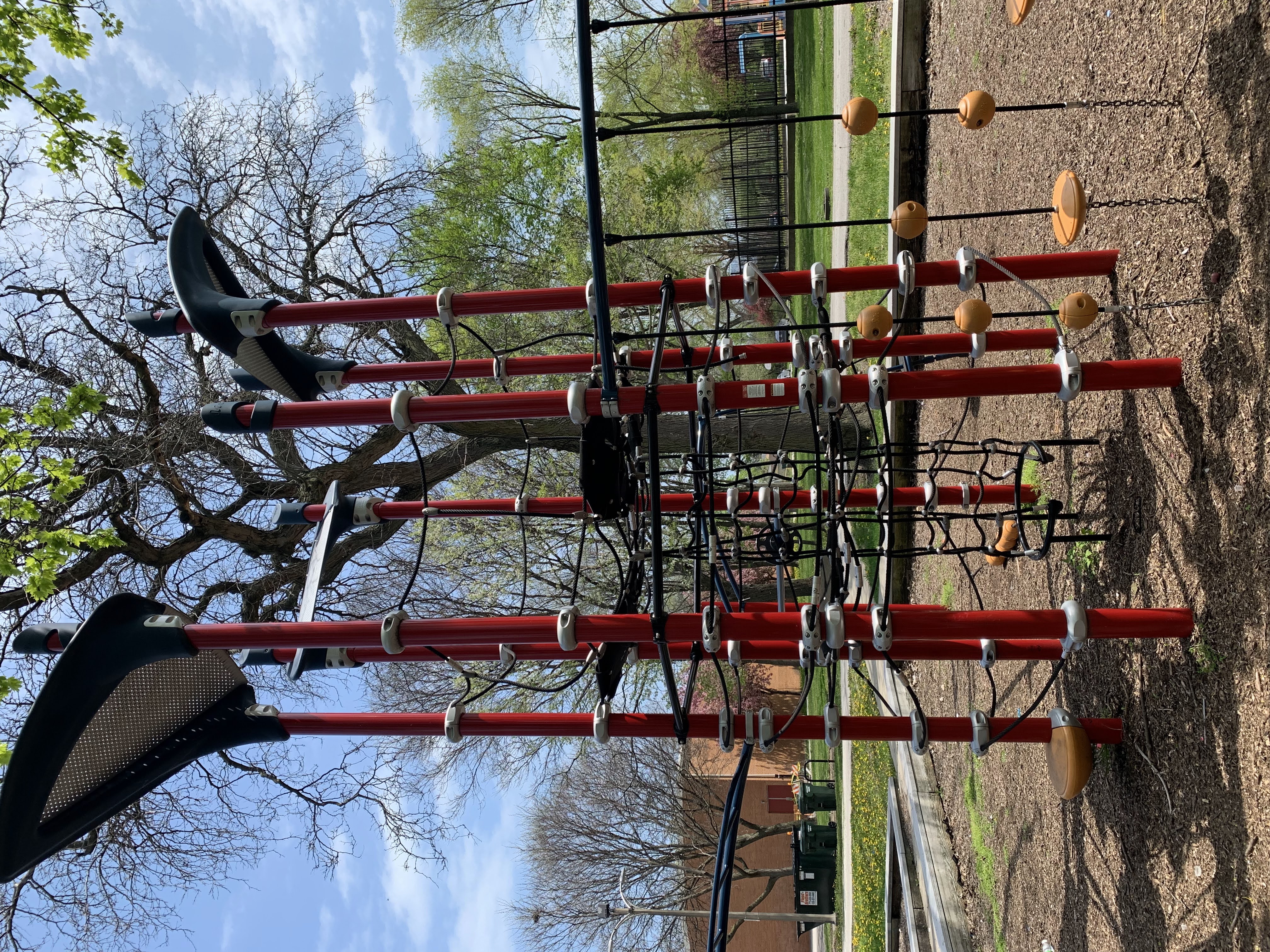 - A large rope net climbing element with seven vertical columns with a central rope net tube ladder, a mess of ropes connecting the columns to the tube ladder and a few black belt seats.
