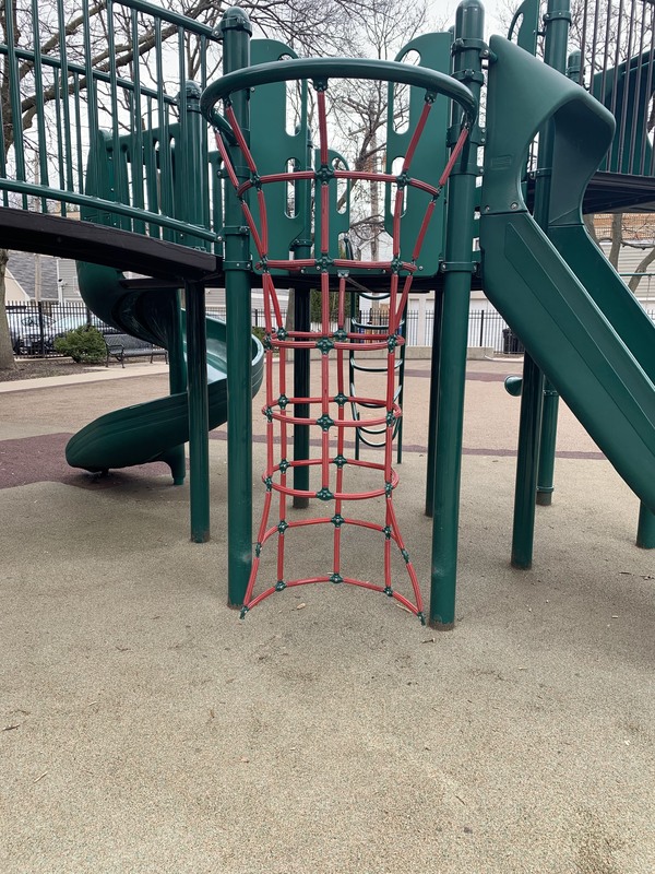 A climbing structure that looks like a climbing net twisted 90 degrees so that the horizontal ropes become vertical near the platform and the vertical ropes transition from vertical to horizontal.