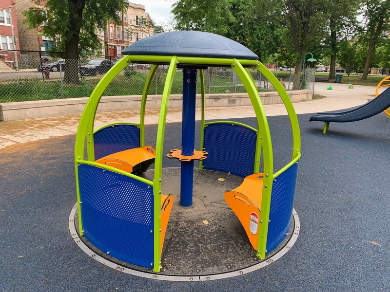The playground at the Brighton Park Community Campus is a one-of-a-kind playground and one of the best in Chicago. This site opened in 2023 and features new playground equipment, a water spray feature, and a nature play area.