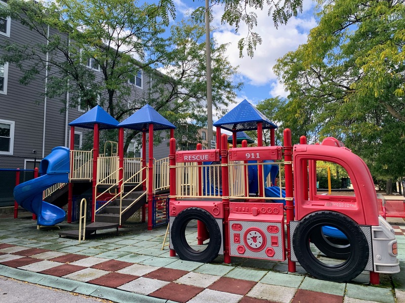 This large, standalone climbing feature is generally dome shaped with several internal elements (including a black belt bridge and hanging steps). Great element.