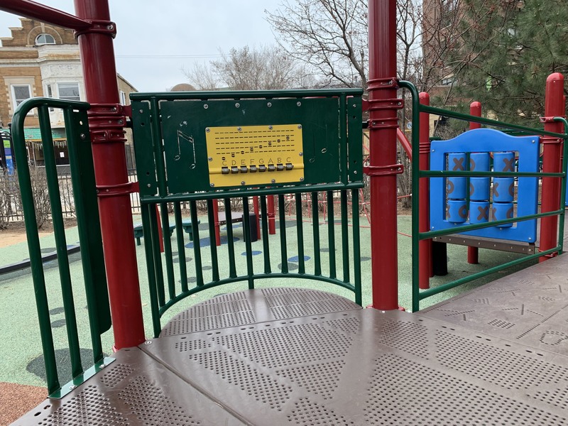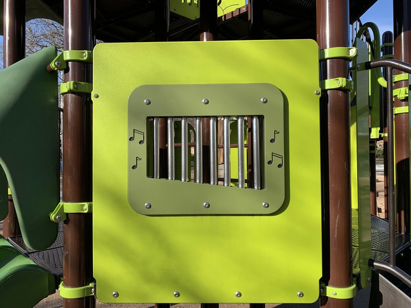 A musical panel consisting of moveable music notes that can strike spherical chimes.