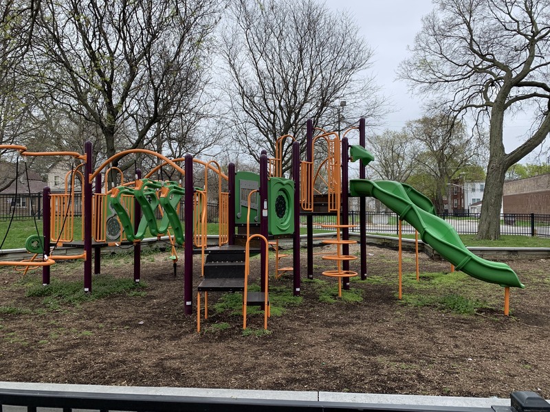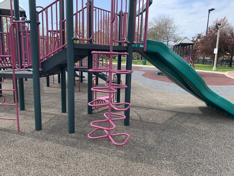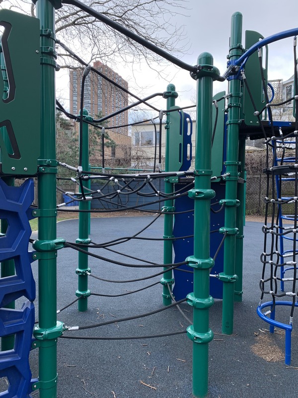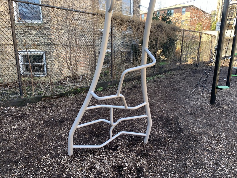This is a climbing/ladder element that arches from the ground to the play structure with a smooth and gentle curve that, under that beam but on the same plane, has some jagged geometric shapes that make this element climbable.