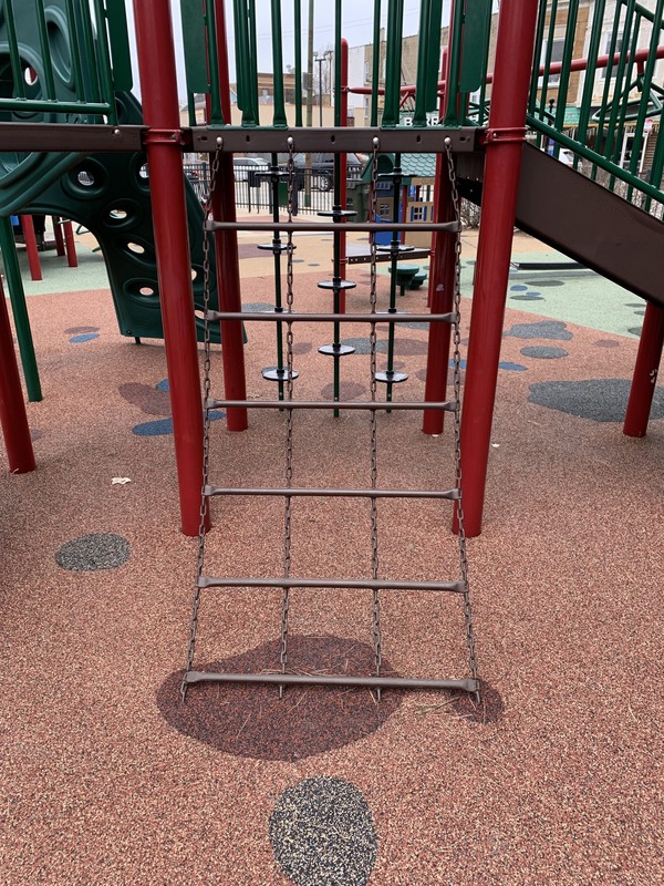 A ladder made of chains and horizontal metal rungs connecting the ground to a platform. Sometimes there are two chains and long metal rungs; other times four chains and three sections of rungs that are slightly offset.
