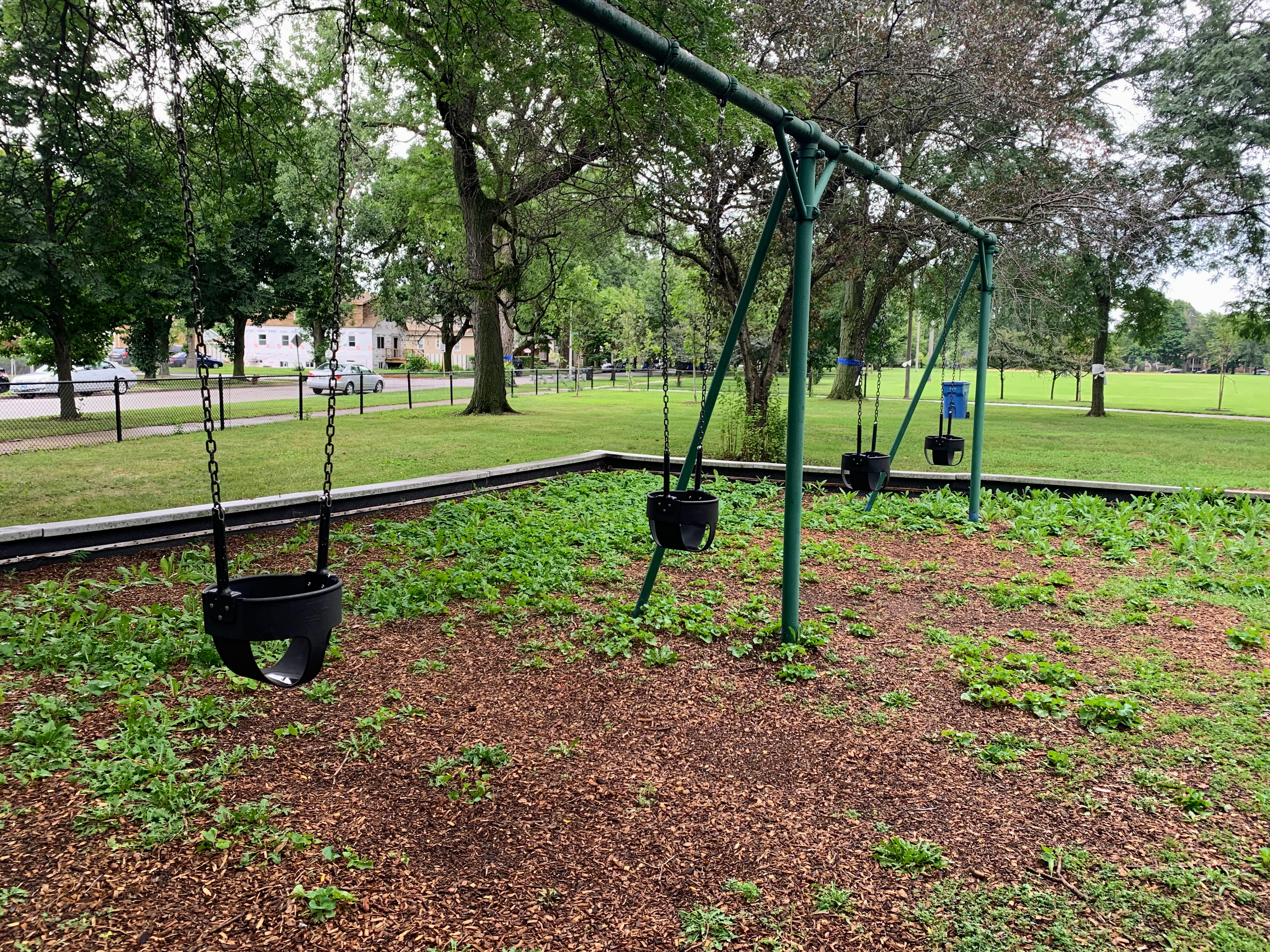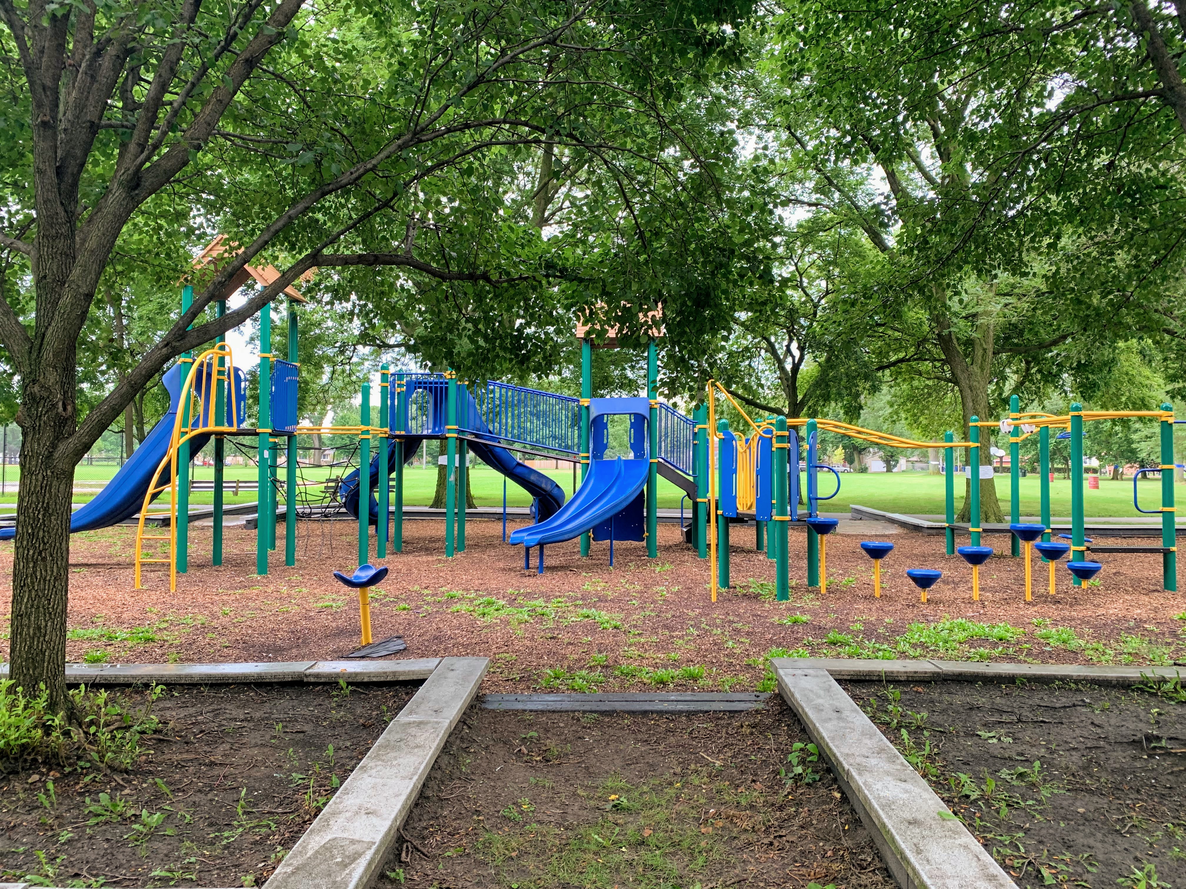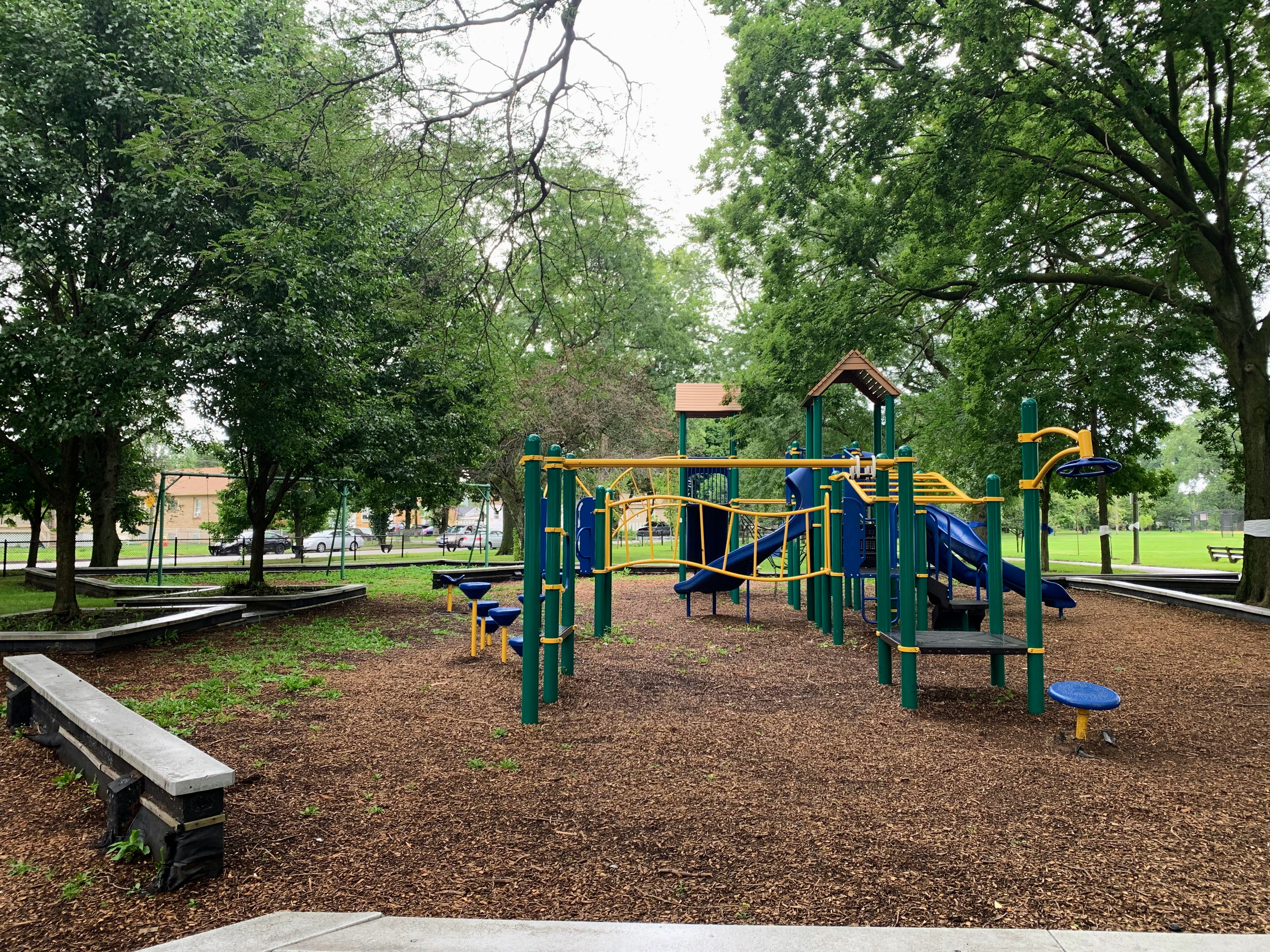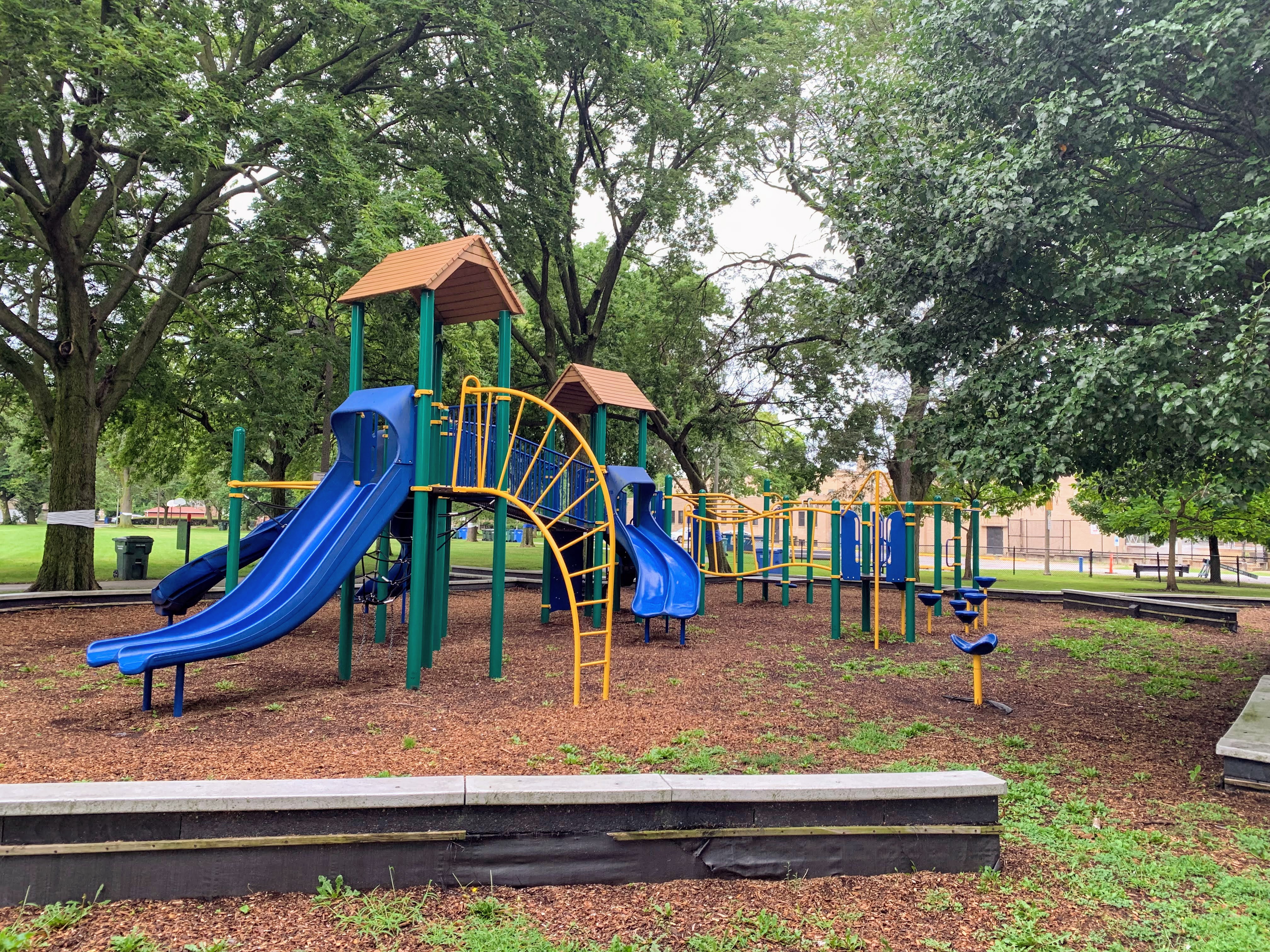 - The playground in Ada Park is located in the northwest corner of the park and features a large play structure suitable for older children. There are several large slides and challenging overhead elements as well as a few climbing and traversing features. There are two sets of swings with the standard Chicago Park options (toddler, adaptive, and belt seat). There is a water spray feature nearby - but it is integrated with the pool and not the playground. The play area opens to the park but is fenced from the street. There are benches and a picnic table and the wood chip covered play area is heavily shaded by large, mature trees. All in all, a solid playground.