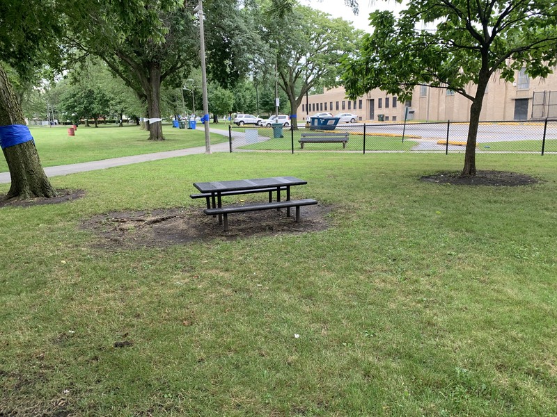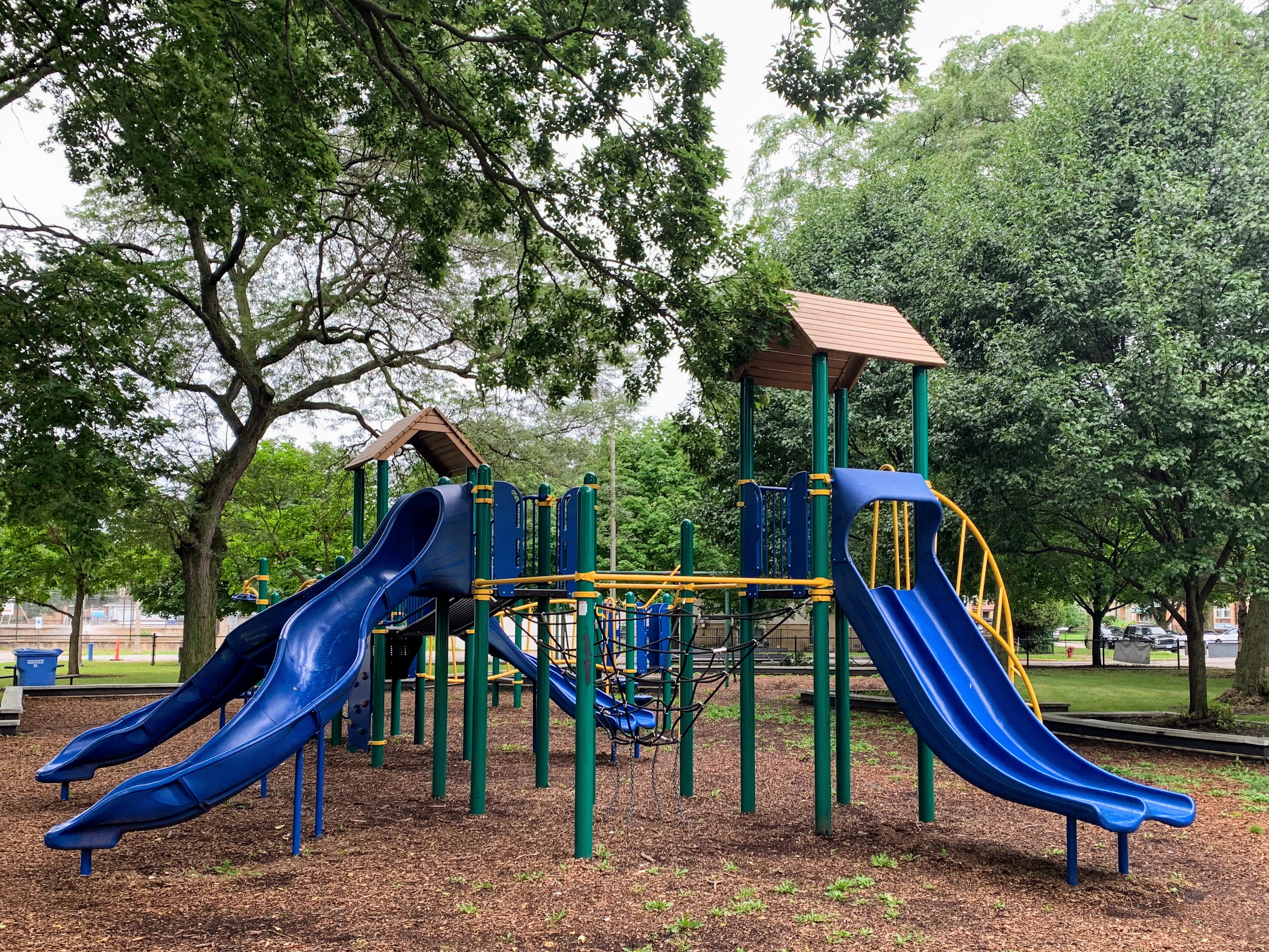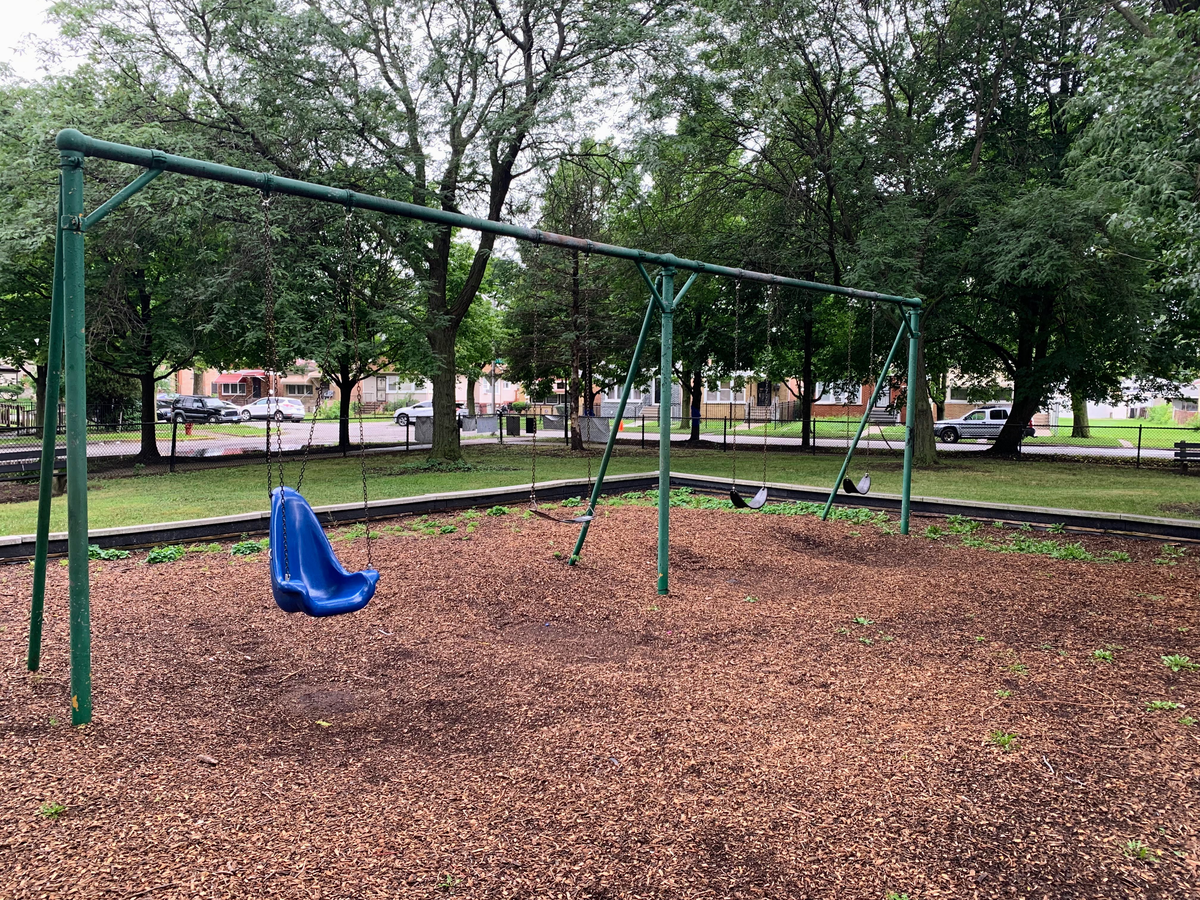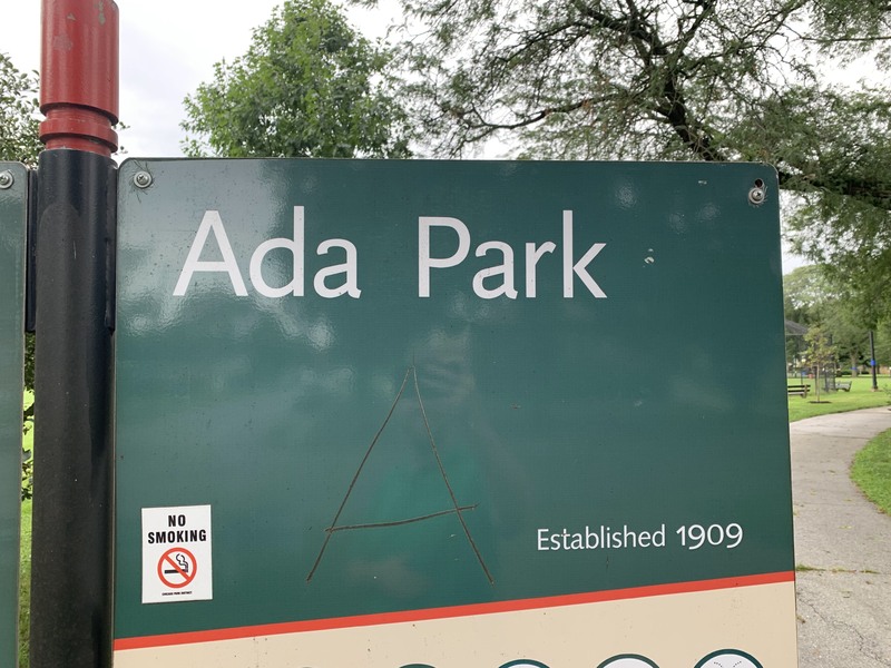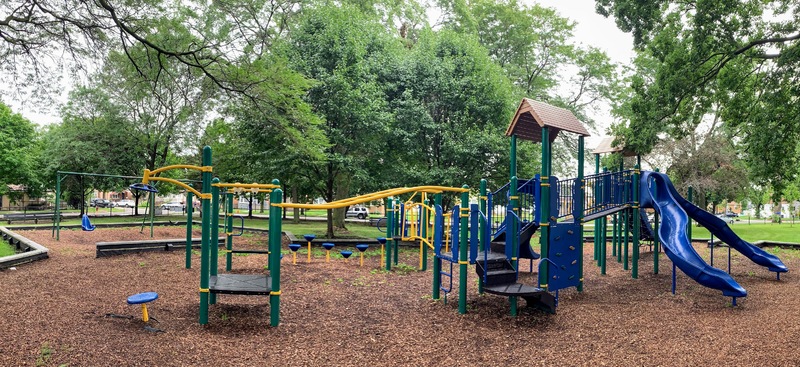 - The playground in Ada Park is located in the northwest corner of the park and features a large play structure suitable for older children. There are several large slides and challenging overhead elements as well as a few climbing and traversing features. There are two sets of swings with the standard Chicago Park options (toddler, adaptive, and belt seat). There is a water spray feature nearby - but it is integrated with the pool and not the playground. The play area opens to the park but is fenced from the street. There are benches and a picnic table and the wood chip covered play area is heavily shaded by large, mature trees. All in all, a solid playground.